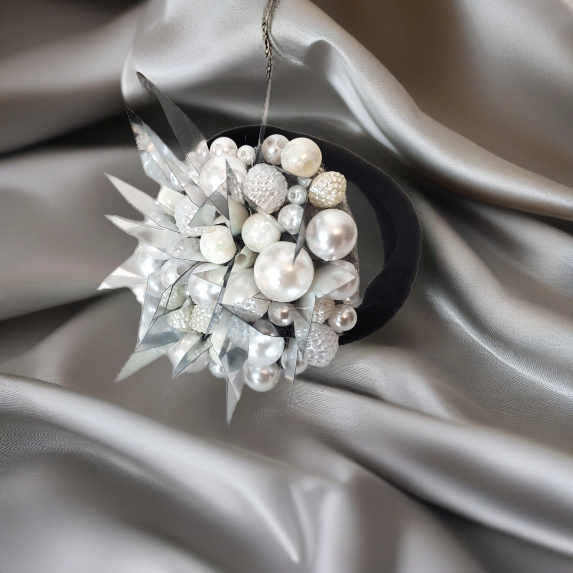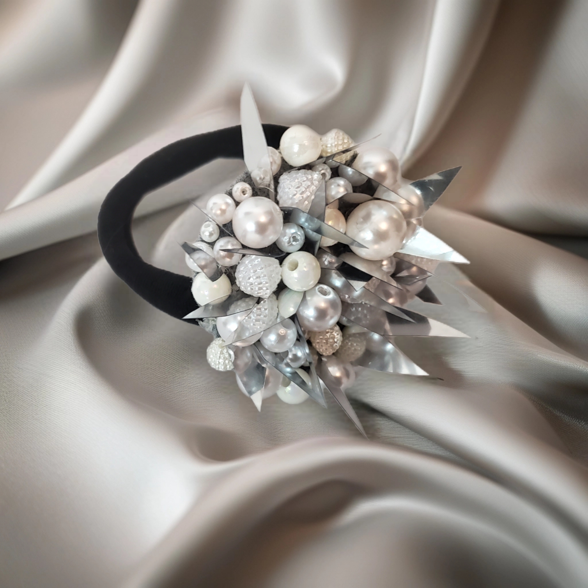 Pe aplicatie sunt cusute perle albe de diferite forme si marimi, si paiete argintii. Forma aplicatie este rotunda, ceea ce confera eleganta oricarei coafuri.