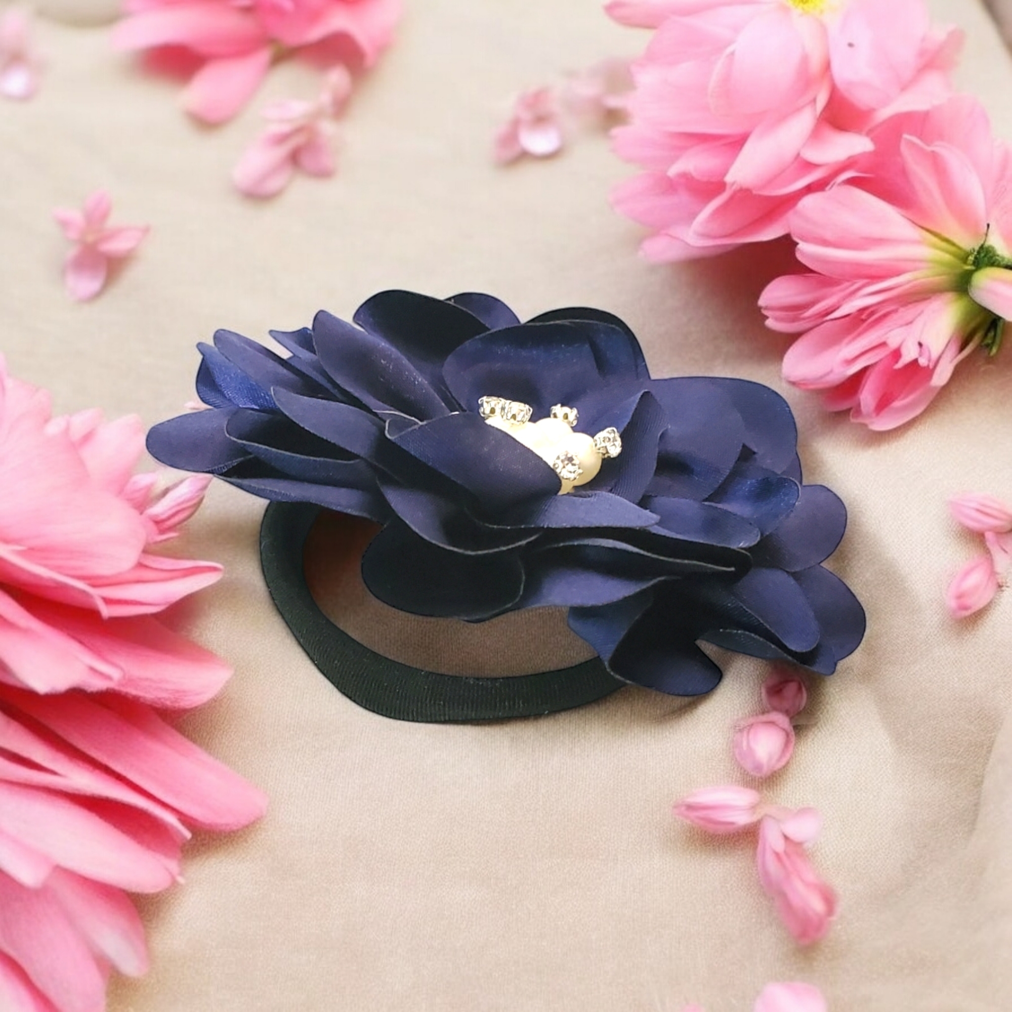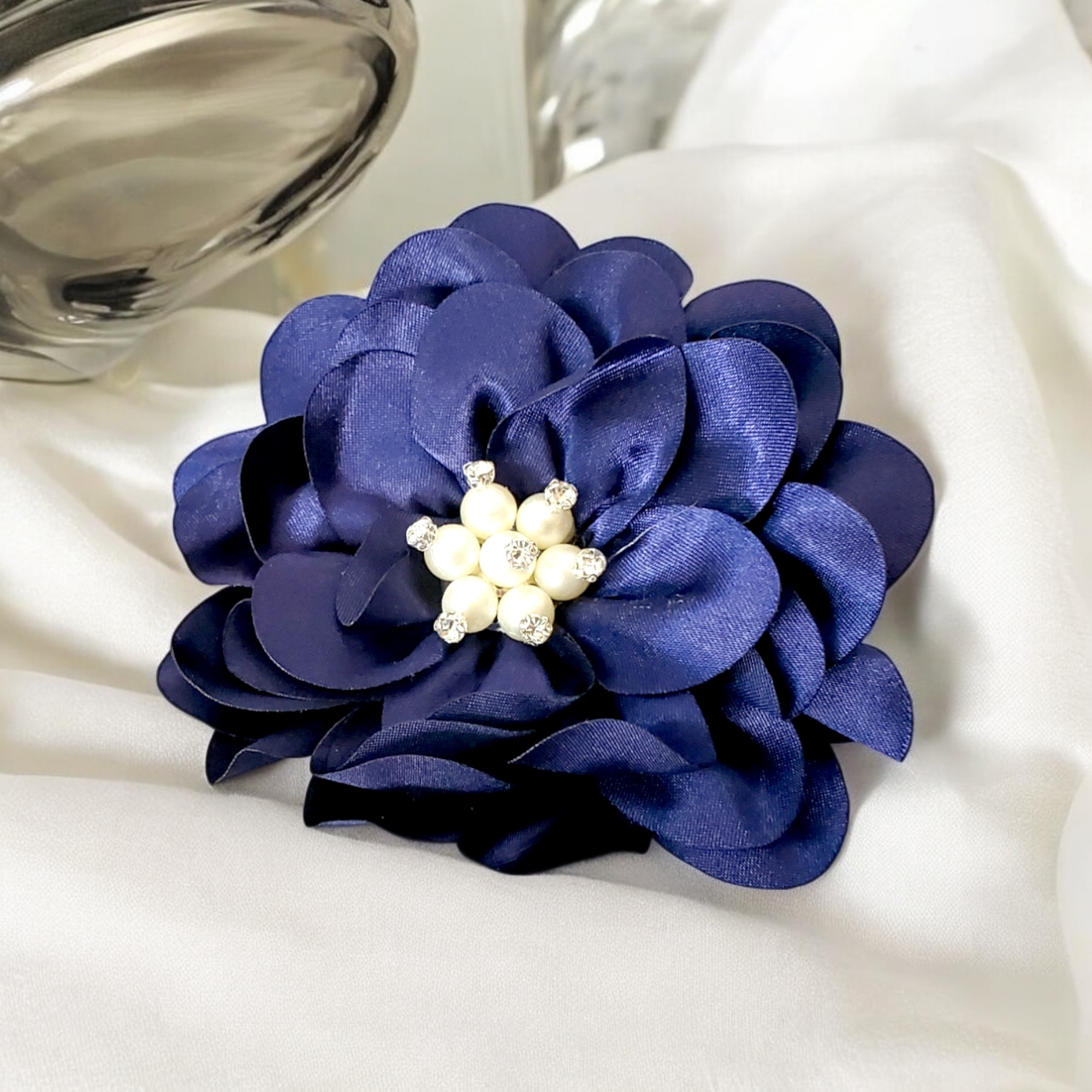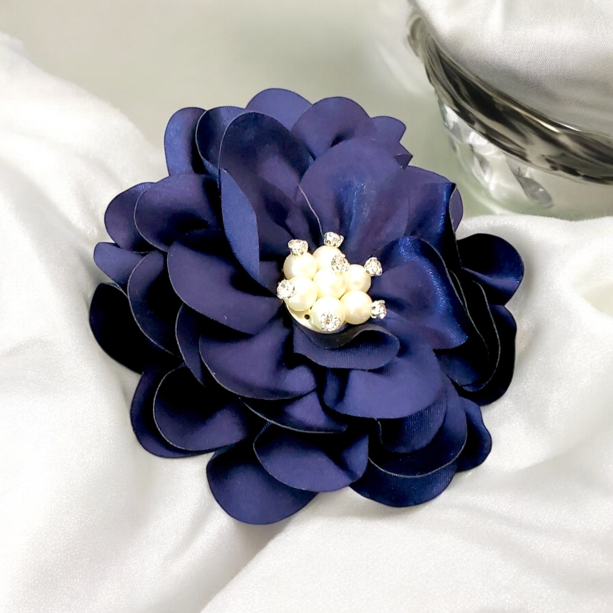 Accesoriul este confectionat dintr-o floare supradimensionata din matase albastru inchis pe elastic negru subtire buretos. Pe floare sunt cusute perle si strasuri albe. Floarea este eleganta, materialul are luciu.