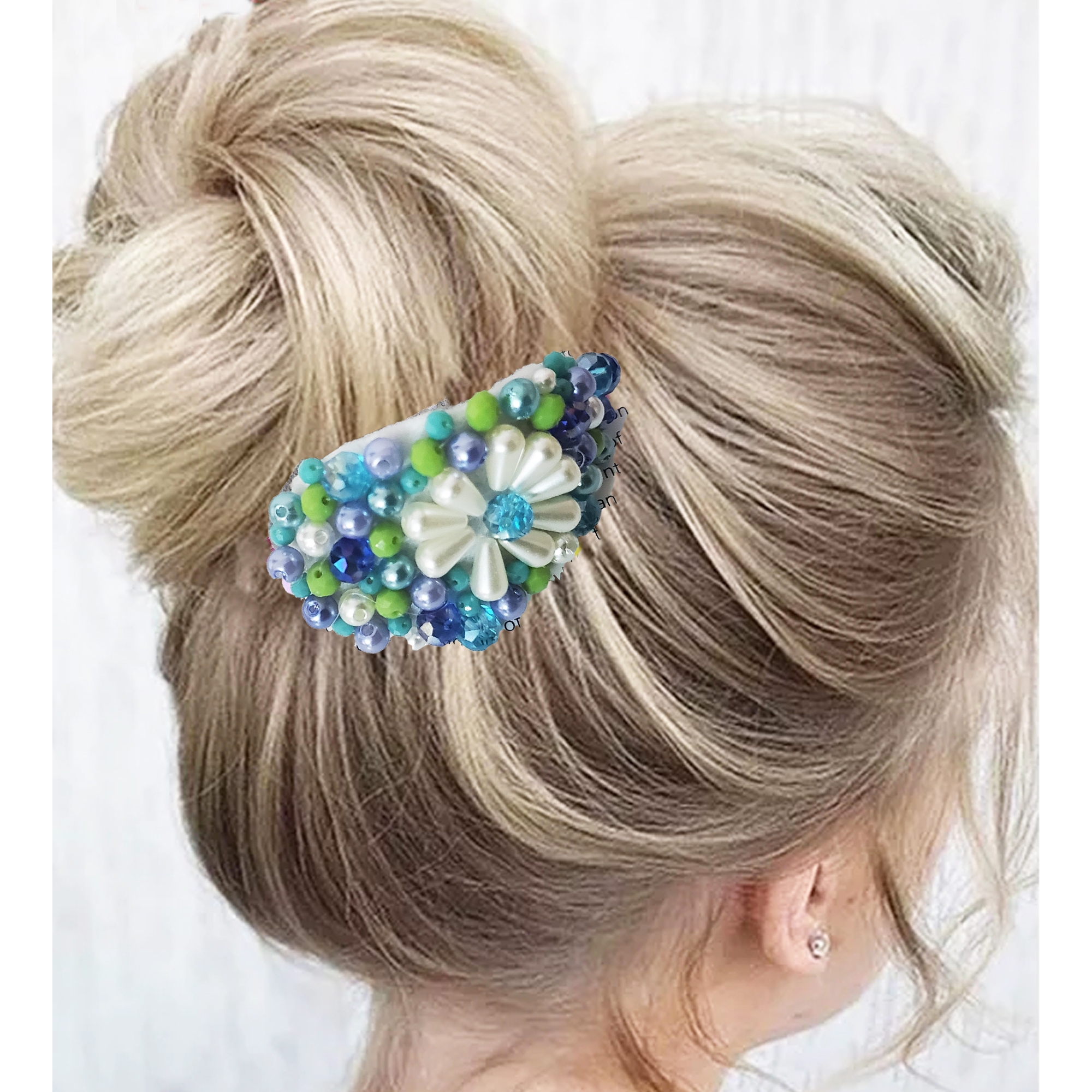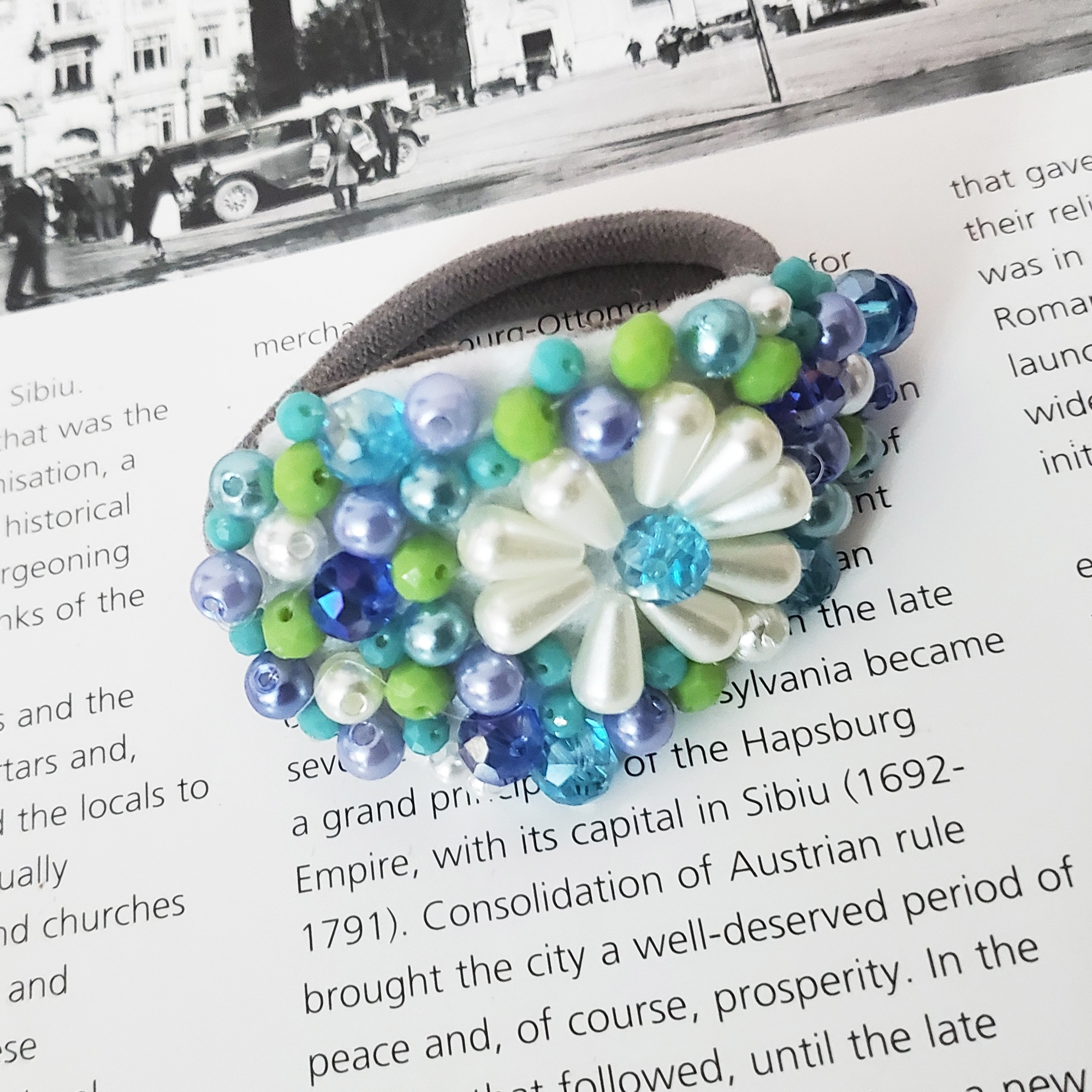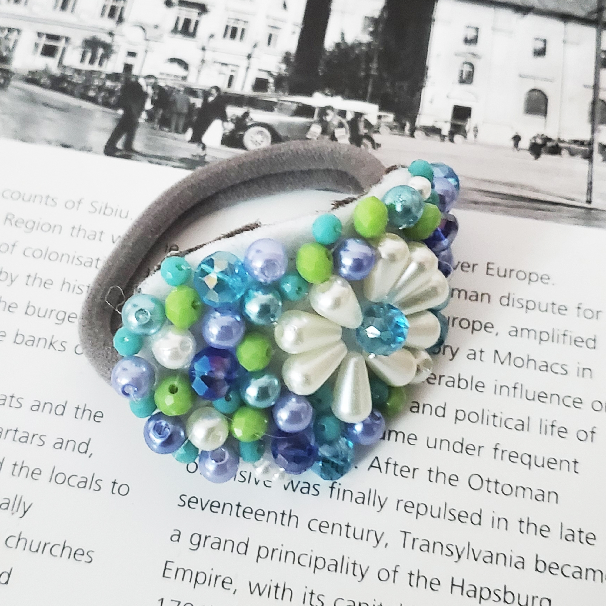 Accesoriu de par tip elastic cu perle ce poate fi purtat atat pentru a prinde o coada, cat si pentru a strange un coc. Produs handmade, cu toate elementele cusute.