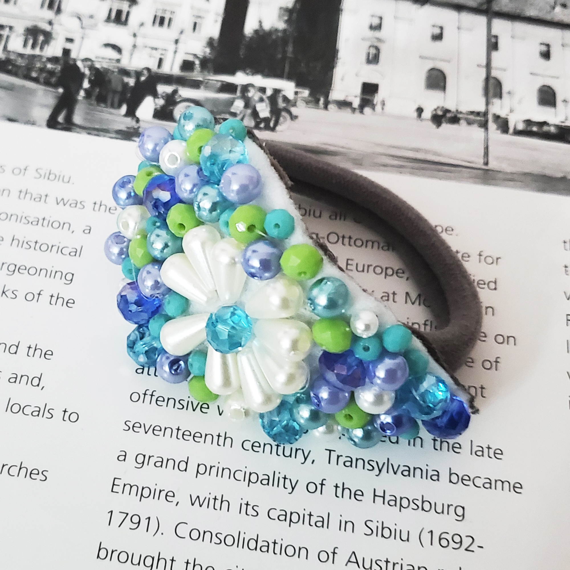 Aplicatia este cusuta pe elastic subtire buretos confectionata din perle si cristale de sticla in nuante de verde, albastru, alb.