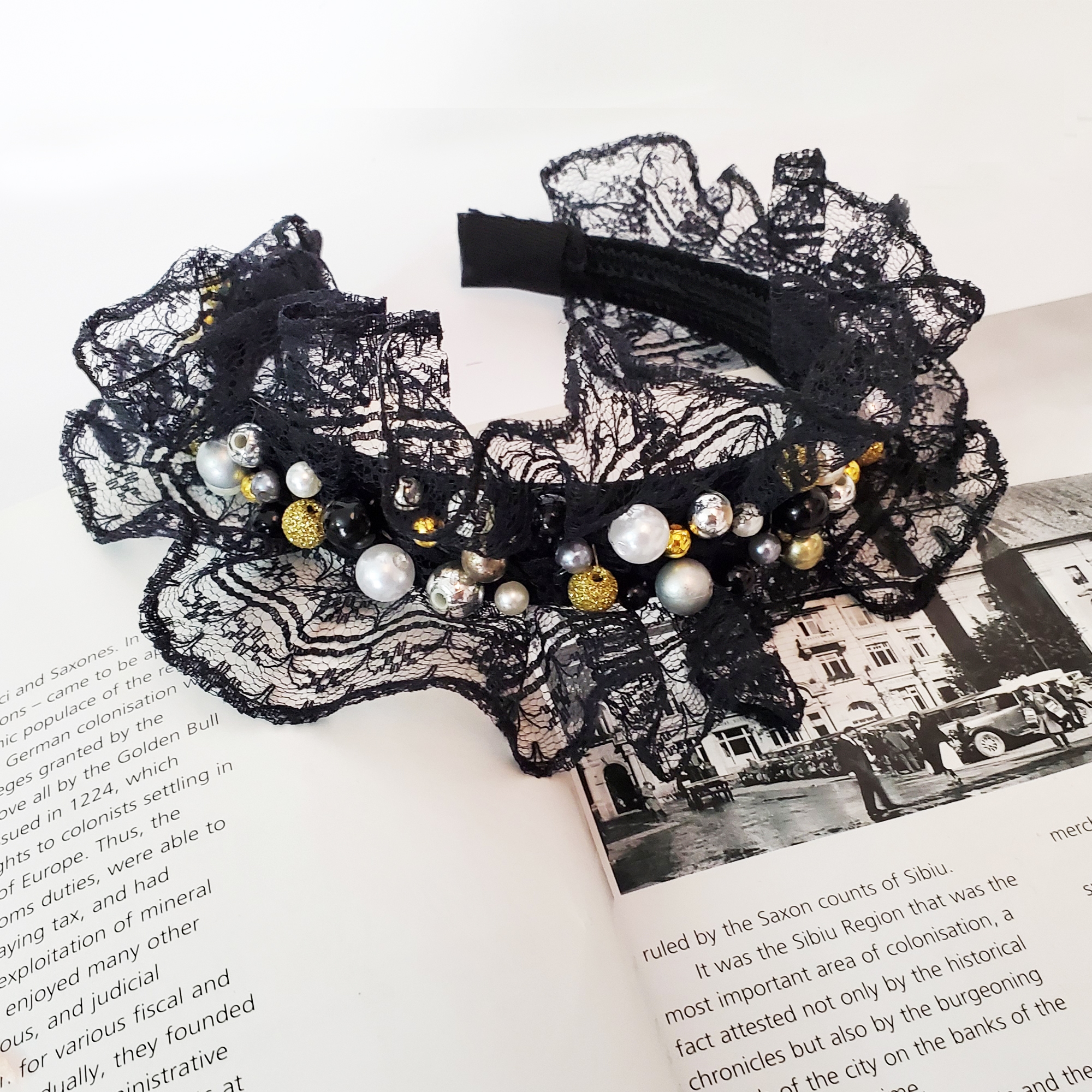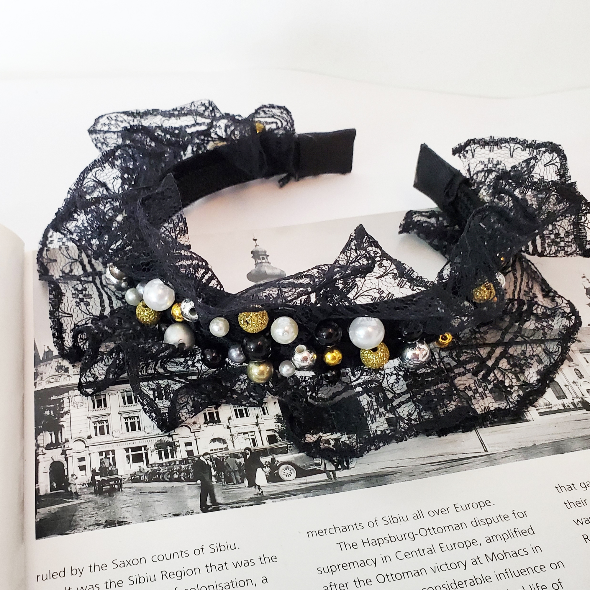 Descoperă eleganța rafinată cu bentita Black lace, îmbrăcată în dantelă neagră cu volane delicate și perle strălucitoare cusute manual. Un accesoriu comod, cu căptușeală la capete, ce adaugă farmec oricărei ținute și te face să te simți specială la fiecare purtare.