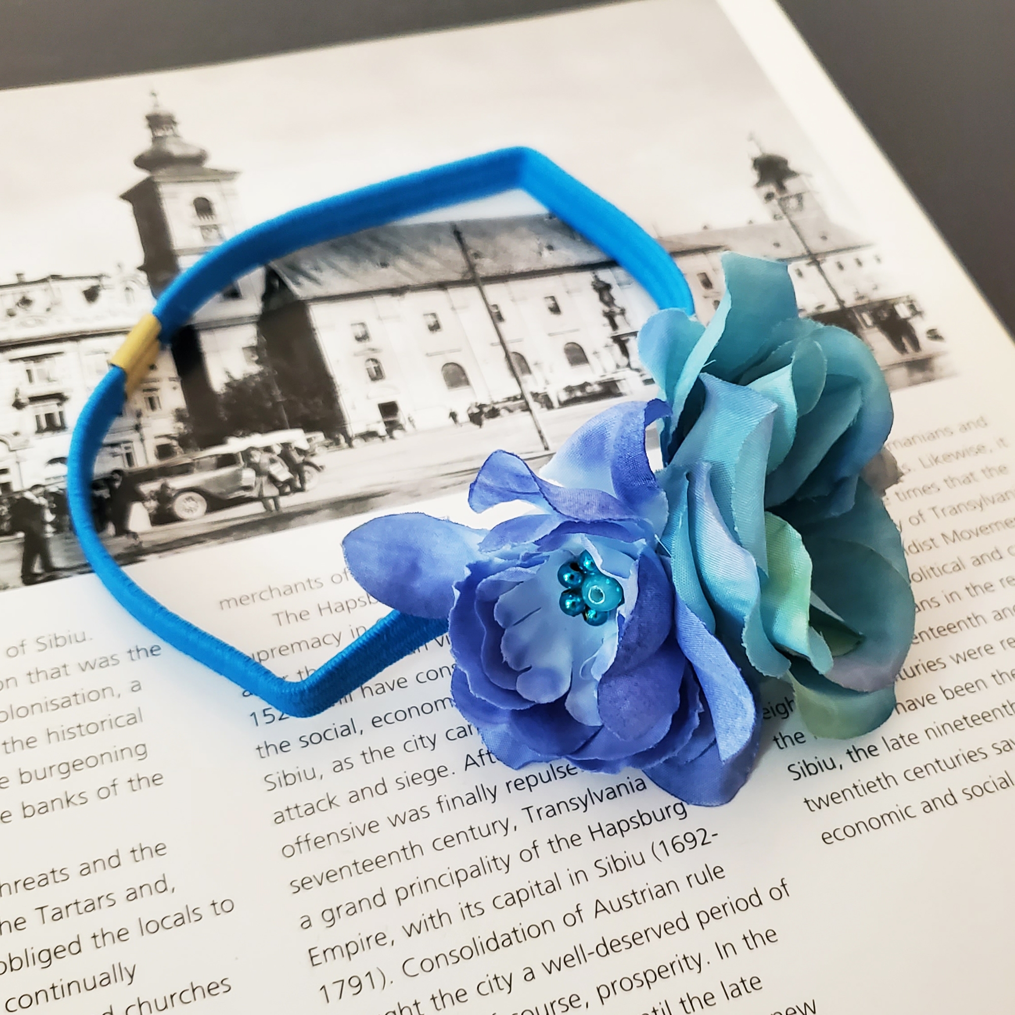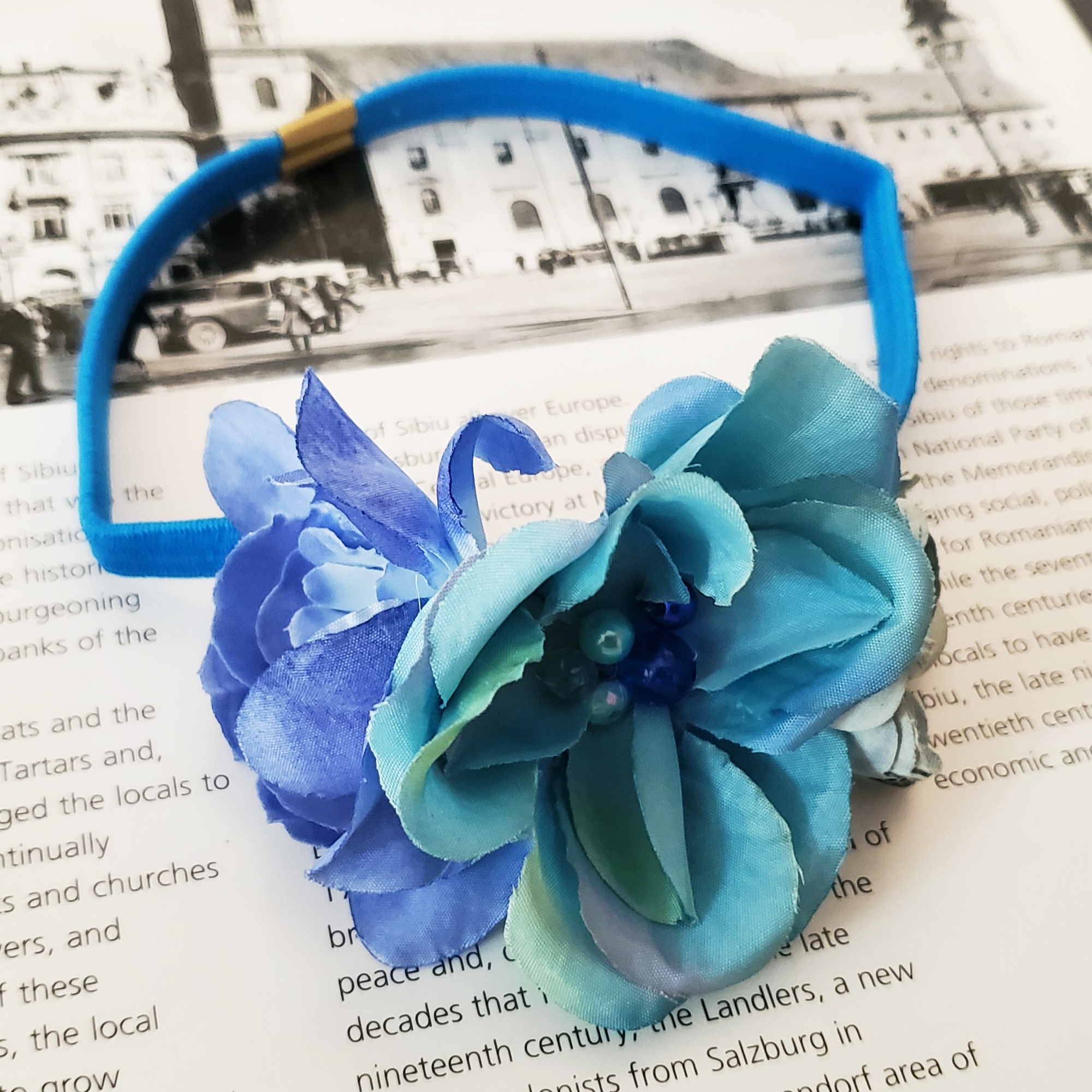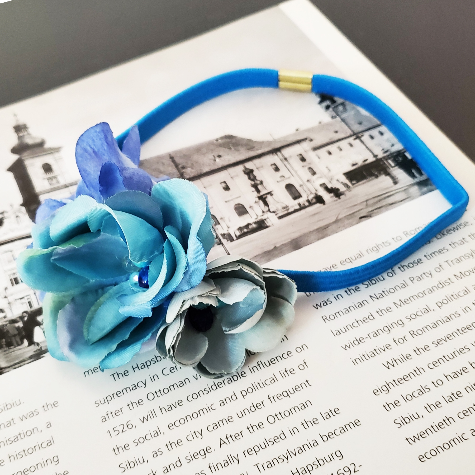 - Decorată manual cu flori textile în nuanțe de albastru, pentru un efect vizual fermecător