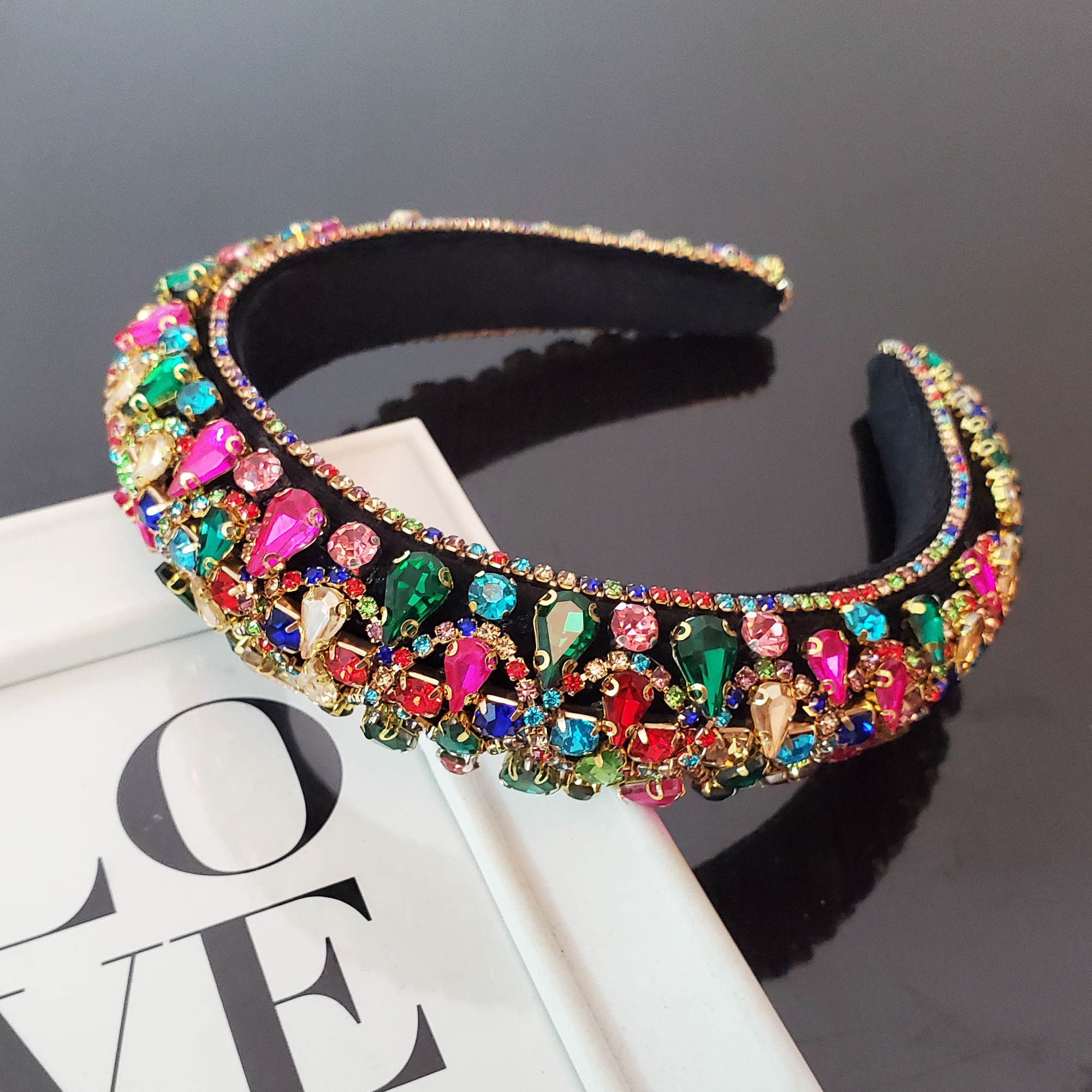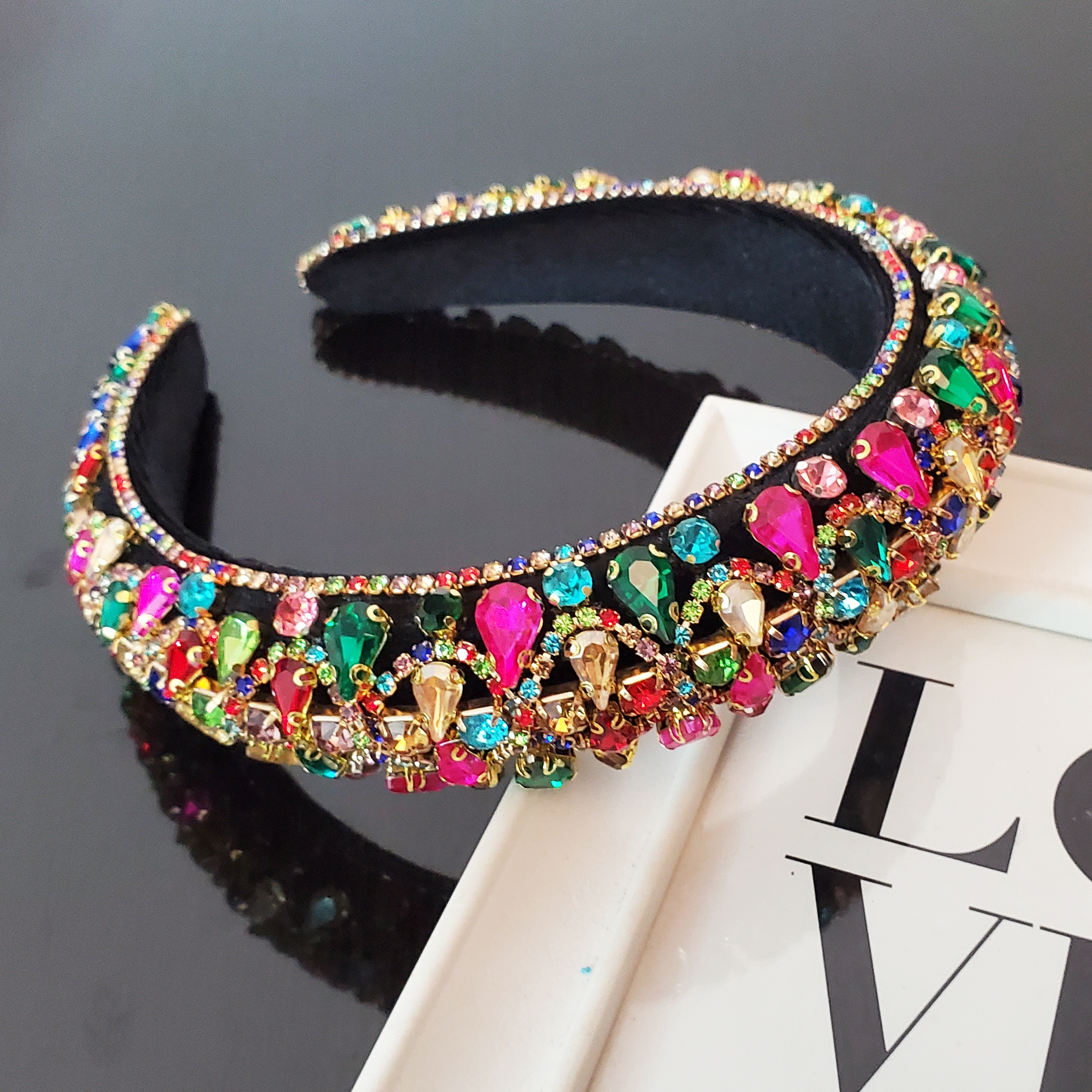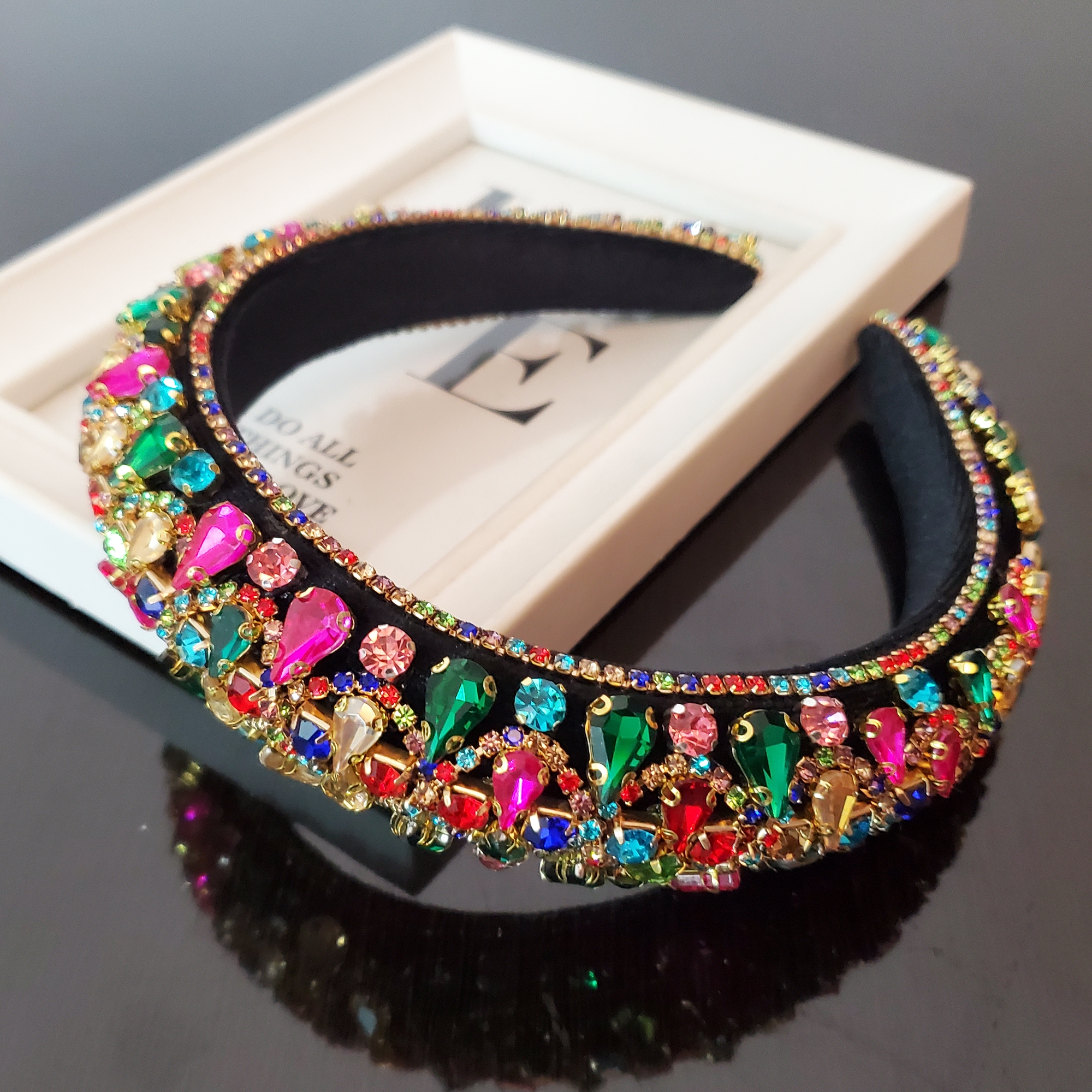 Bentita este realizata pe suport confortabil nu aluneca, nu necesita agrafe, imbracat in catifea neagra umpluta cu vatelina pentru volum si eleganta. In exterior sunt cusute cristale de sticla multicolore strasuri pe toata suprafata bentitei, pentru o continuitate perfecta. In interior bentita are captuseala de catifea care ajuta la stabilitate pe orice coafura. Datorita catifelei bentita se poate purta cu usurinta fara sa jeneze in spatele urechilor sau sa doara.