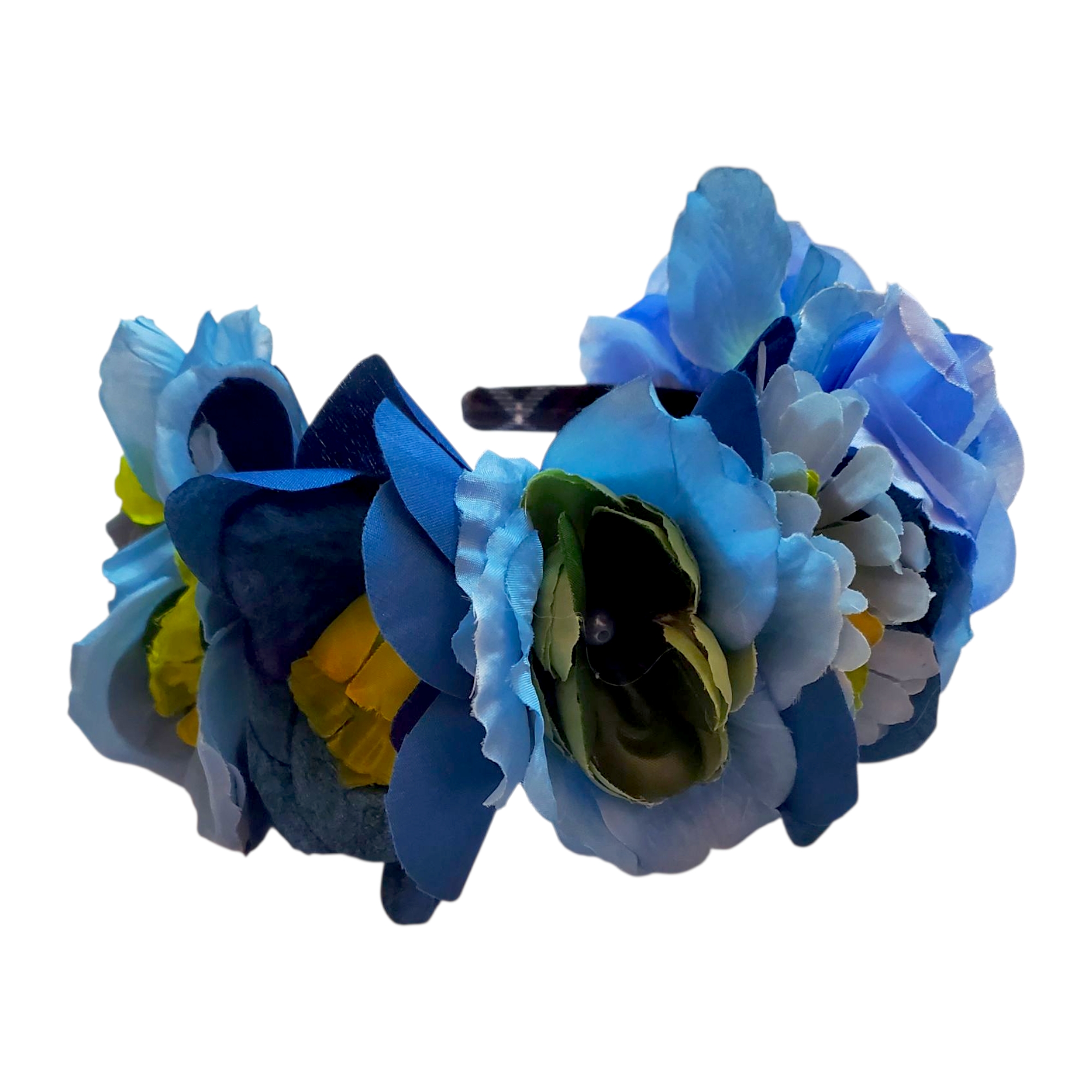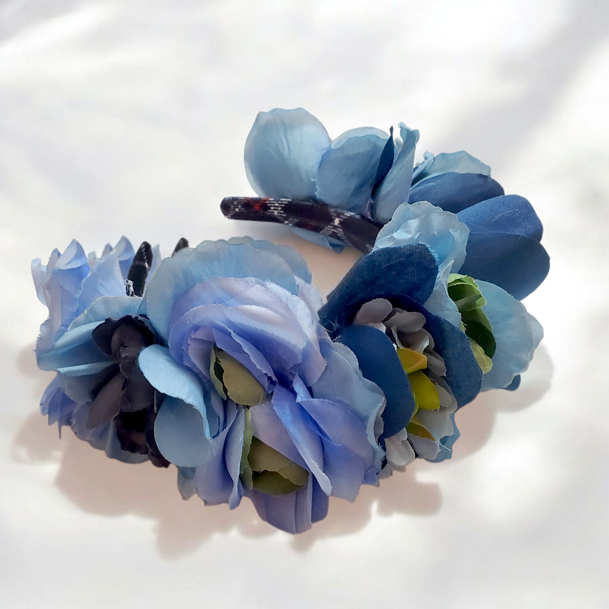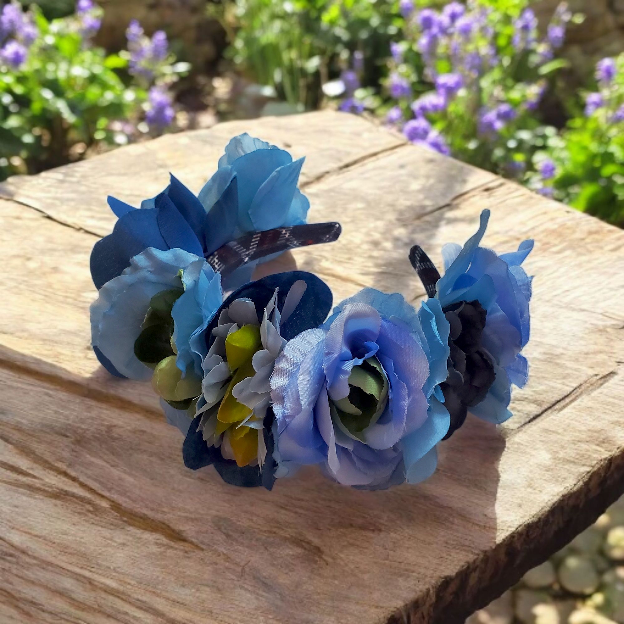 Bentita este realizata pe suport confortabil imbracat in catifea, nu aluneca, nu necesita agrafe. Pe bentita sunt cusute flori textile in nuante de albastru si verde. In interior bentita este captusita. Datorita catifelei bentita se poate purta cu usurinta fara sa jeneze in spatele urechilor sau sa doara.