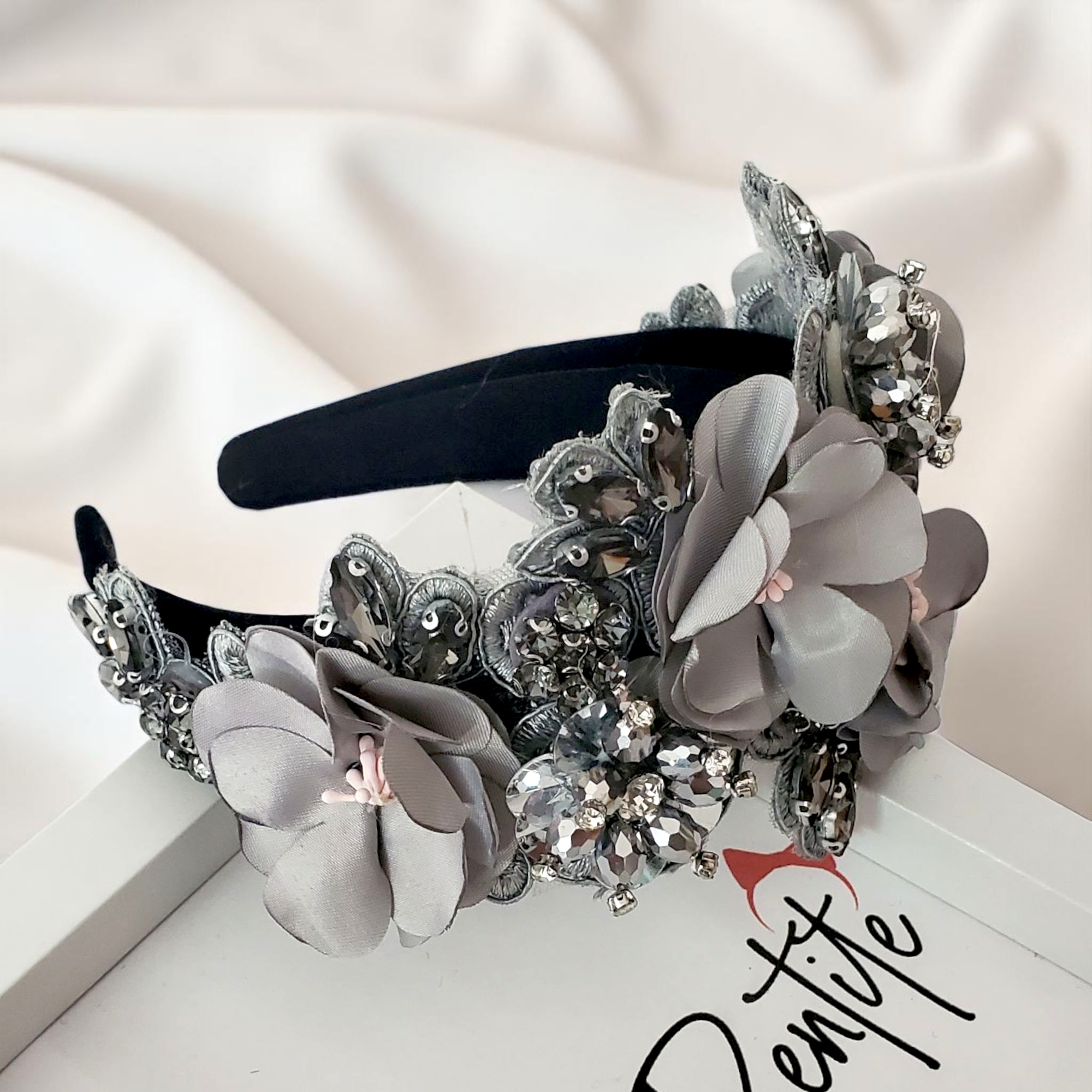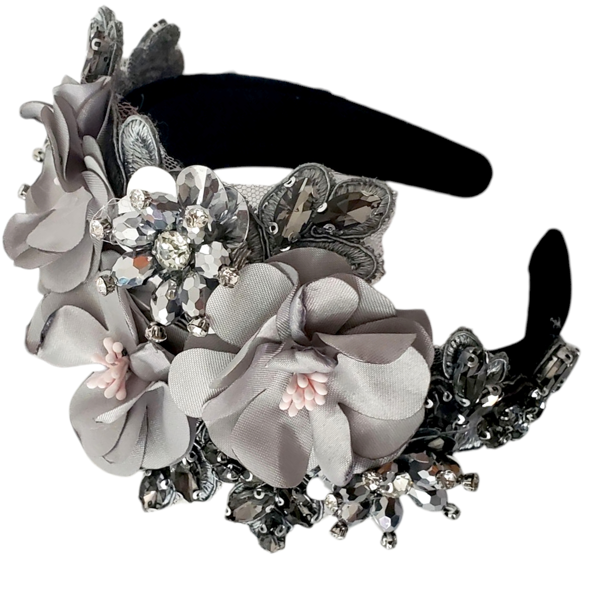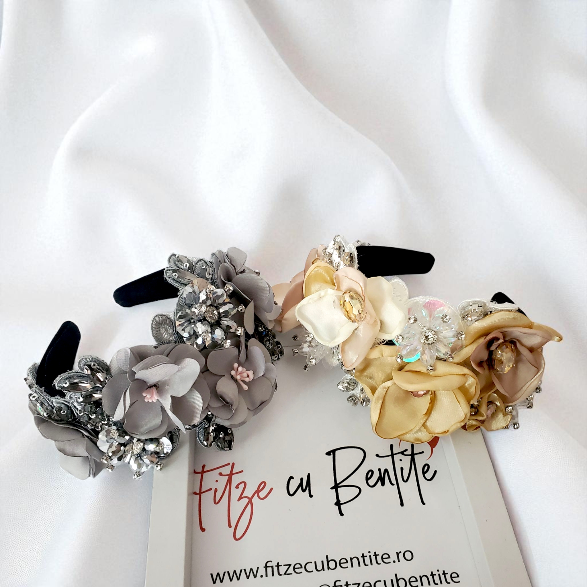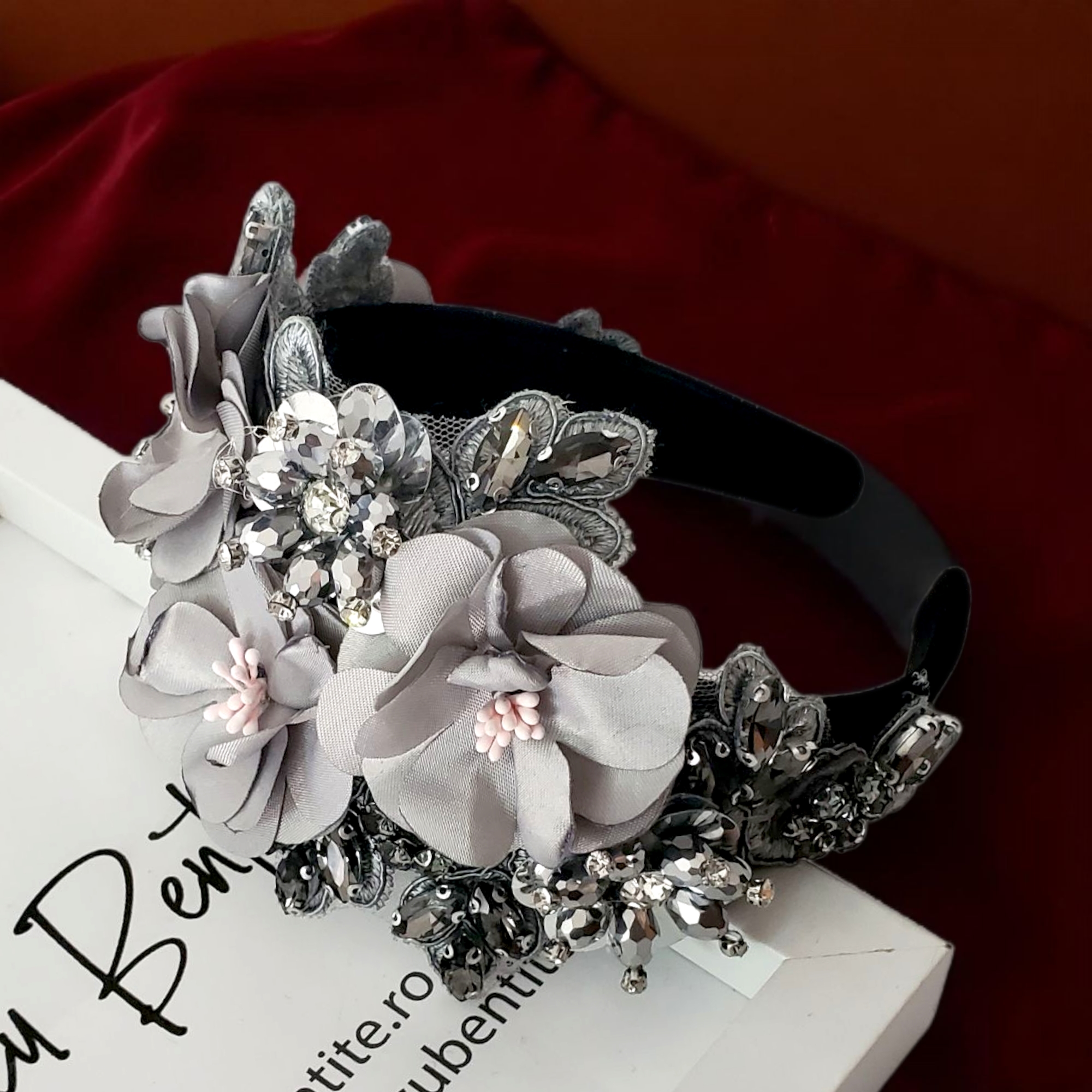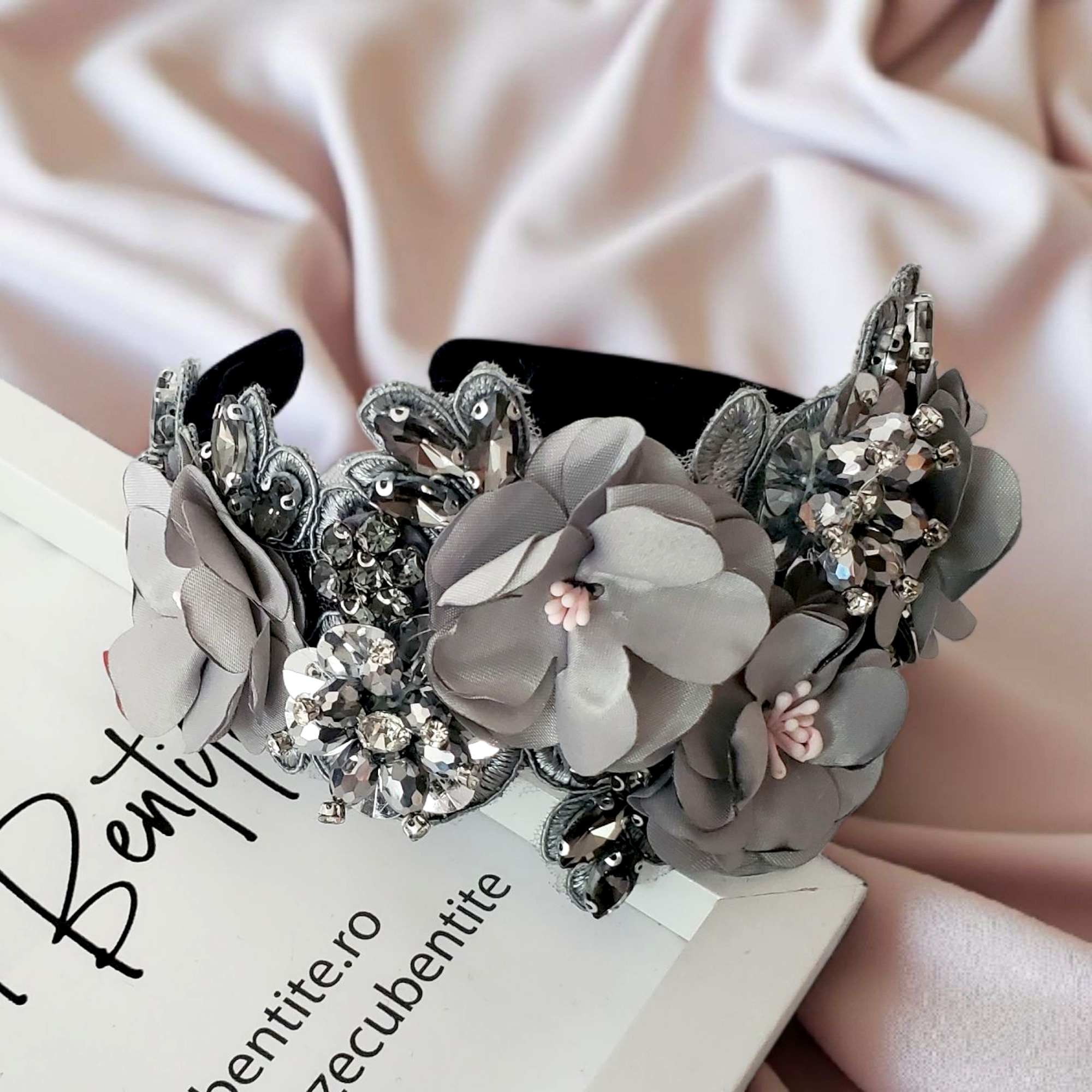 Bentita este construita pe suport confortabil din catifea. Pe suport este aplicata o dantela cu forme florale. Pe dantela sunt cusute flori din petale de matase gri, cristale de sticla si paiete cu reflexii dulci. Masura este universala pentru adult, 38 cm. Se livreaza in sac textil pentru bijuterii.