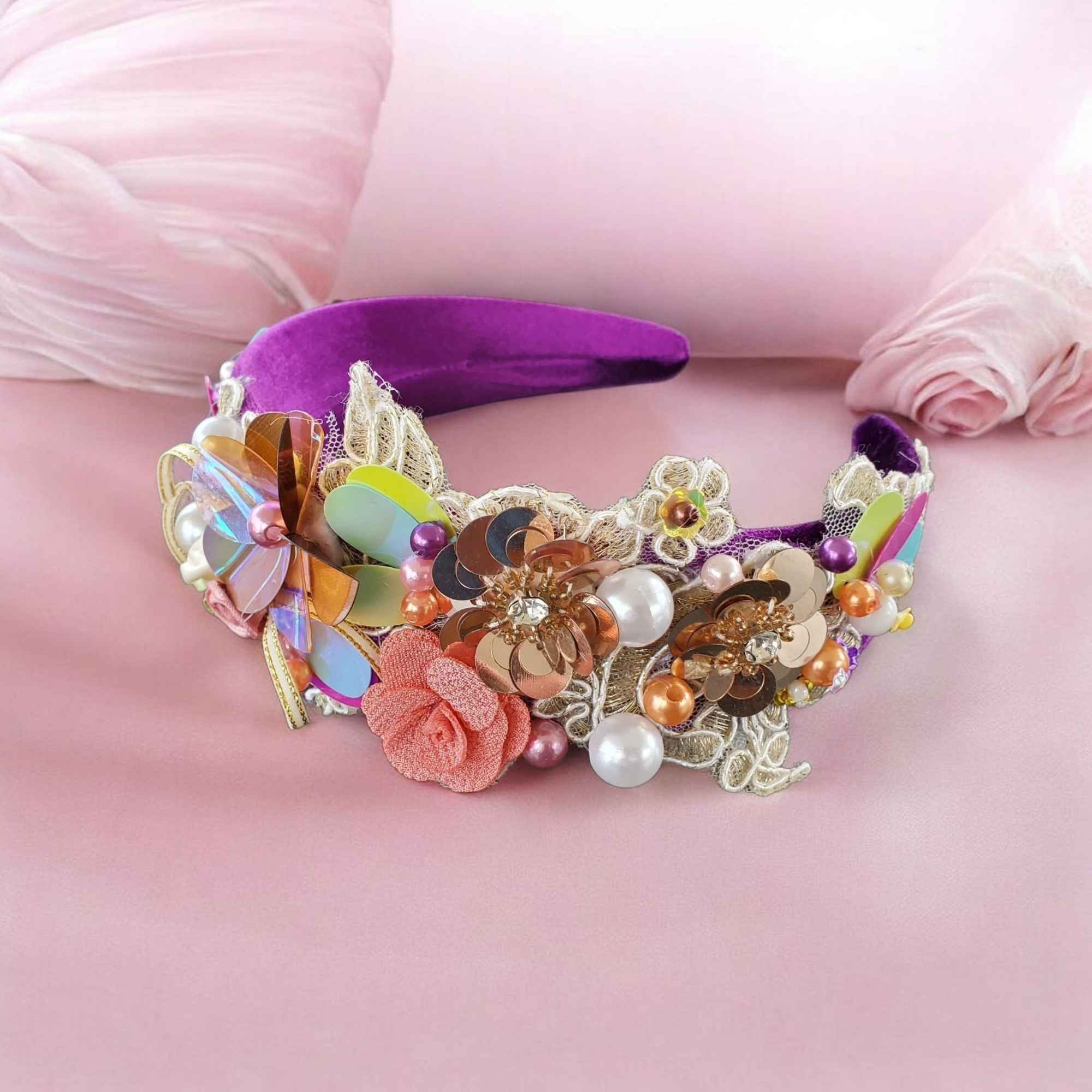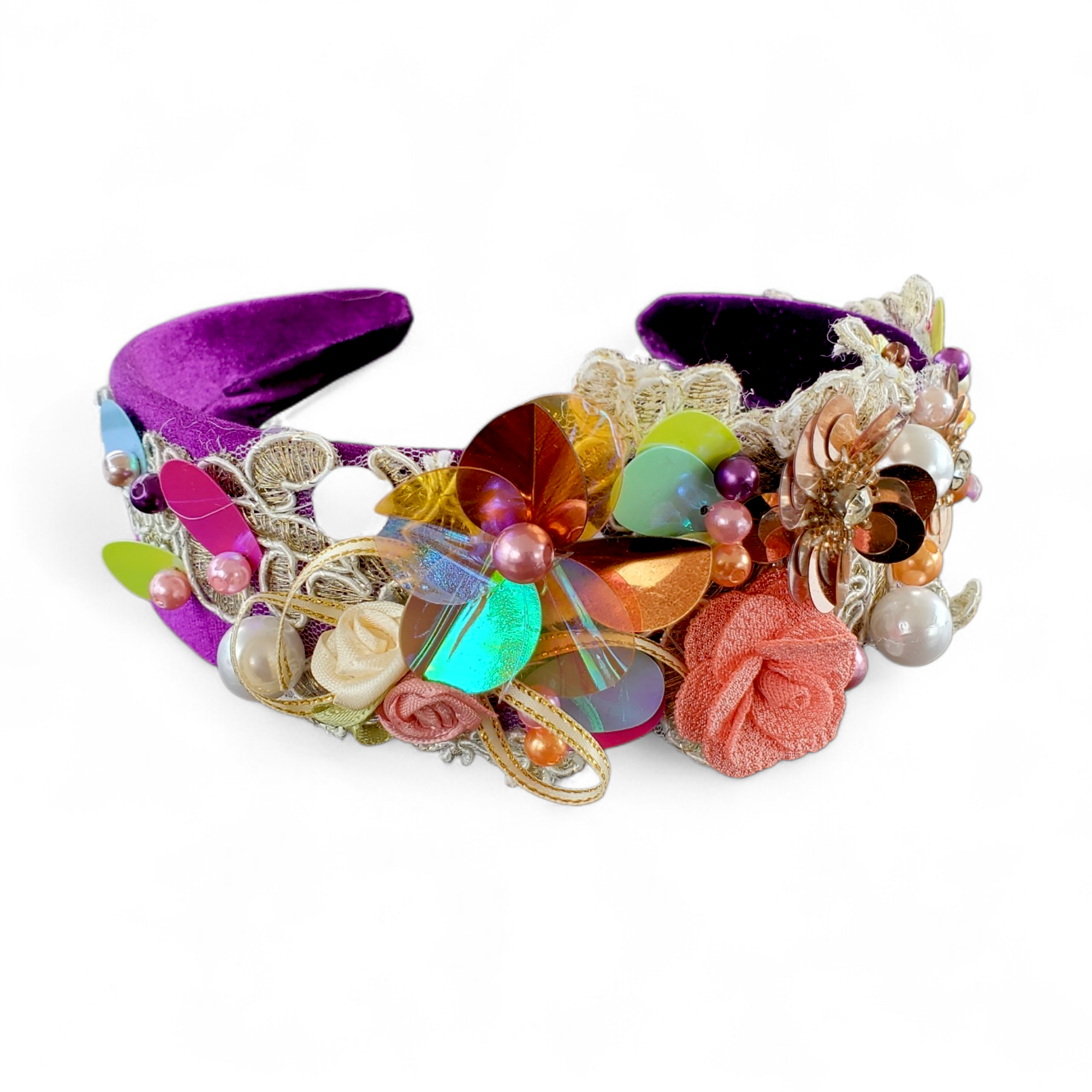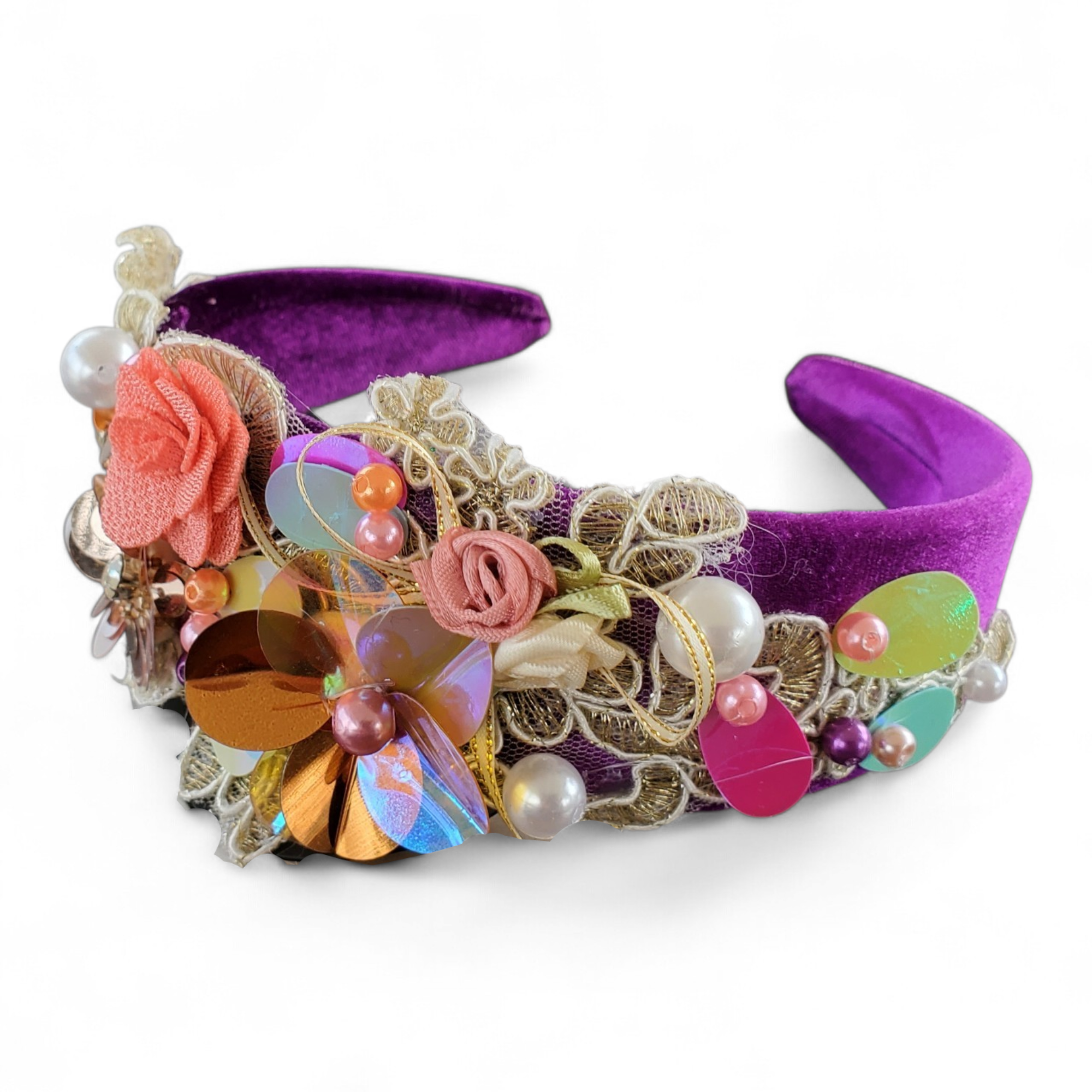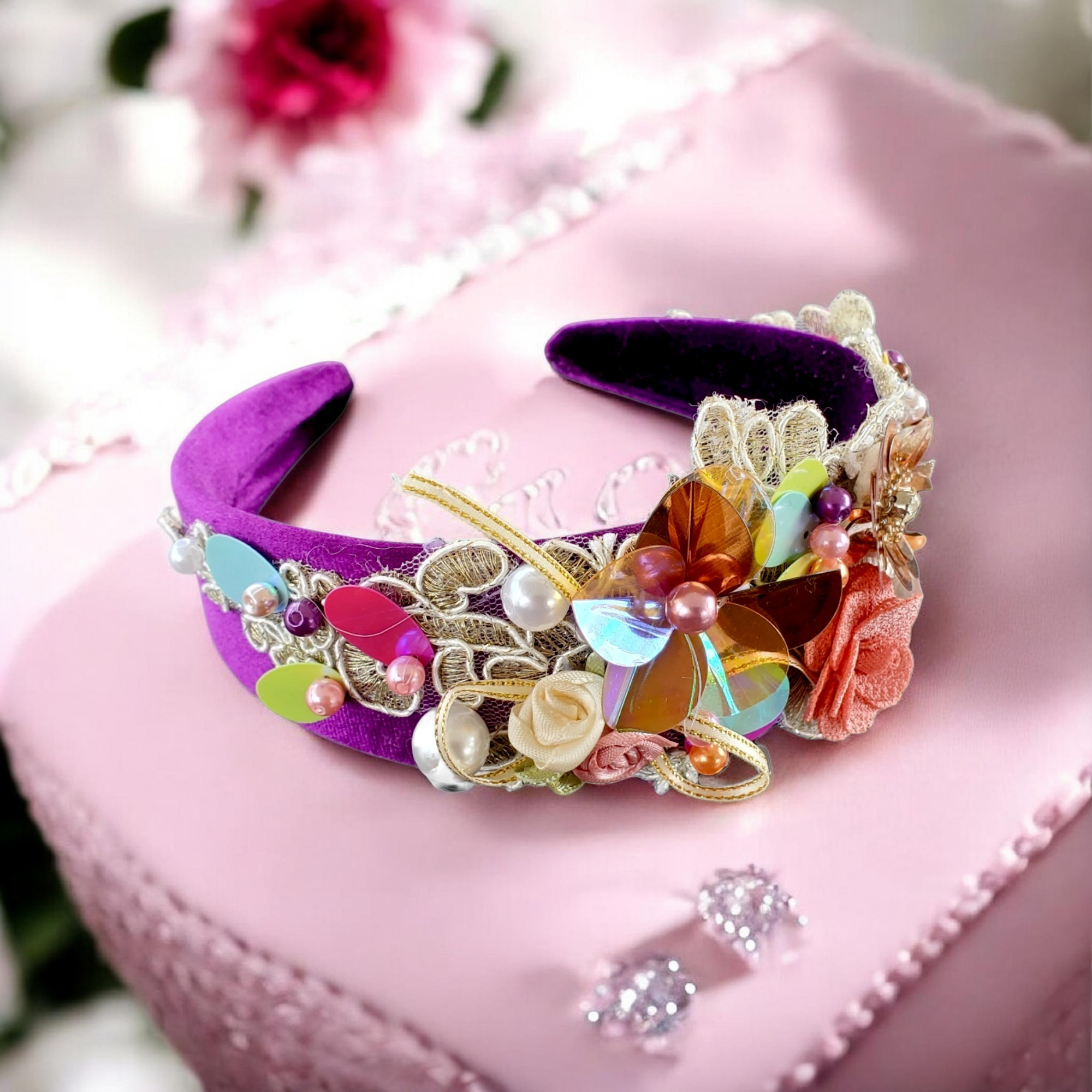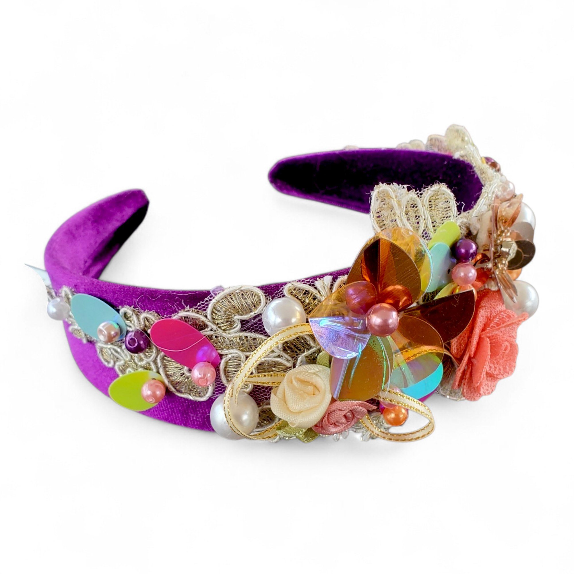 Bentita este realizata pe suport lat de culoare mov, din catifea.Intr-o parte este cusuta o broderie cu flori textile, flori din paiete, perle, si paiete in culori asortate de diferite forme si marimi. Fiecare element este cusut individual.