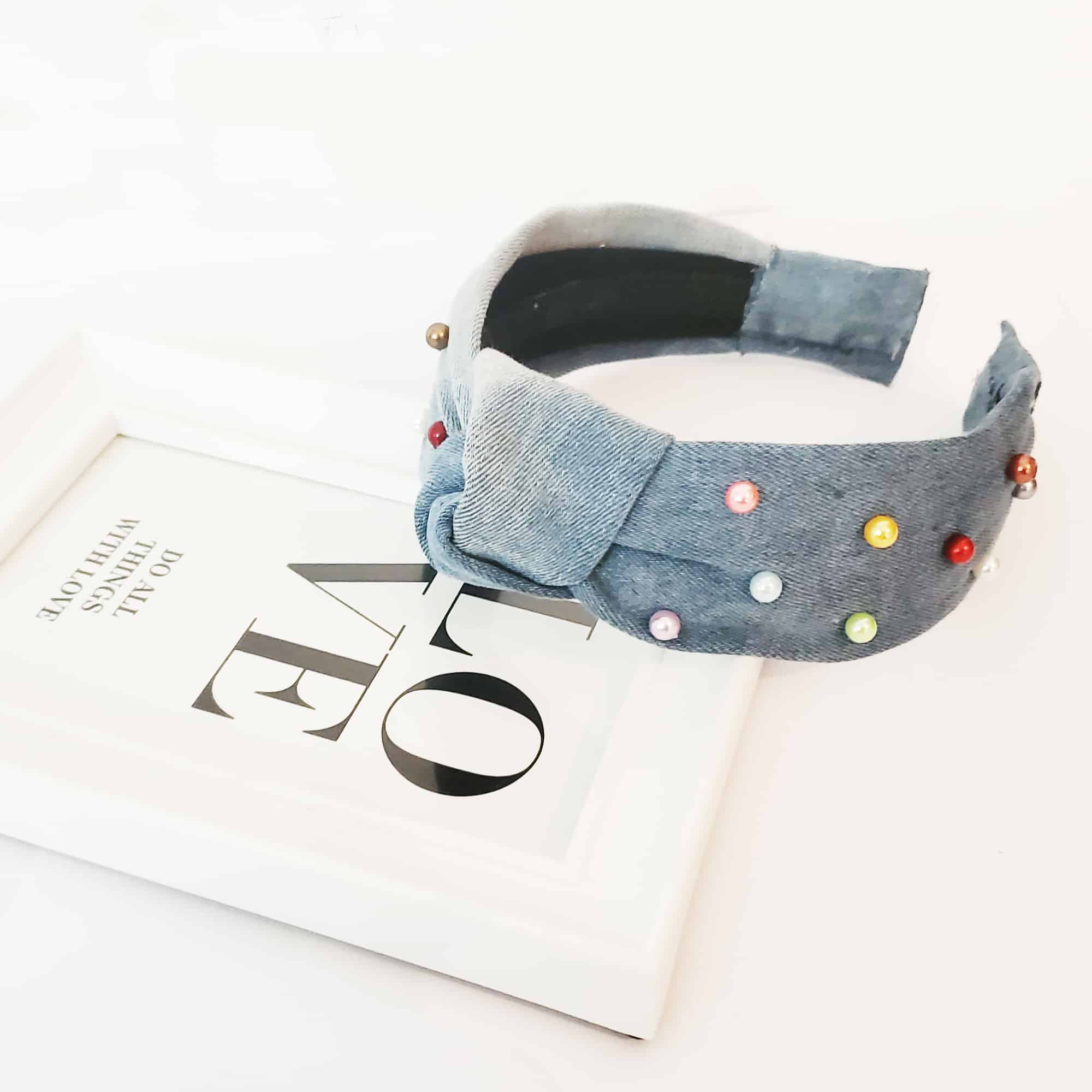 Descoperă farmecul unic al bentitei de blugi Daisy: suport dur ce nu alunecă, îmbrăcat în denim albastru deschis, accesorizat cu perle acrilice colorate cusute manual. Nodul în stil turban oferă rafinament, iar intăritura moale asigură confort deplin pe tot parcursul zilei. O alegere statement pentru un look fresh și elegant!