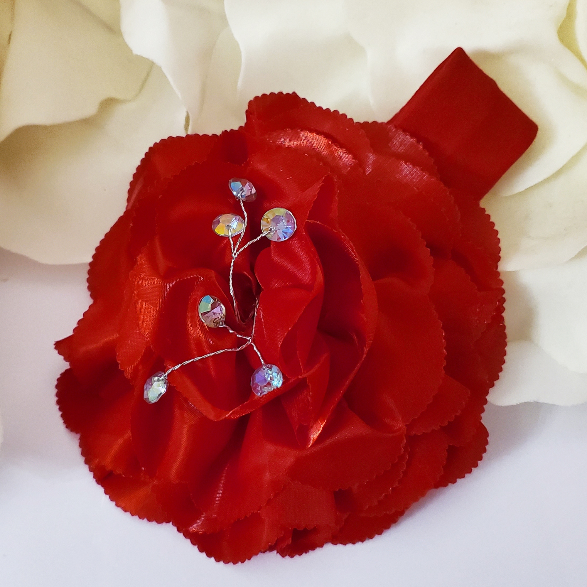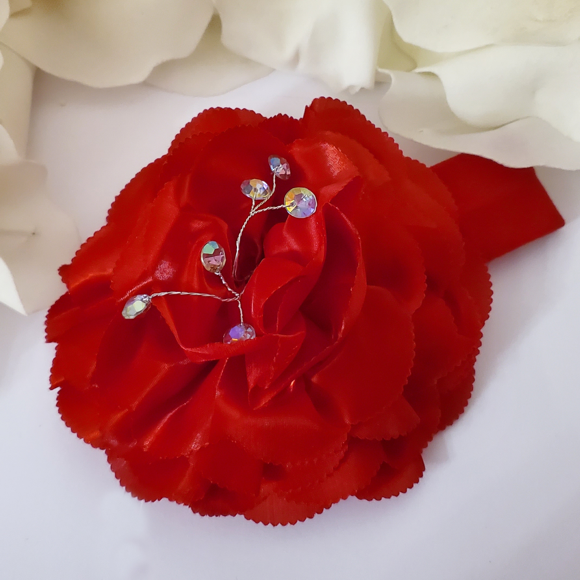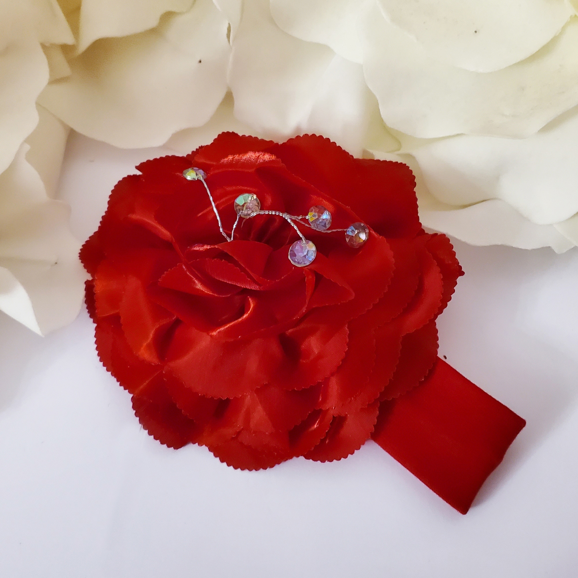 Bentita moale elastica rosie, cu o floare supradimensionata rosie din satin lucios. In floare sunt cristale cu reflexii multicolore, ce se pot modela cum doriti in interiorul florii, fiind pe sarma modelatoare subtire.
