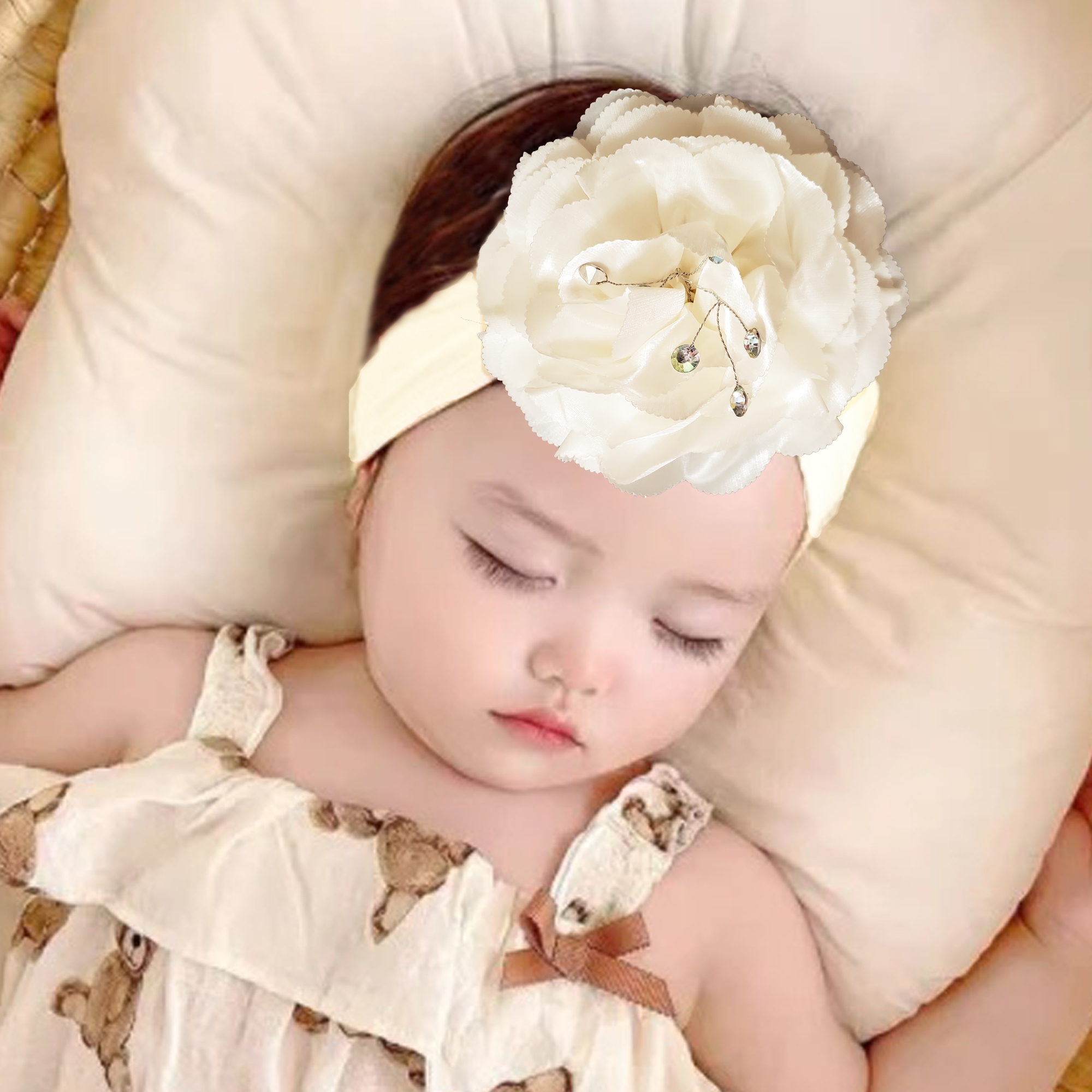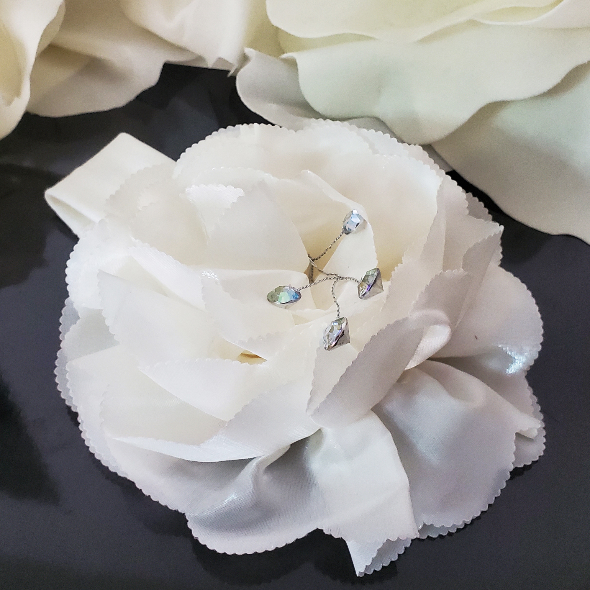 Floarea supradimensionată, realizată din satin cu luciu elegant, atrage lumina și creează un efect vizual deosebit, transformând fiecare apariție într-un moment memorabil. Cristalele multicolore din interior adaugă o notă jucăușă și sofisticată, iar posibilitatea de a le modela după bunul plac dă libertatea fiecărei mămici sau micuțe să-și exprime propriul stil.