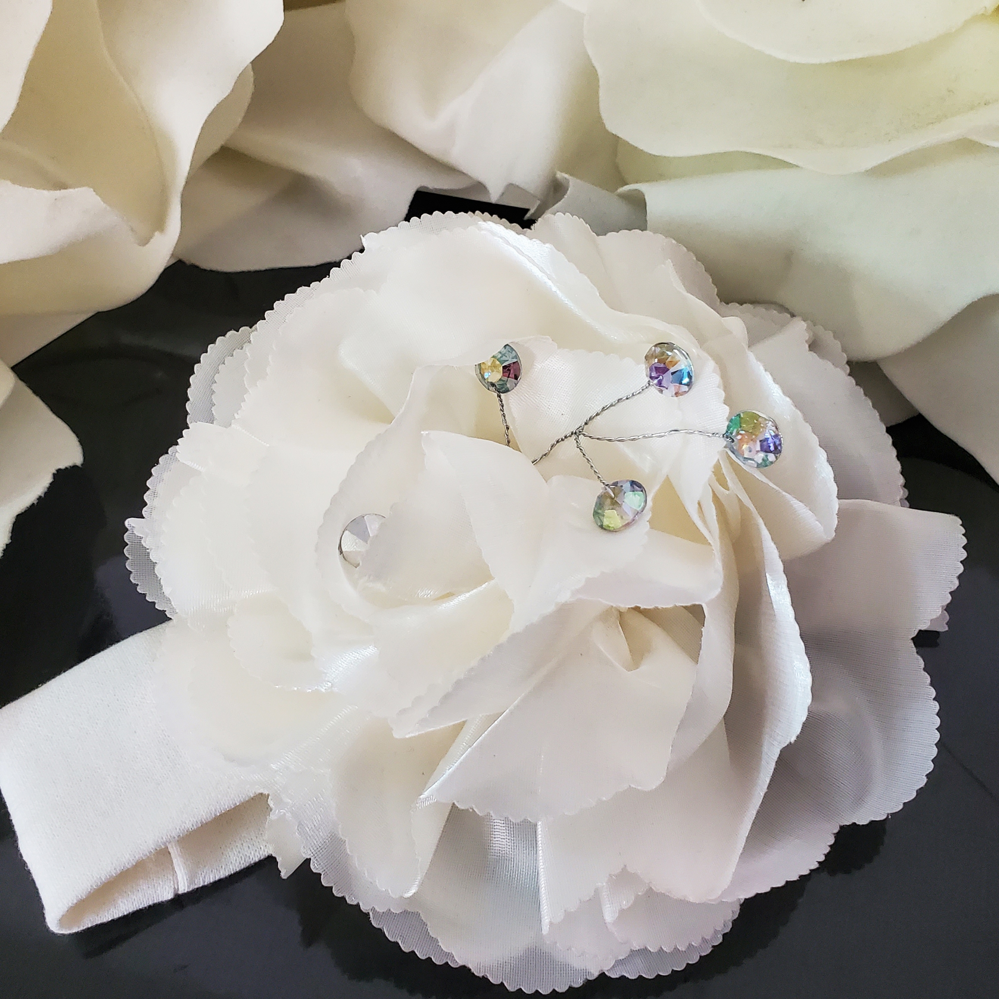 Descoperă magia copilăriei cu bentita Degetica: moale, elastică și delicată, cu o floare supradimensionată din satin alb lucios și cristale multicolore modelabile. Un accesoriu de poveste ce aduce strălucire și rafinament fiecărei ținute!