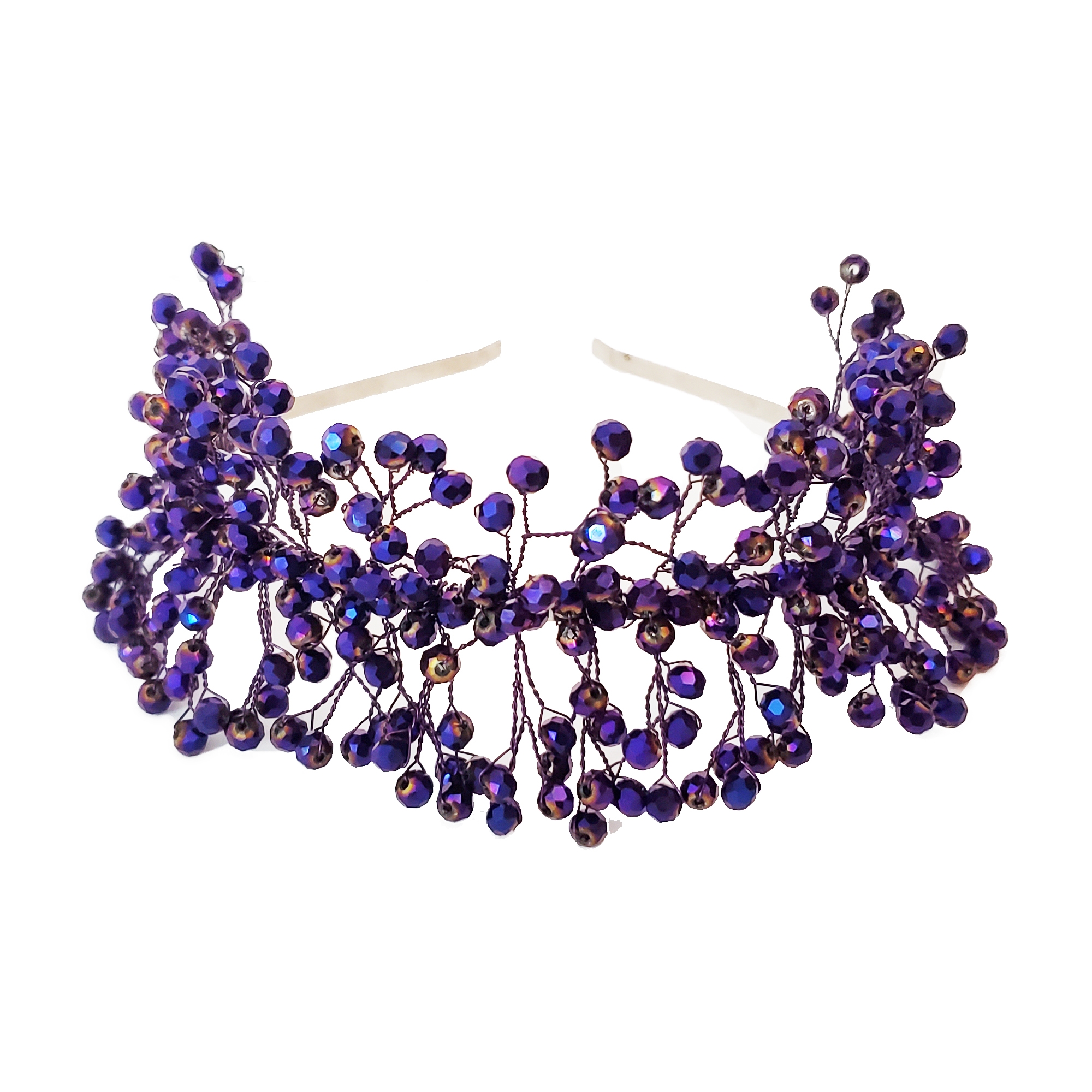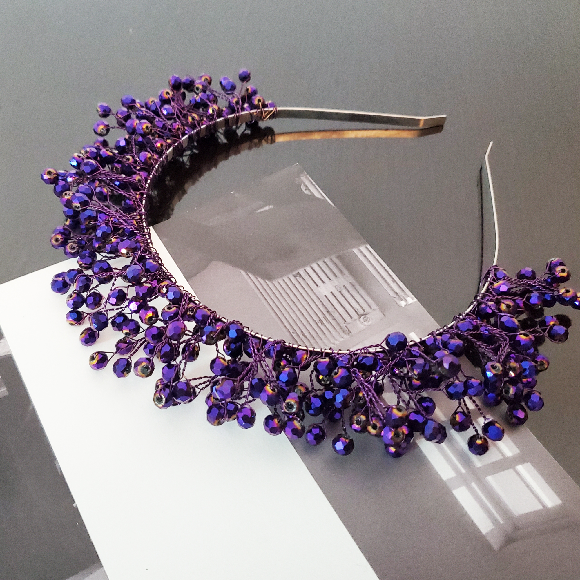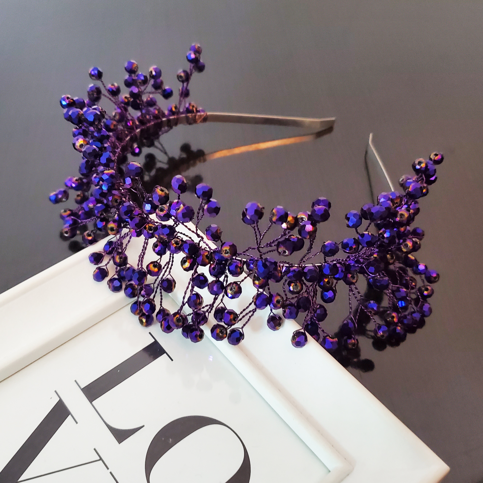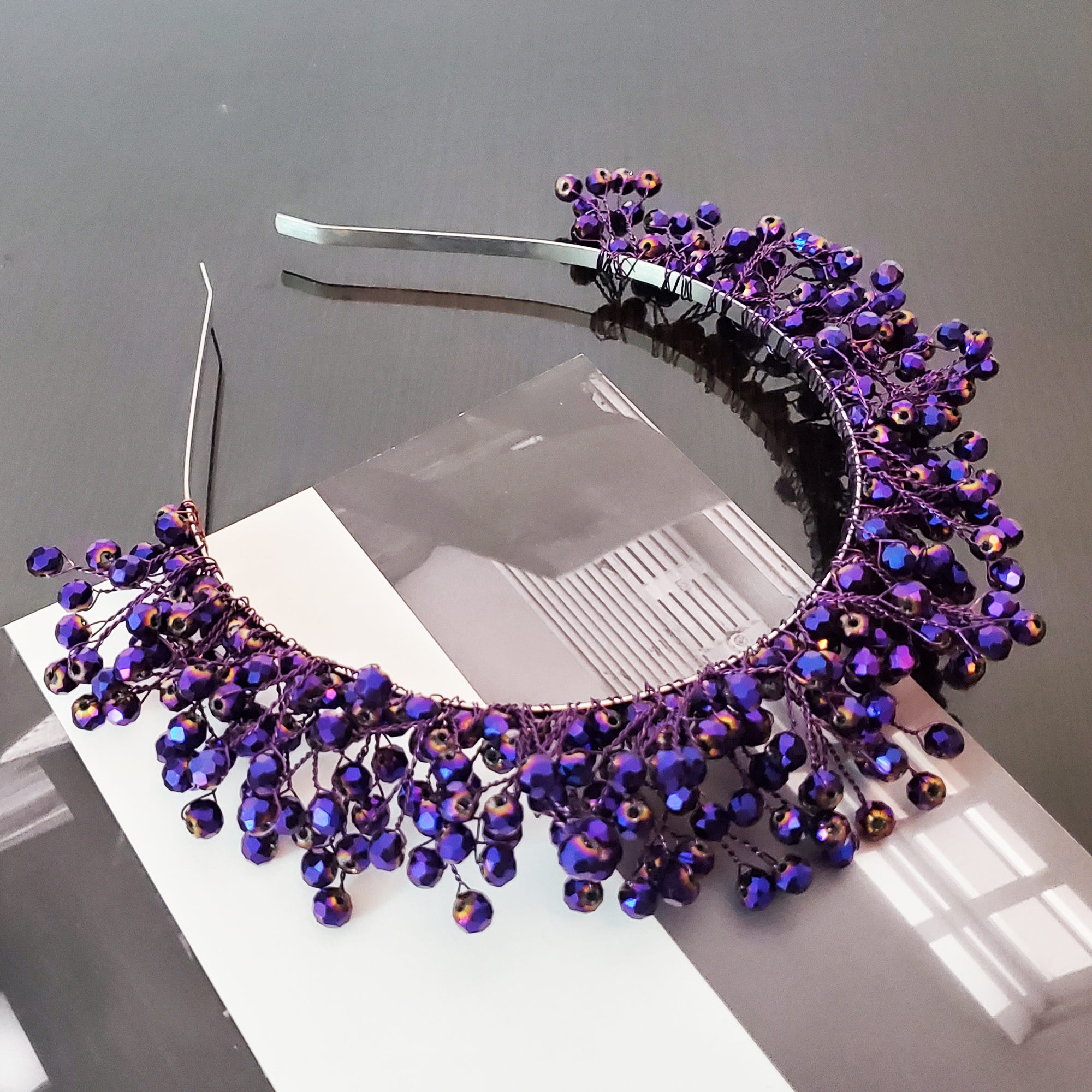Descoperă magia bentitei Glami Dark: creată ca o bijuterie, cu sârmă modelatoare și pietre de sticlă mov închis cu reflexii fascinante. Fiecare petală se contopește armonios în coafura ta, ridicându-se ca o coroniță sau așezându-se elegant pe păr. Seria limitată Glami te invită să strălucești la orice ocazie!