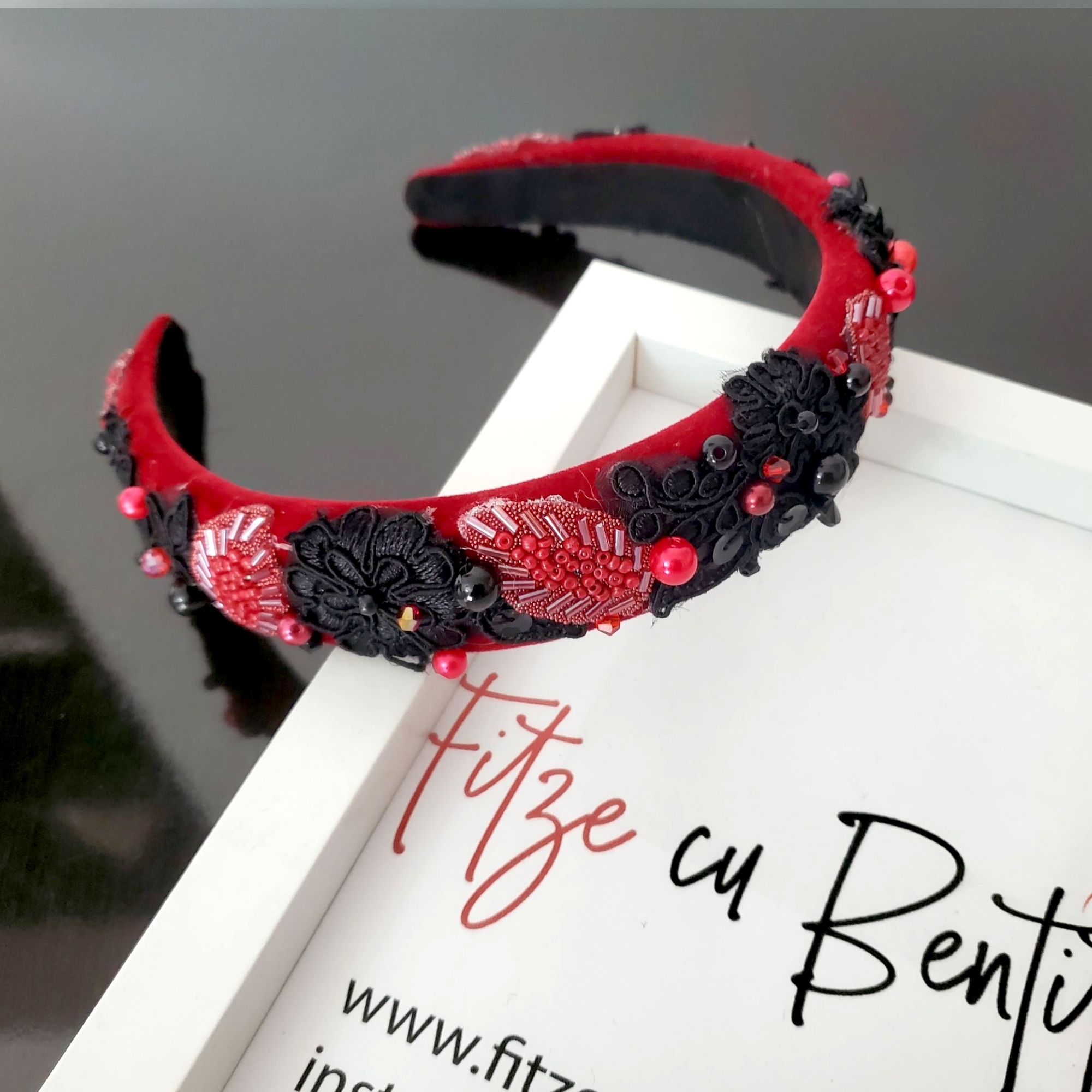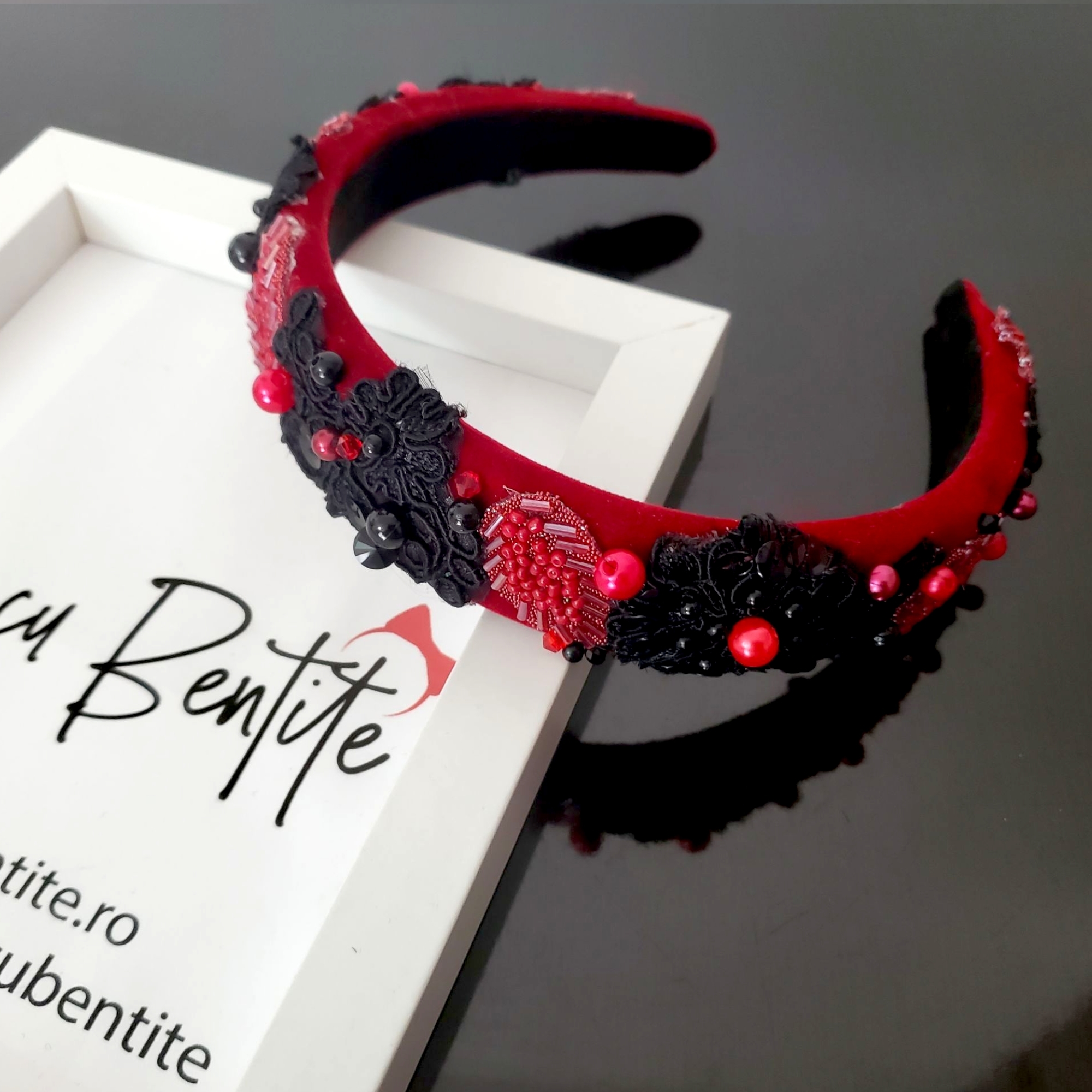 Descoperă Bentita Monalisa roșie, creată manual din catifea fină pentru confort desăvârșit. Dantela delicată, frunzele din mărgeluțe și perlele cusute aduc farmec oricărei ținute. Nu alunecă, nu jenează și se potrivește perfect oricărui stil – office, casual sau elegant. Poartă povestea rafinamentului!