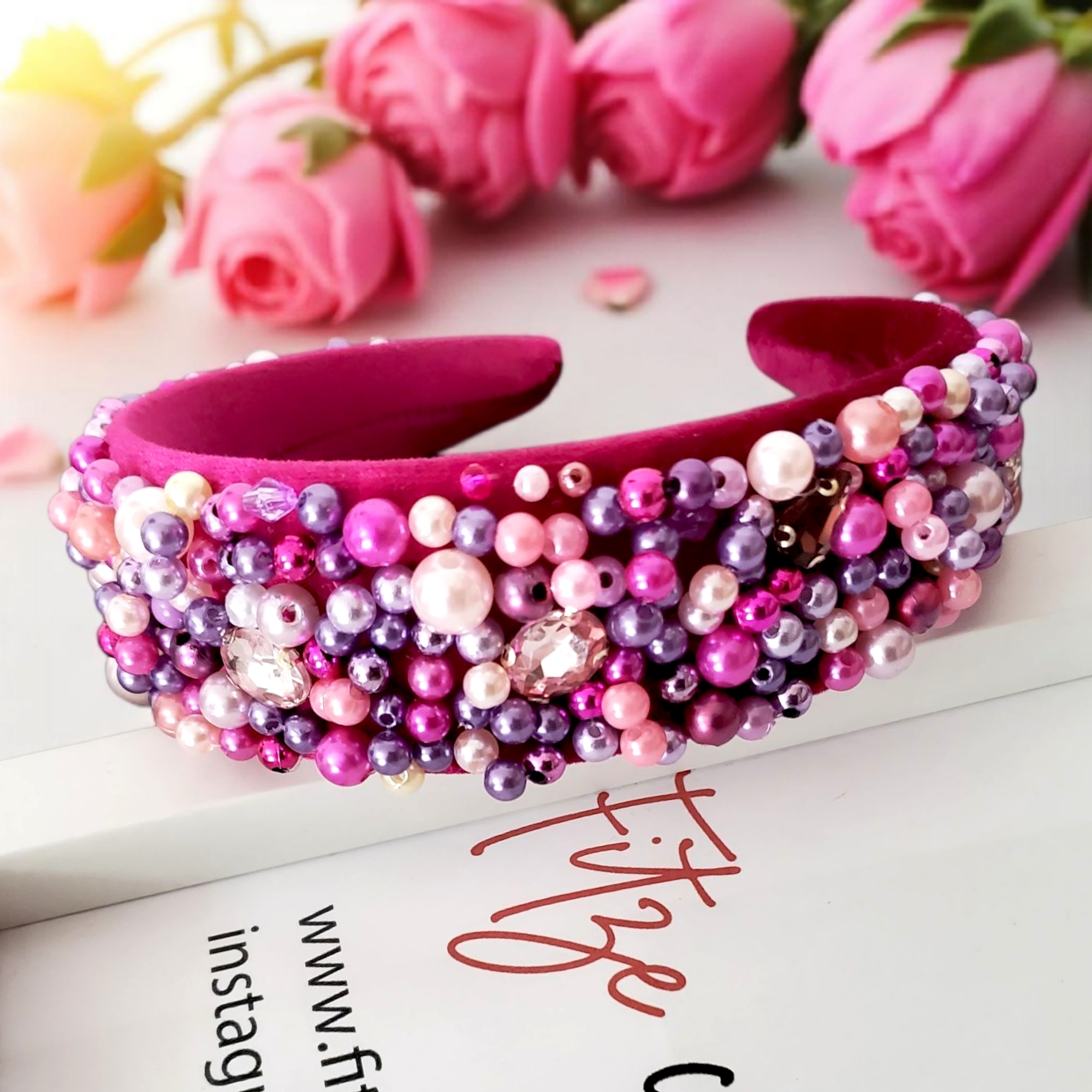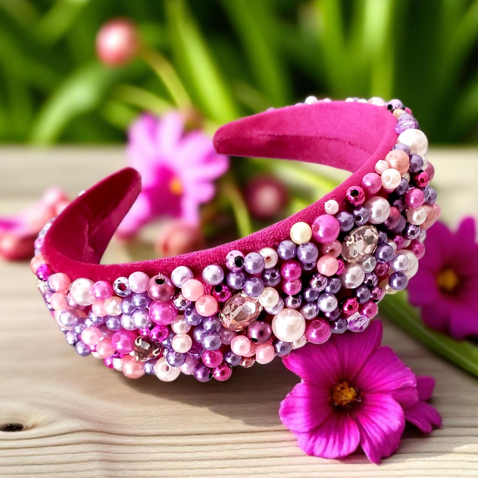 Bentita este realizata pe suport imbracat in catifea roz. In exterior sunt cusute cristale de sticla in nuante de roz, si perle in combinatia mov/roz de diferite marimi