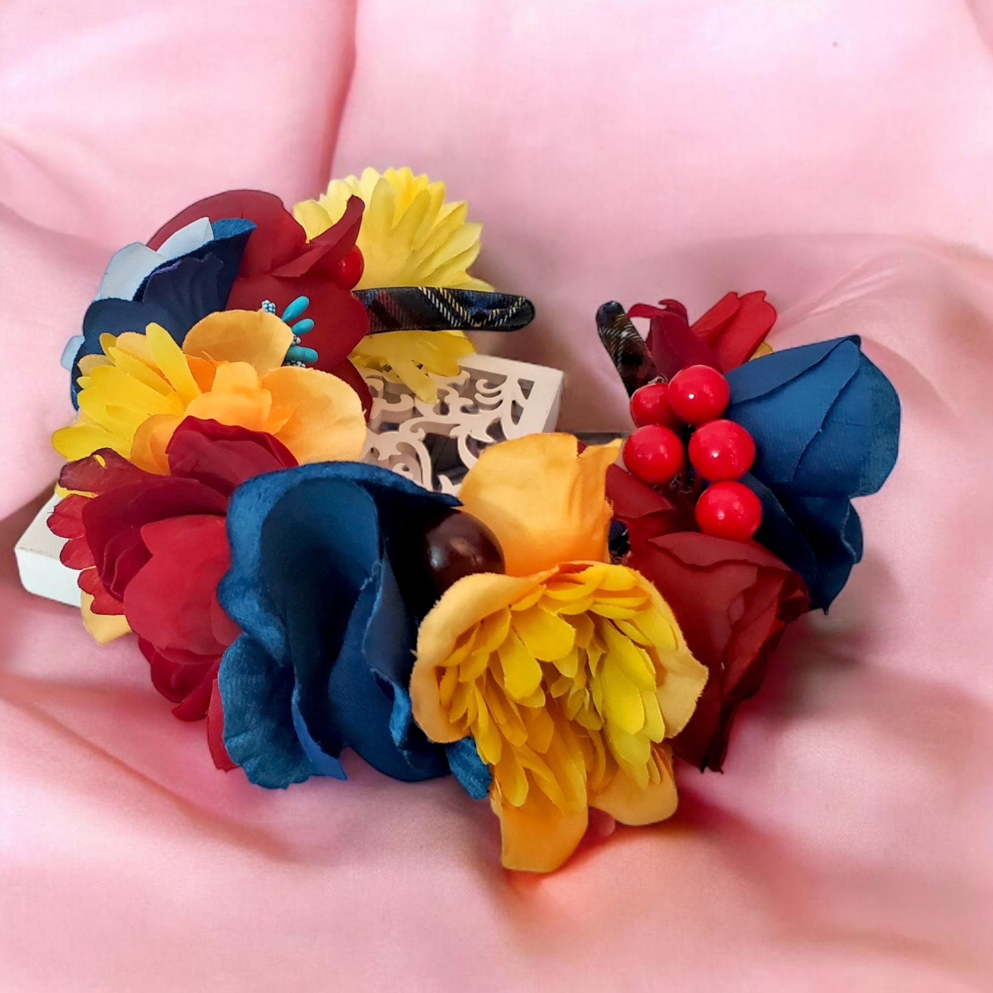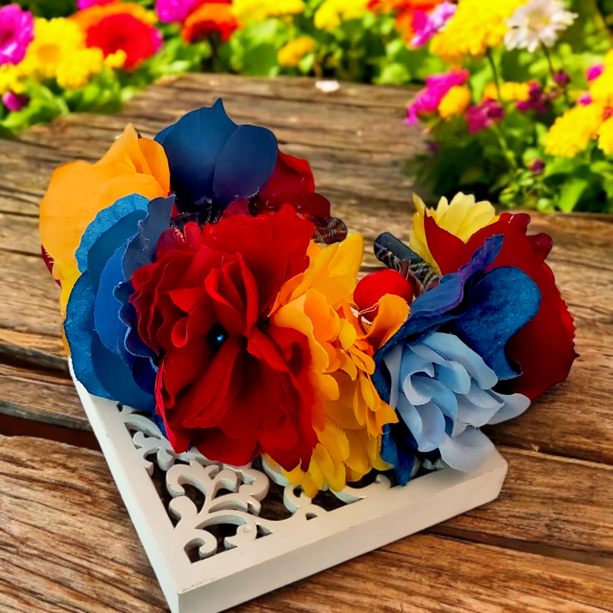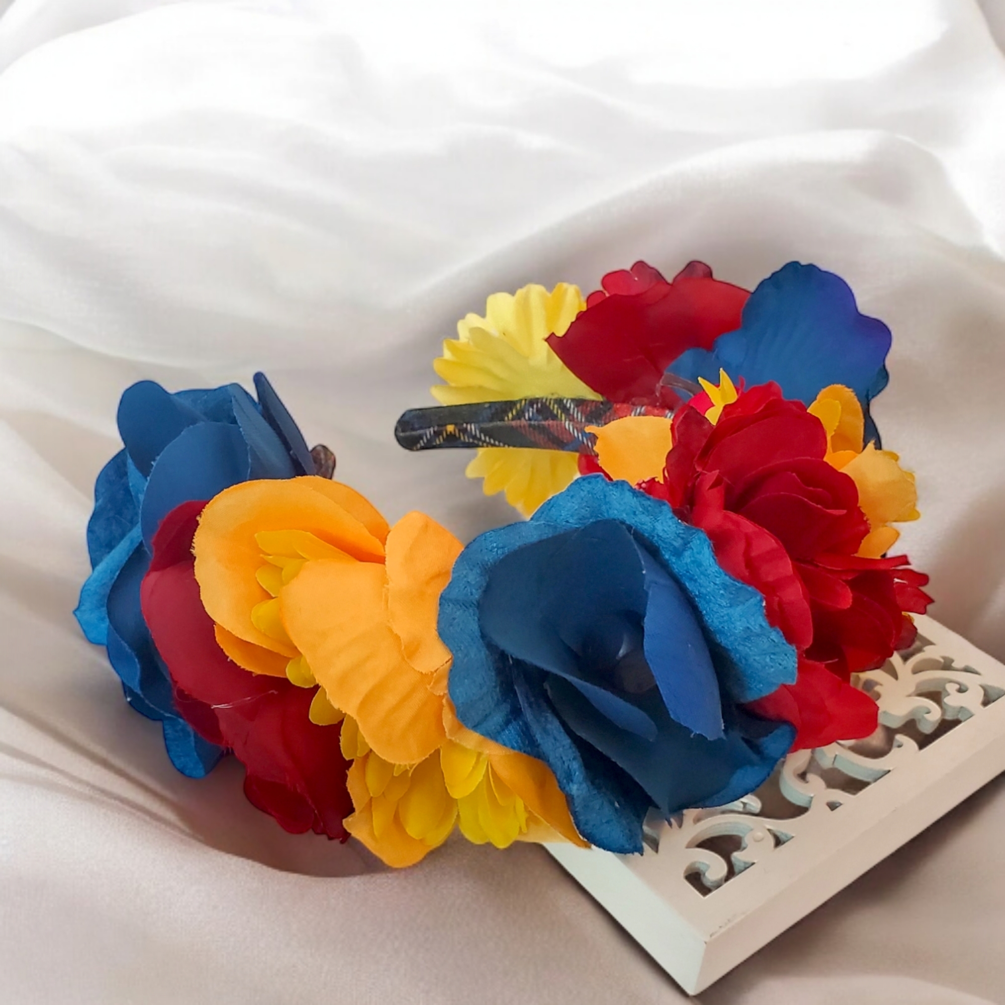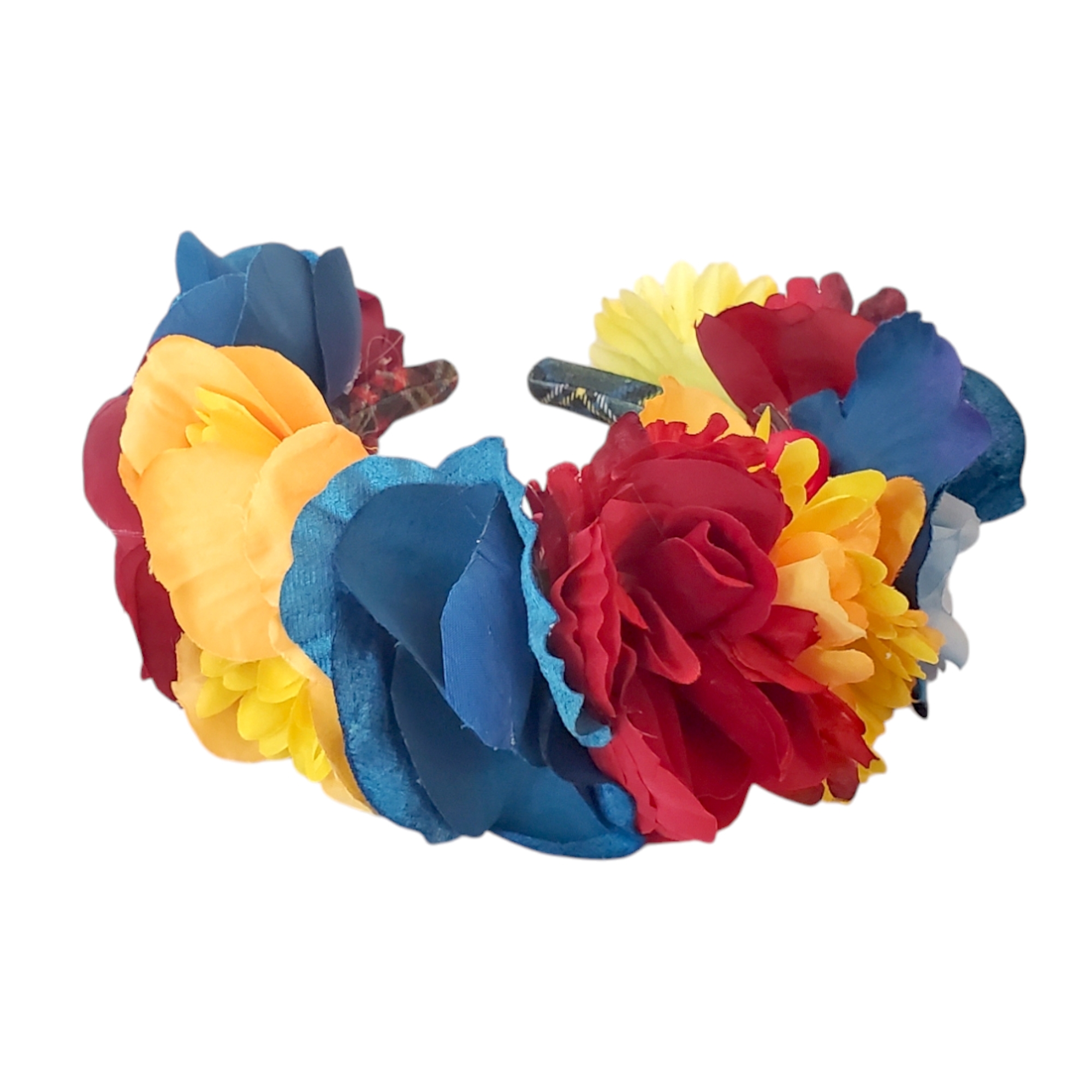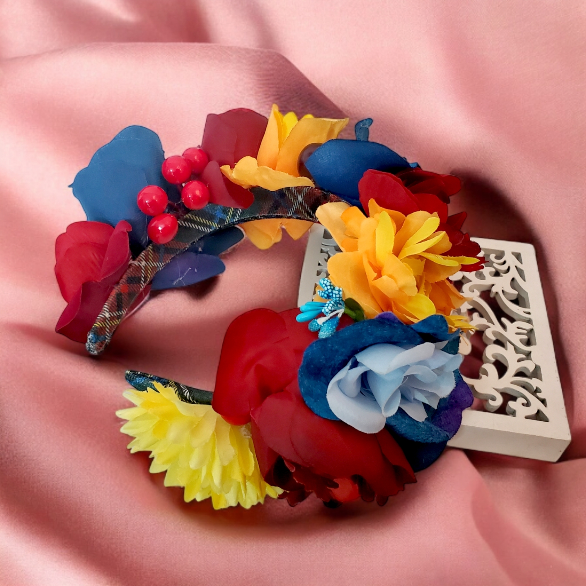 Bentita este realizata pe suport confortabil, nu aluneca, nu necesita agrafe, imbracat in catifea. In exterior sunt cusute flori textile in nuante de rosu, galben si albastru. In interior avem captuseala de catifea care ajuta la stabilitate pe orice coafura. Datorita catifelei bentita se poate purta cu usurinta fara sa jeneze in spatele urechilor sau sa doara.