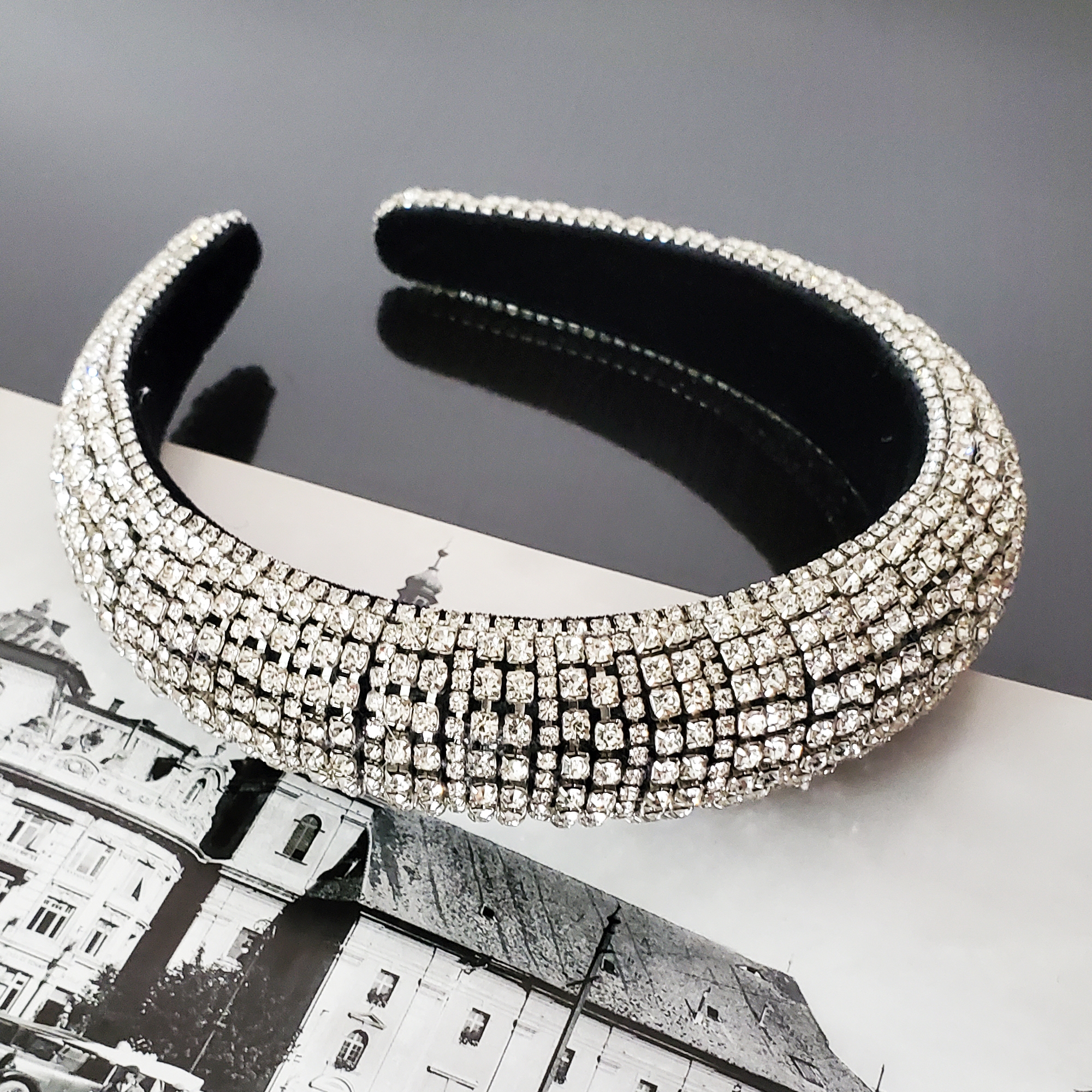 Bentita este realizata pe suport confortabil, nu aluneca, nu necesita agrafe, imbracat in catifea. In exterior sunt aplicate doar strasuri cu reflexie alba pe toata suprafata bentitei .In interior avem captuseala de catifea care ajuta la stabilitate pe orice coafura. Datorita catifelei bentita se poate purta cu usurinta fara sa jeneze in spatele urechilor sau sa doara. Bentita este umpluta cu vatelina, pentru volum.