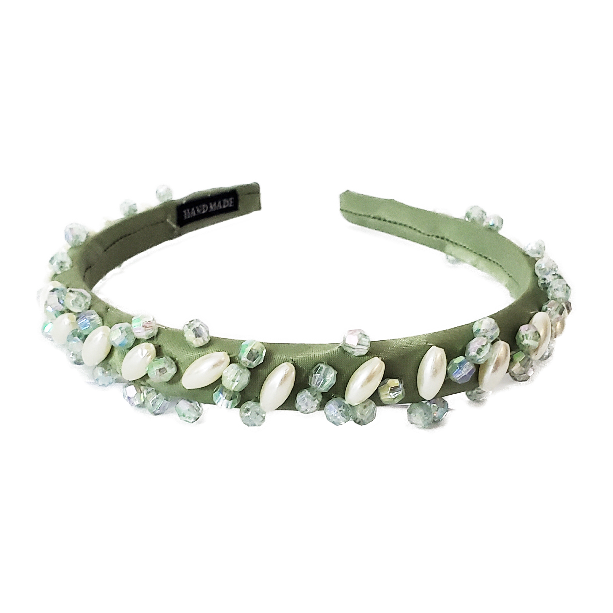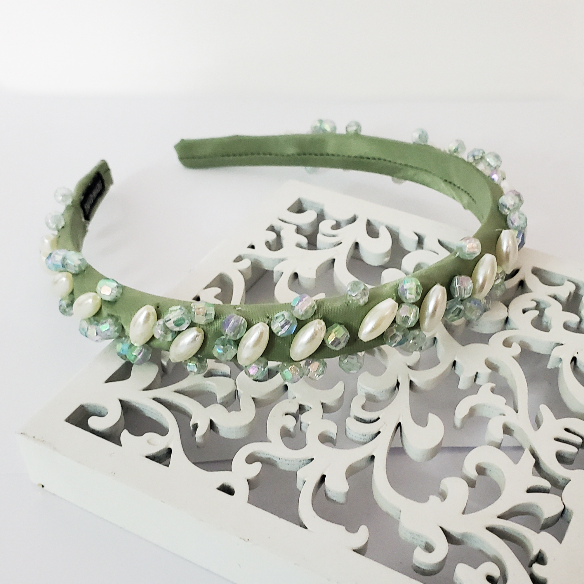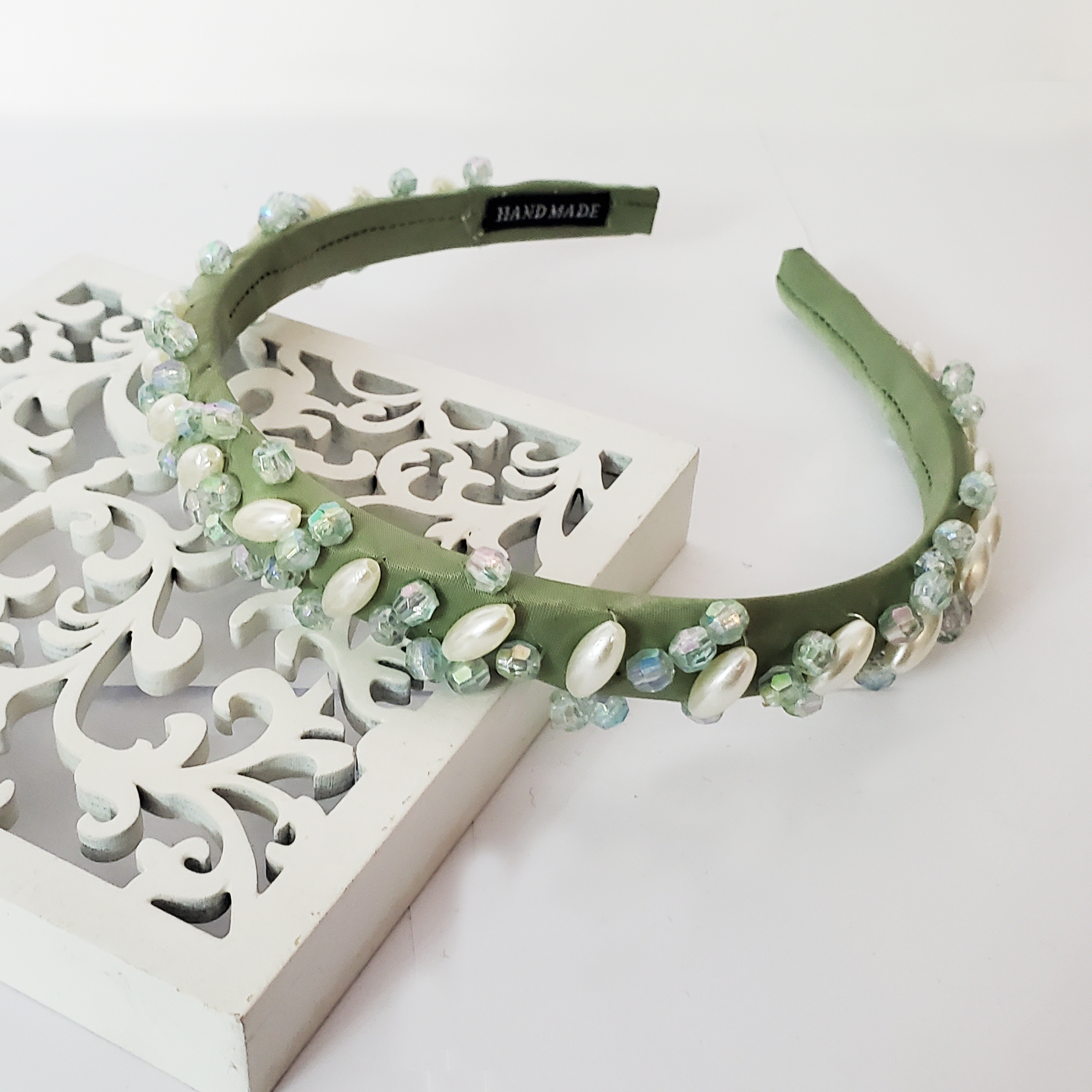 Cordeluta este realizata pe suport ingust confortabil, nu aluneca, nu necesita agrafe, imbracat in matase verde deschis. Pe bentita sunt cusute perle albe lungi si cristale acrilice cu reflexii veri si albastre. Datorita captuselii bentita se poate purta cu usurinta fara sa jeneze in spatele urechilor sau sa doara.