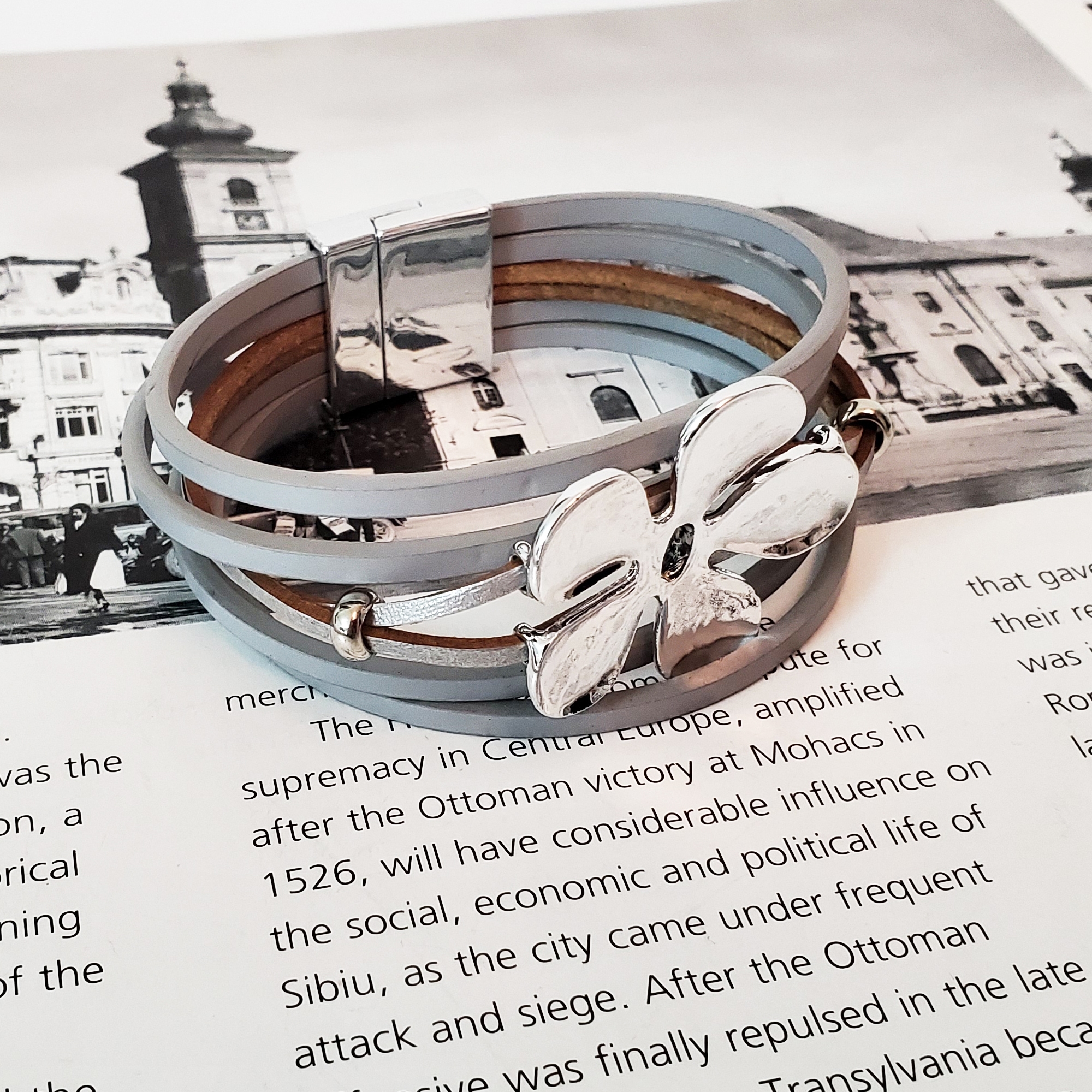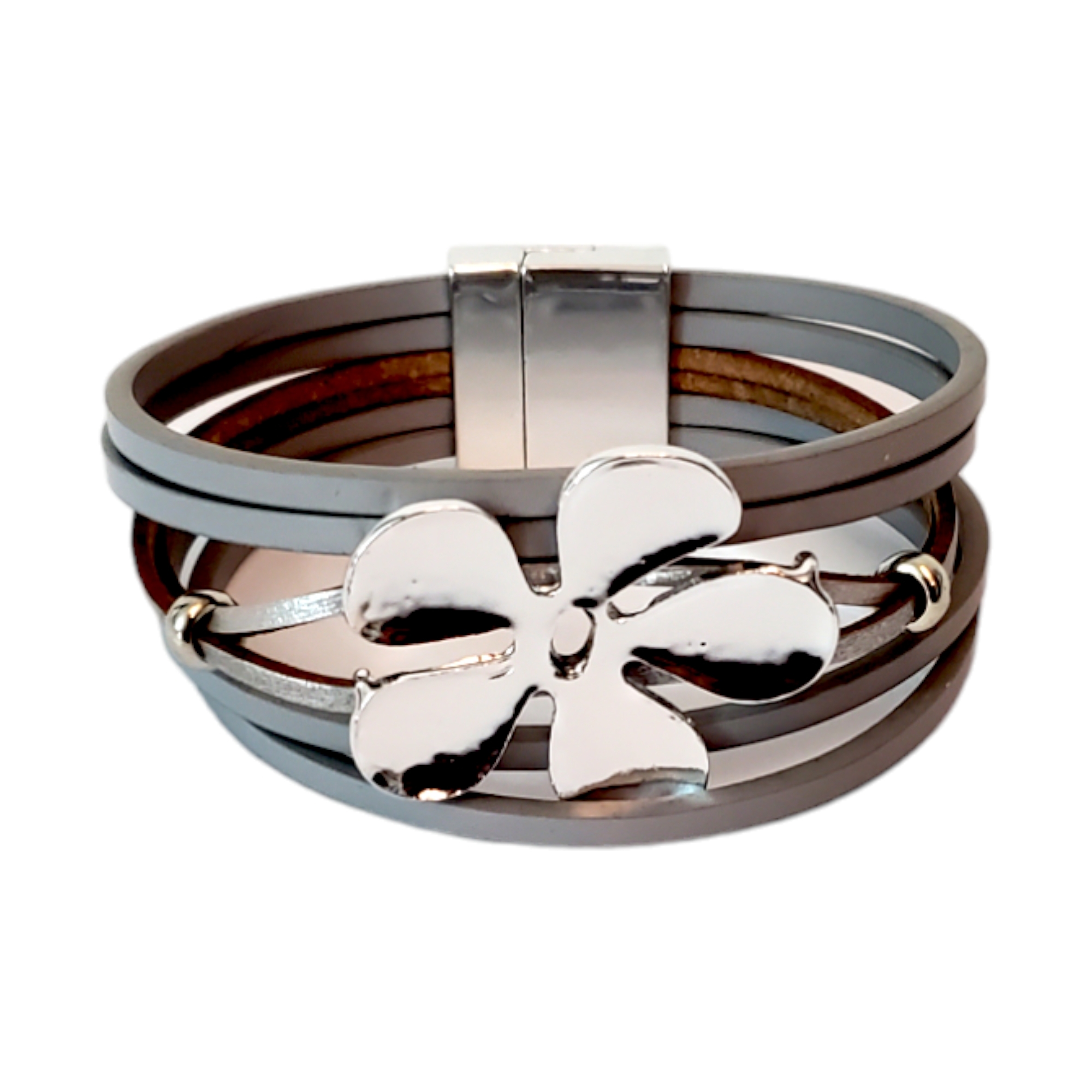 Bratara realizata din 6 randuri de piele ecologica in combinatia gri/maro. Pe mijloc este o floare metalica supradimensionata argintie. Se inchide cu sistem magnetic cu cheita de siguranta. Se livreaza in sac textil pentru bijuterii.