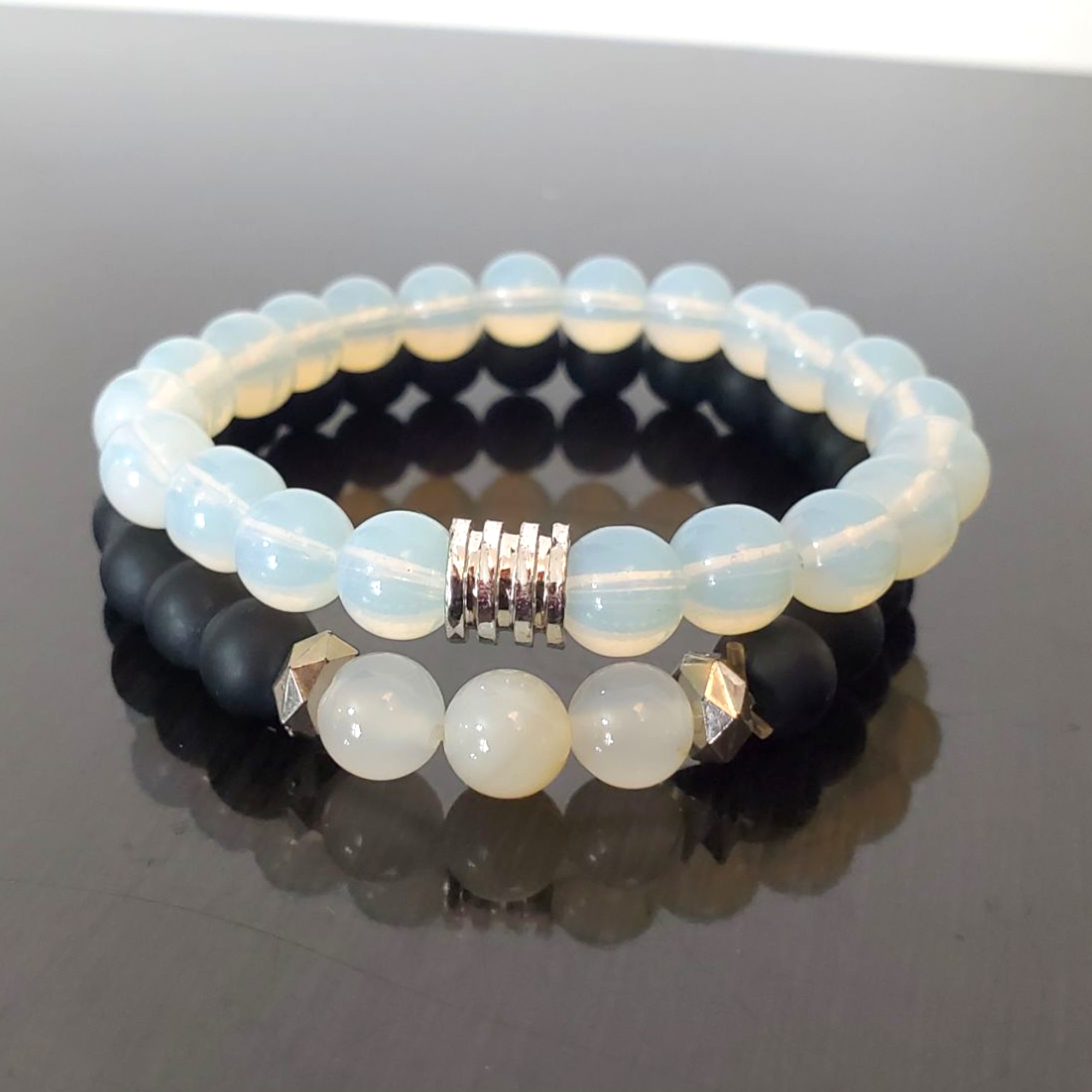 Setul contine doua bratari, una semitransparenta si una din combinatia semitransparent/negru/argintiu. Se pot purta impreuna sau separat. Bratarile sunt confectionate din perle de sticla slefuita, opace, cu distantiere metalice argintii. Bratara neagra este din roca vulcanica slefuita.