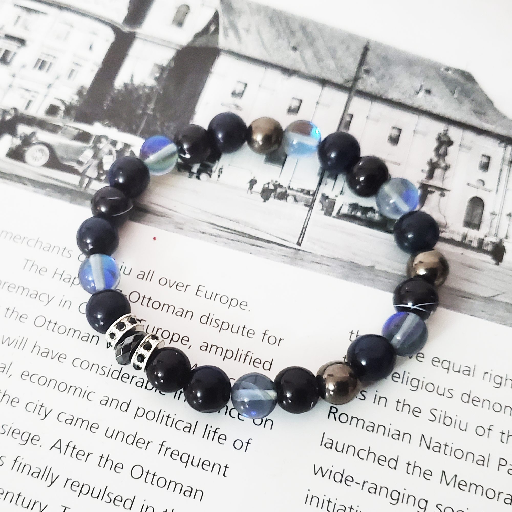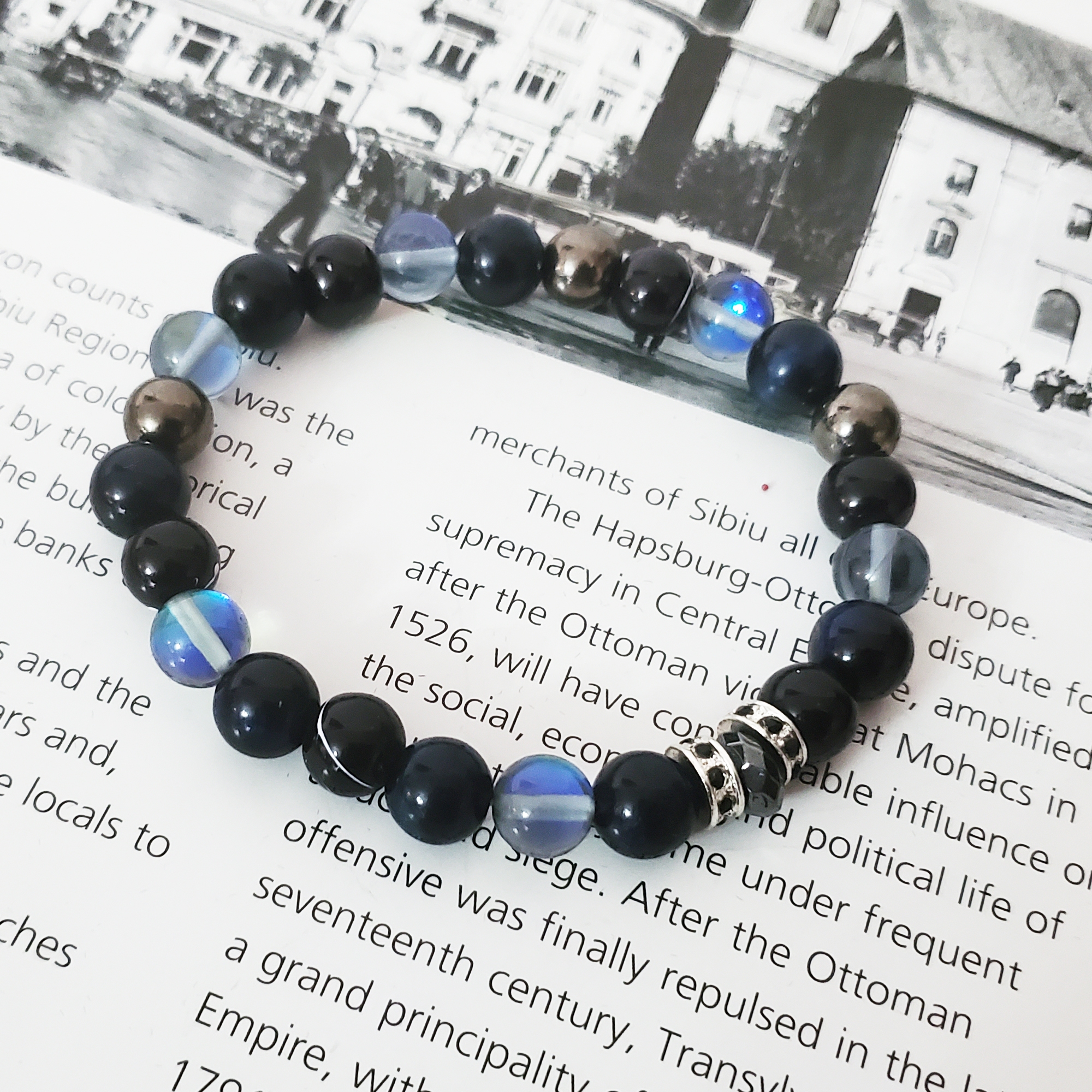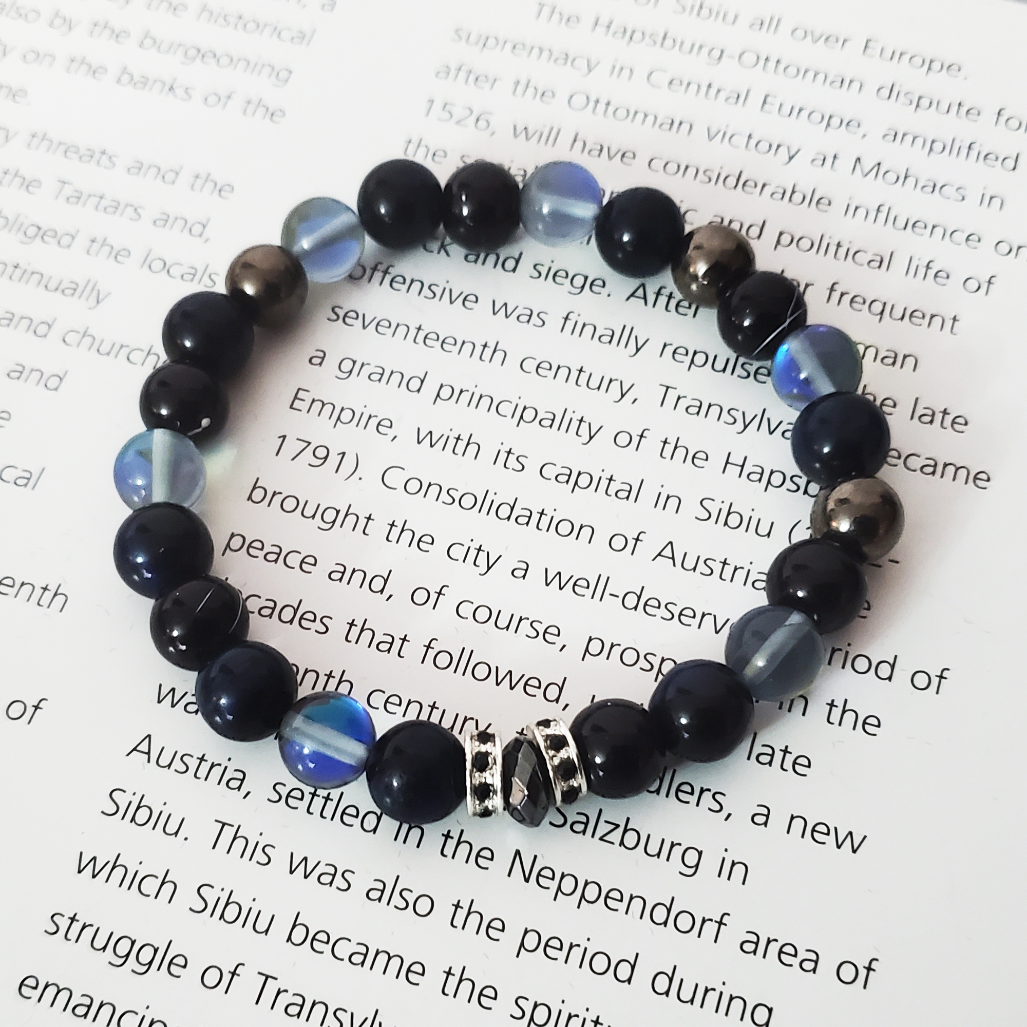 Este confectionata din pietre semipretioase piatra lunii, perle de stc=icla negre, perle metalice si distantiera din zirconiu.