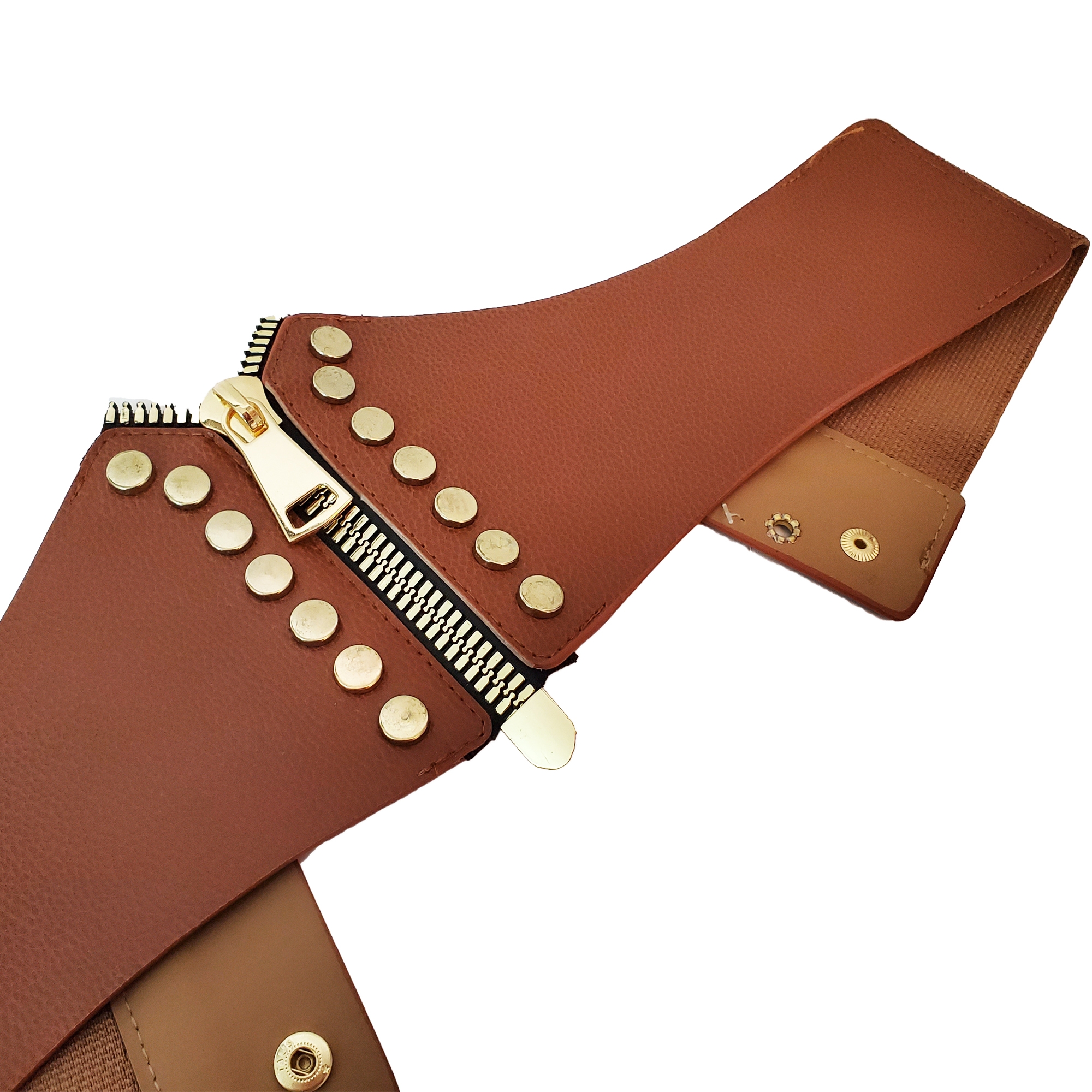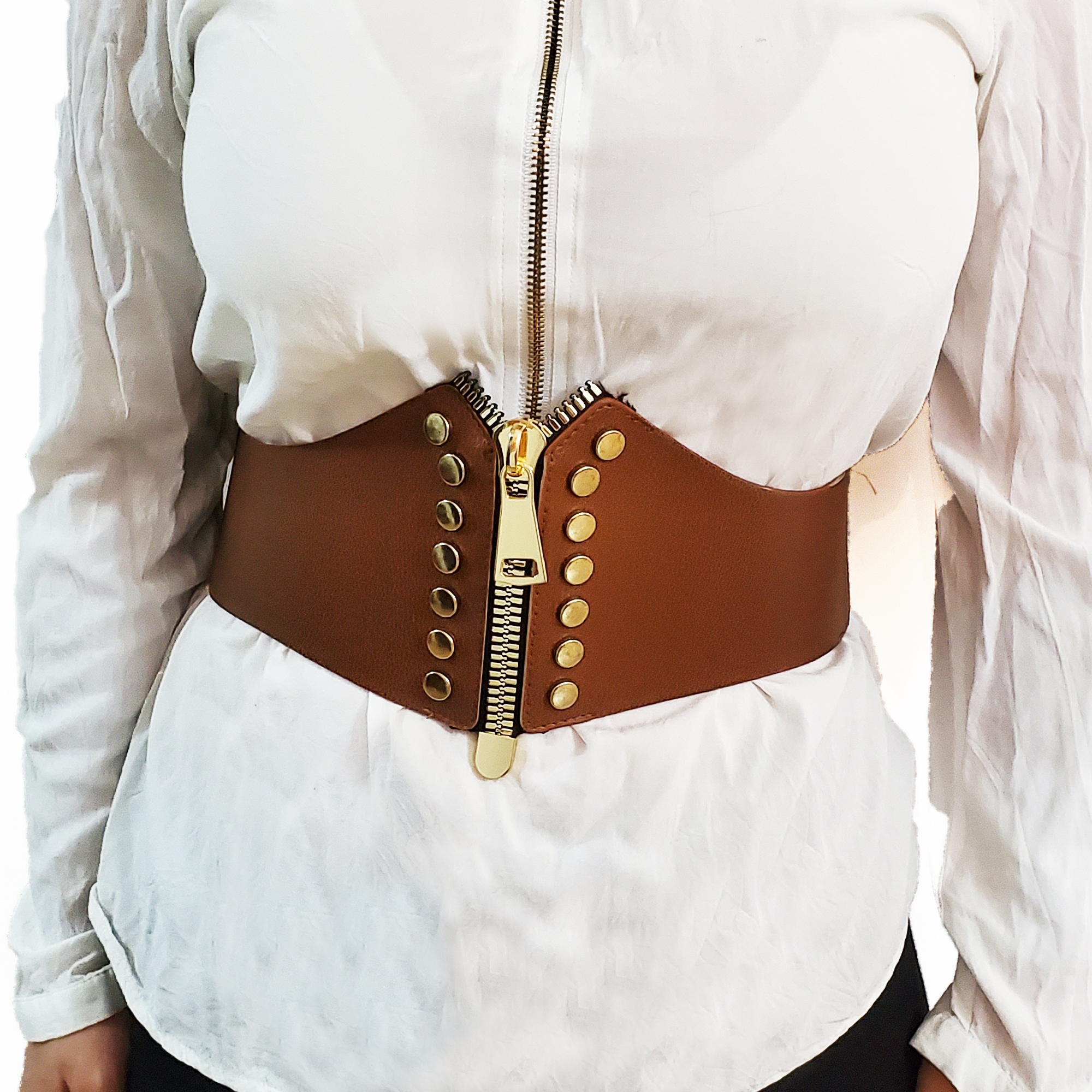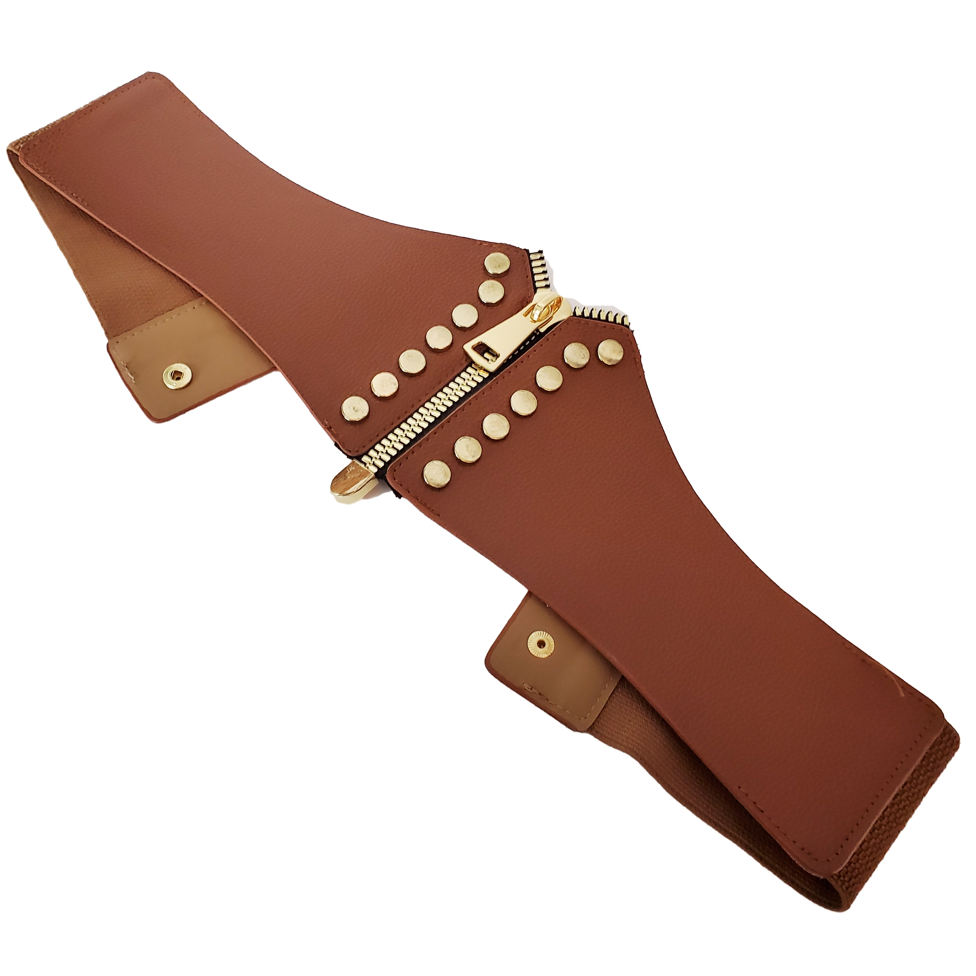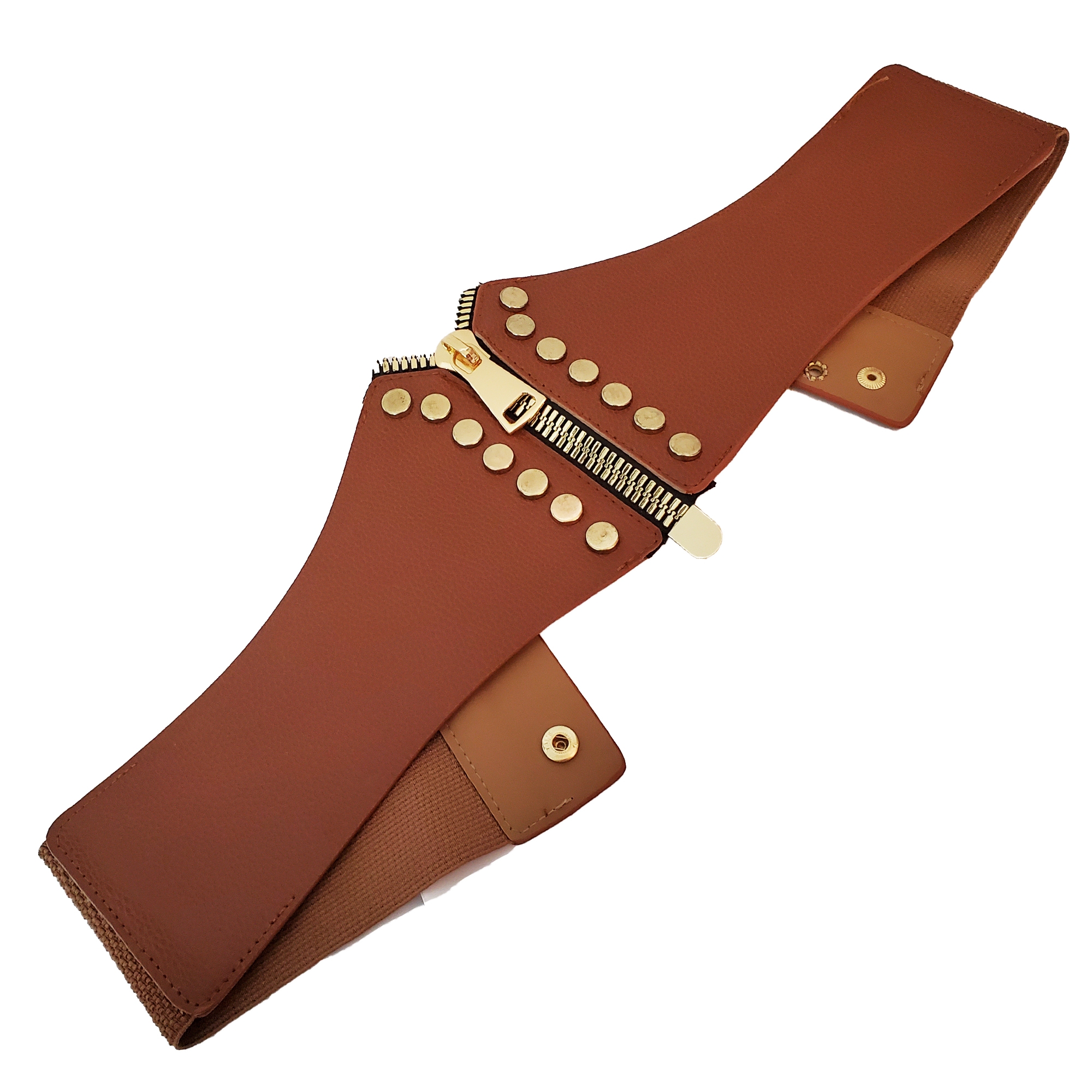 Centura Ankara este confectionata jumatate din banda elastica maro si jumatate din piele acologica. Inchiderea este cu capse, la spate. Partea din fata are pe mijloc un fermoar metalic auriu supradimensionat, perfect functionabil.