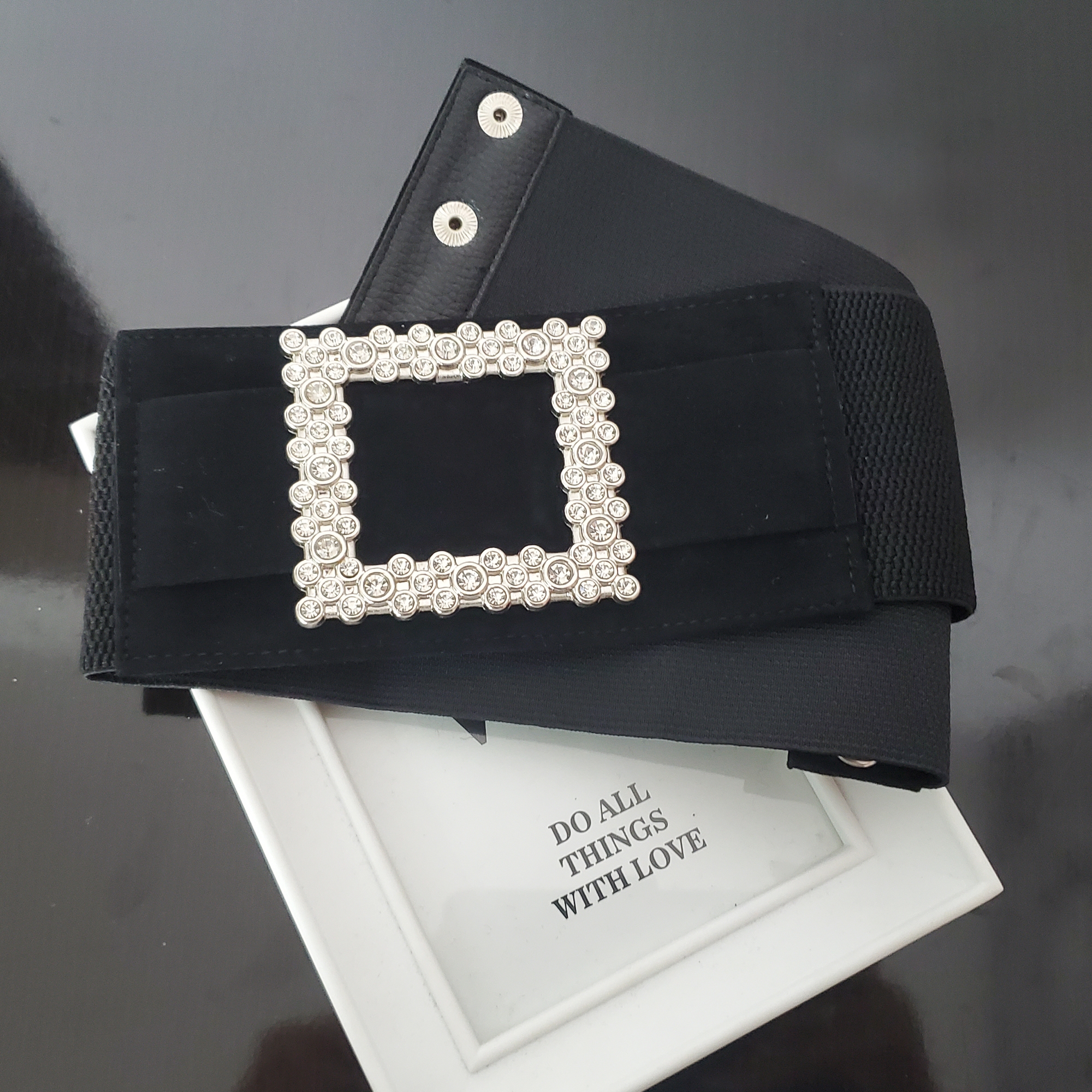 Cureaua Classic este confectionata pe banda elastica lata lejera neagra, cu intaritura din piele naturala in partea din fata. Pe intaritura este o aplicatie din strasuri de sticla patrata