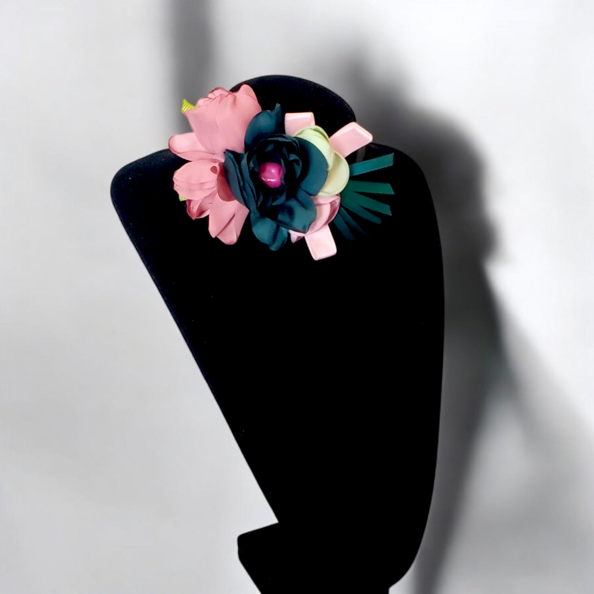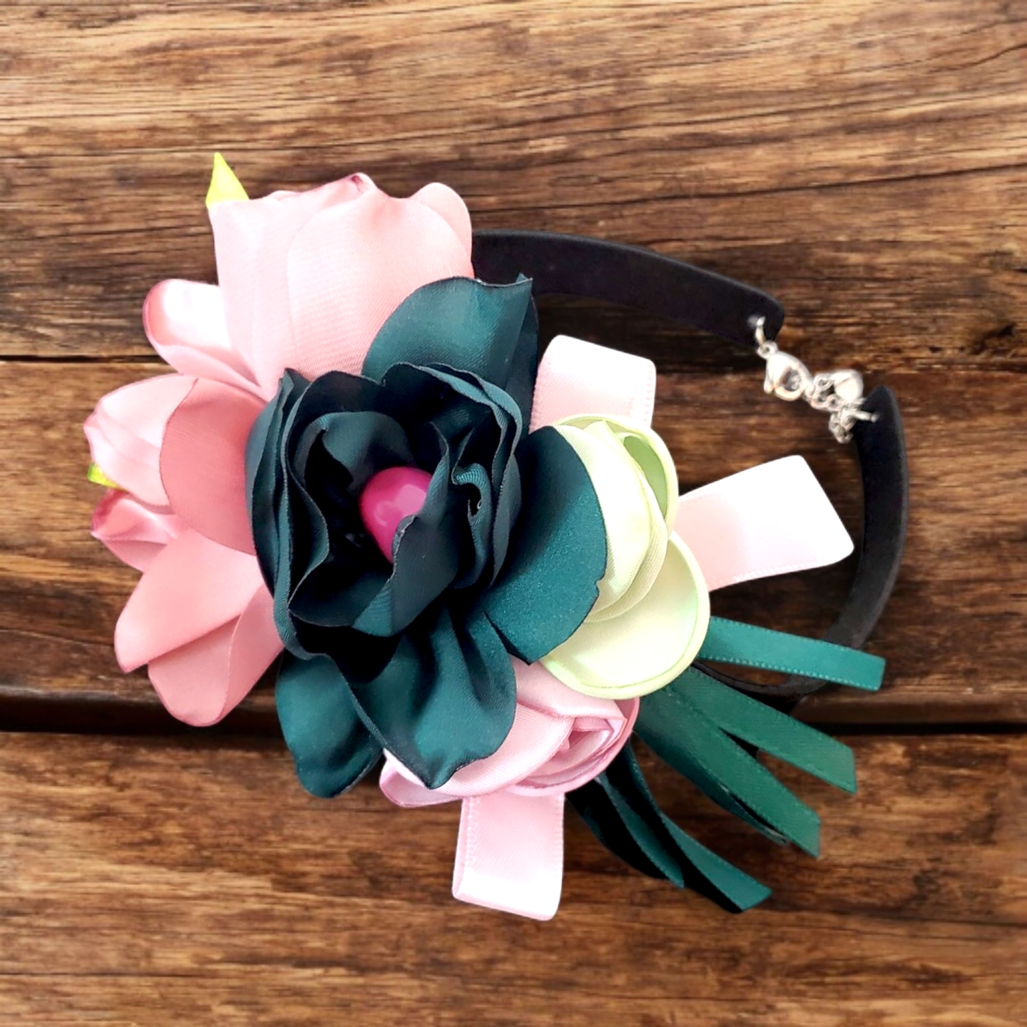 Colier tip choker cu aspect floral. Florile sunt din matase, in nuante de verde si roz. Florile sunt montate pe material tip piele ecologica, ce se inchide la spate cu cheita metalica argintie.