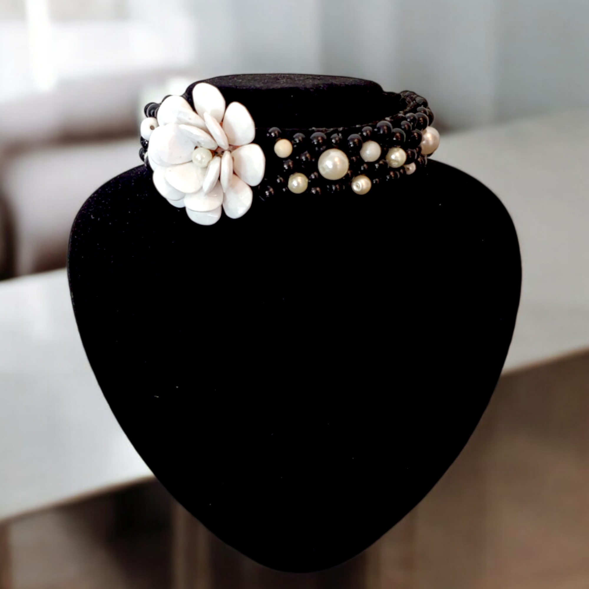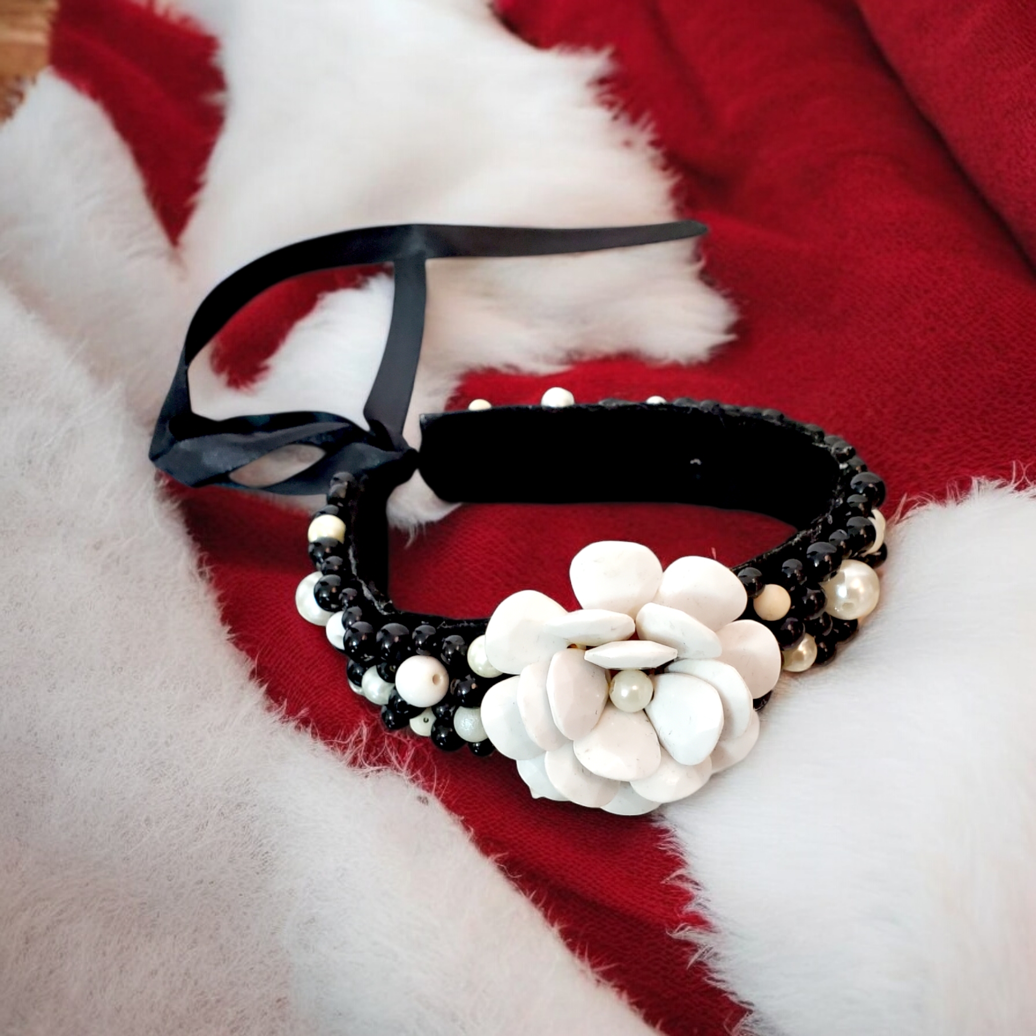 Chokerul este din material textil, pe care sunt cusute perle in combinatia alb si negru. Intr-o parte este o floare alba din petale acrilice. Se livreaza in sac textil pentru bijuterii