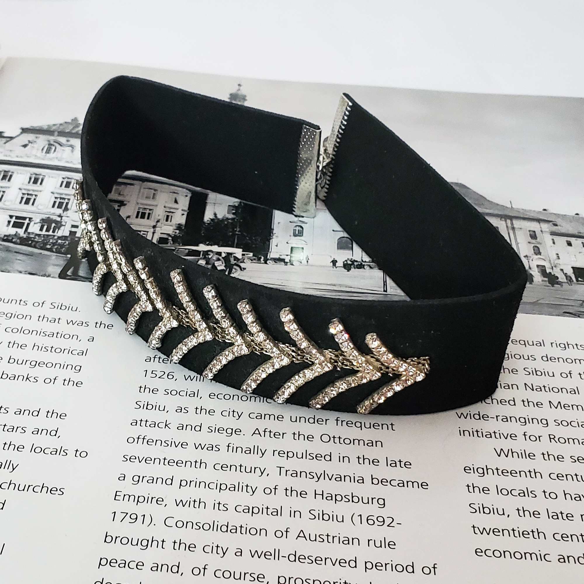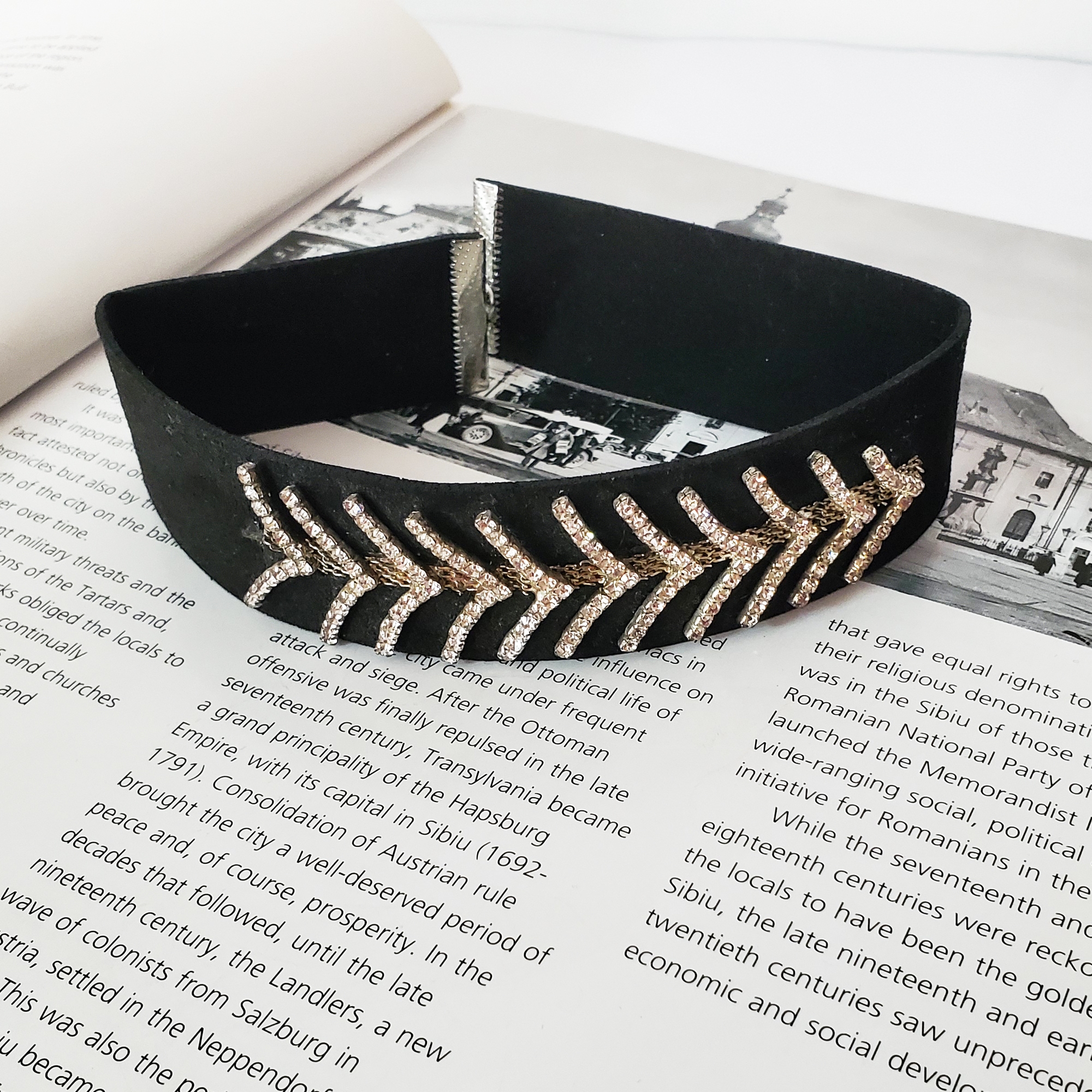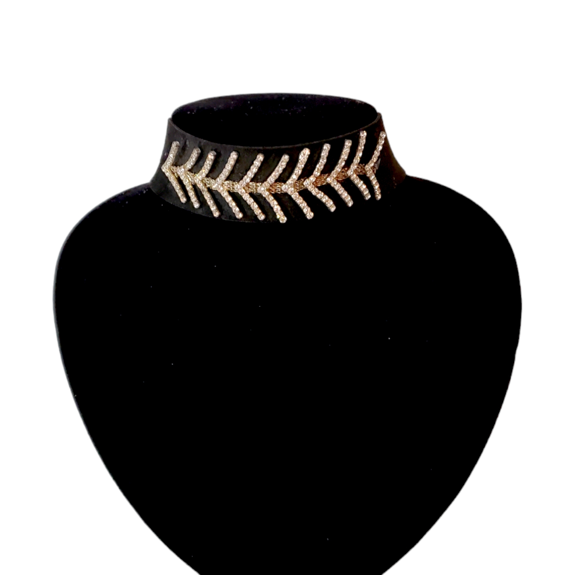 Choker lat pe baza din piele ecologica. In partea din fata sunt ramuri din strasuri pe montura argintie. Se inchide la spate cu sistem metalic tip cheita pe lant reglabil. Se livreaza in sac textil pentru bijuterii.