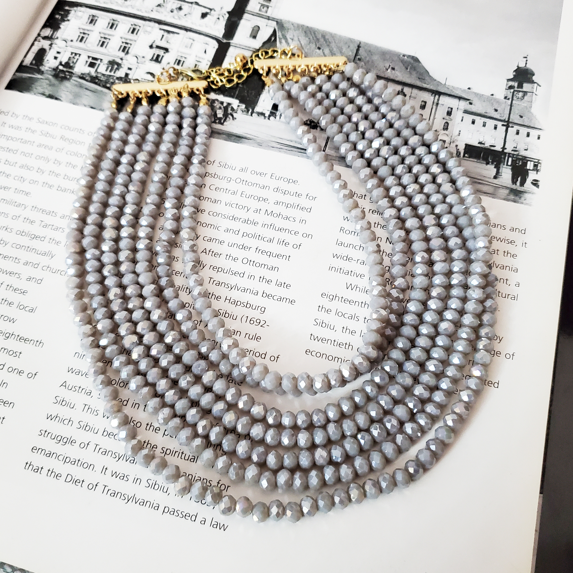 Colier cu 7 randuri de cristale de sticla, potrivit pentru persoane ce prefera culori discrete. Este potrivit atat pentru tinute de zi cat pentru tinute de seara, si se asorteaza bine atat cu bijuterii din argint.