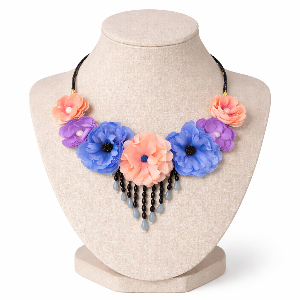 Imagineaza-ti o gradina care a decis sa se mute direct pe gatul tau. Petale care nu stau cumintele, flori care cer atentie si un aer usor magic, de parca tocmai ai pasit intr-un basm modern. Acesta este colierul statement floral care nu stie sa fie discret si nici nu isi doreste.