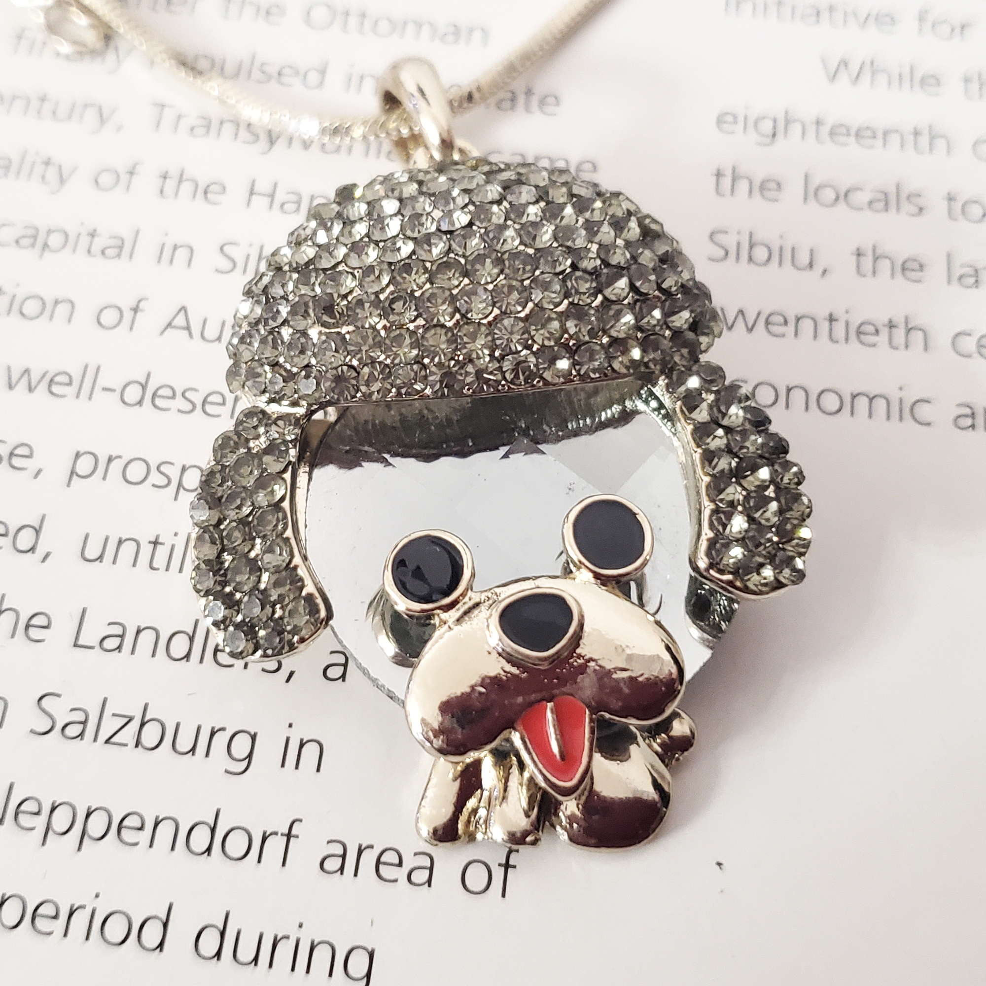 - Pandantiv 3D în formă de cățeluș, decorat cu strasuri de sticlă gri, montate cu grijă pentru un efect sclipitor