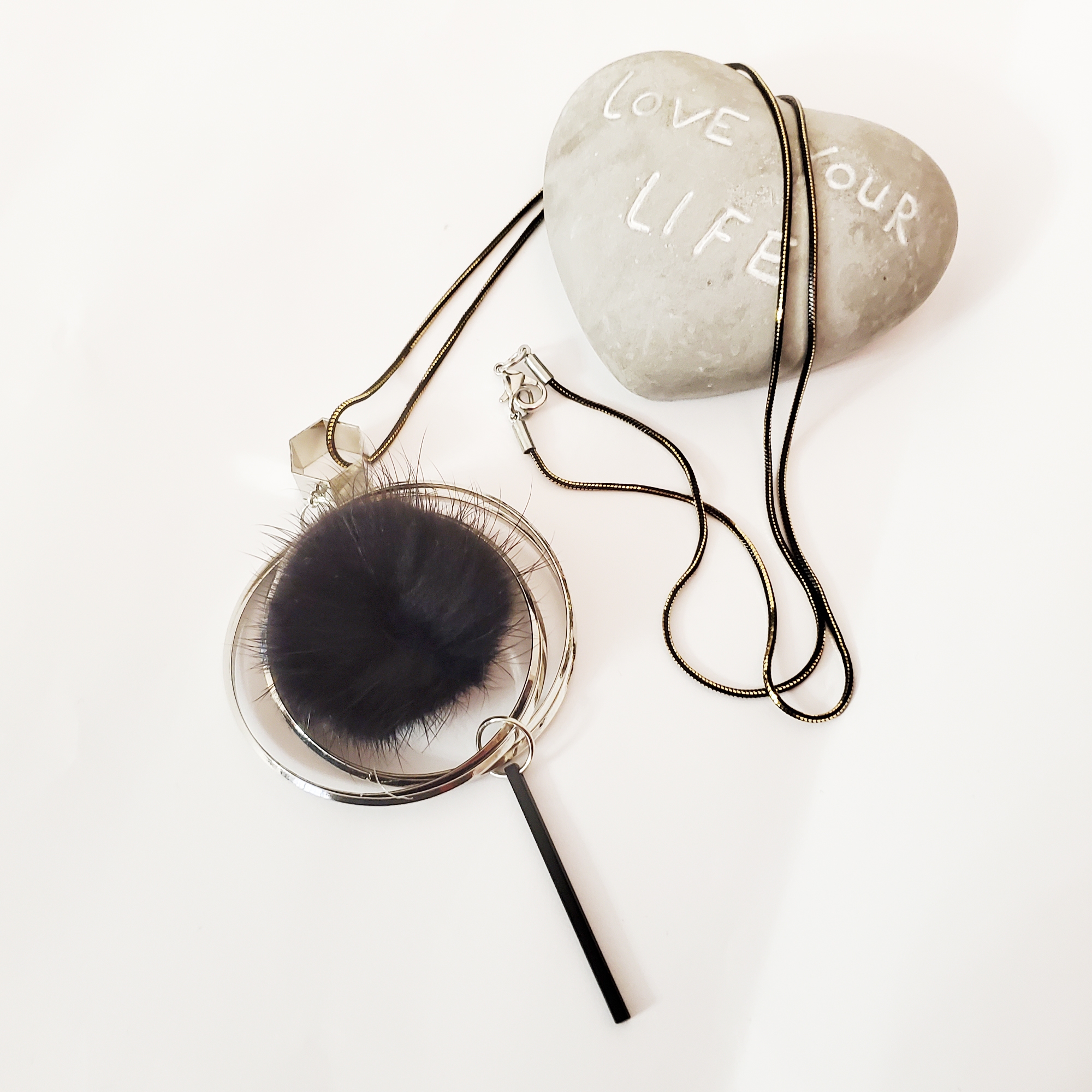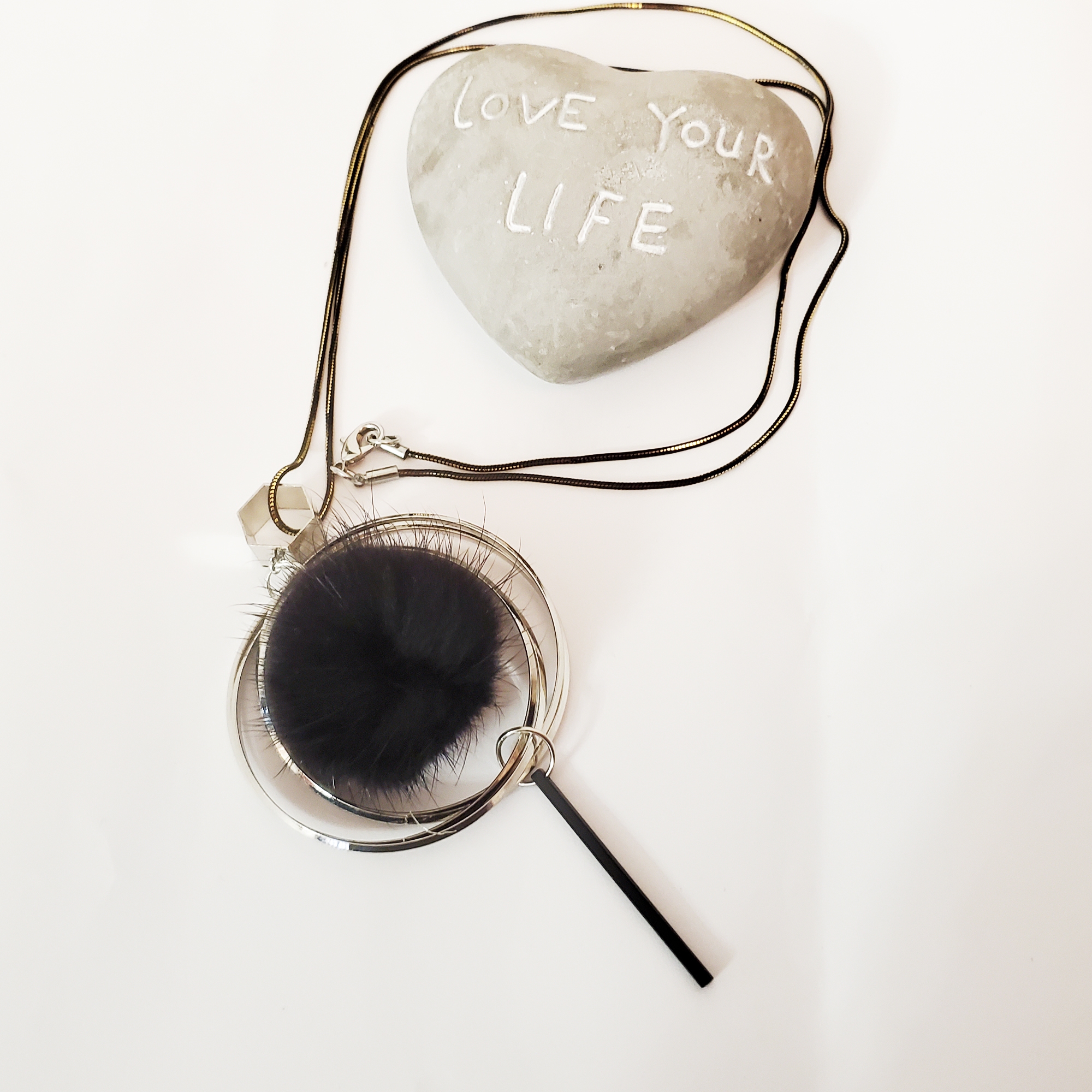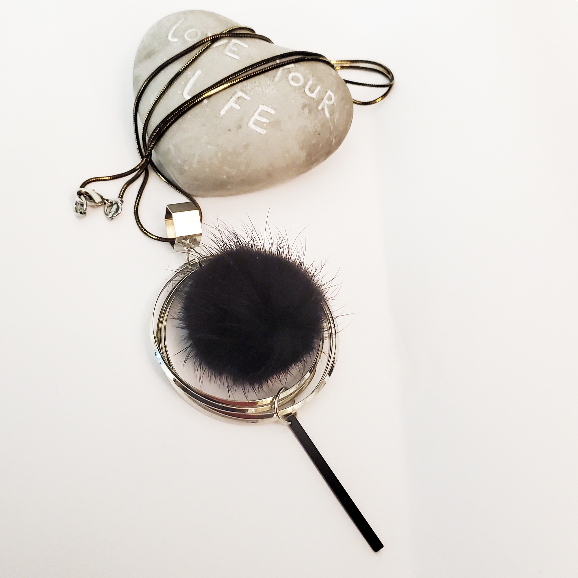 - Pandantiv geometric cu element pufos negru central, ce adaugă o notă ludică și rafinată designului.