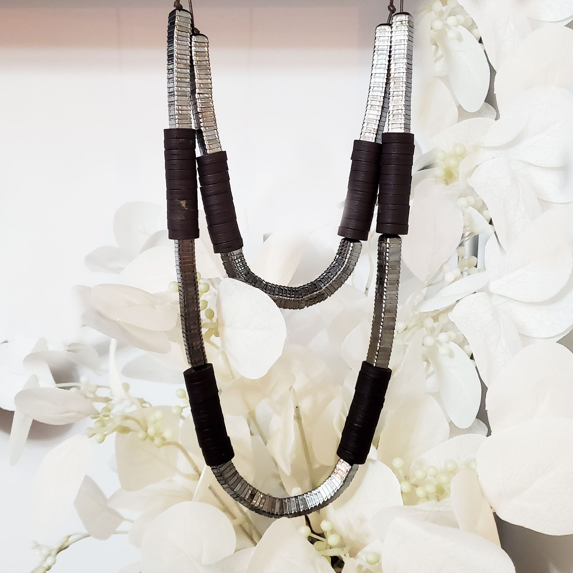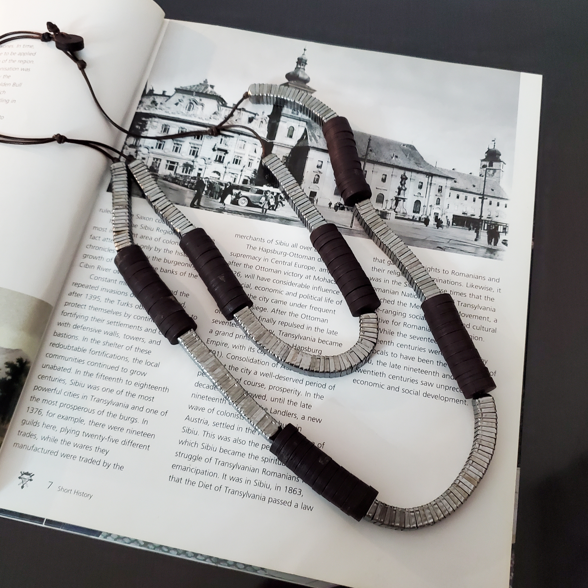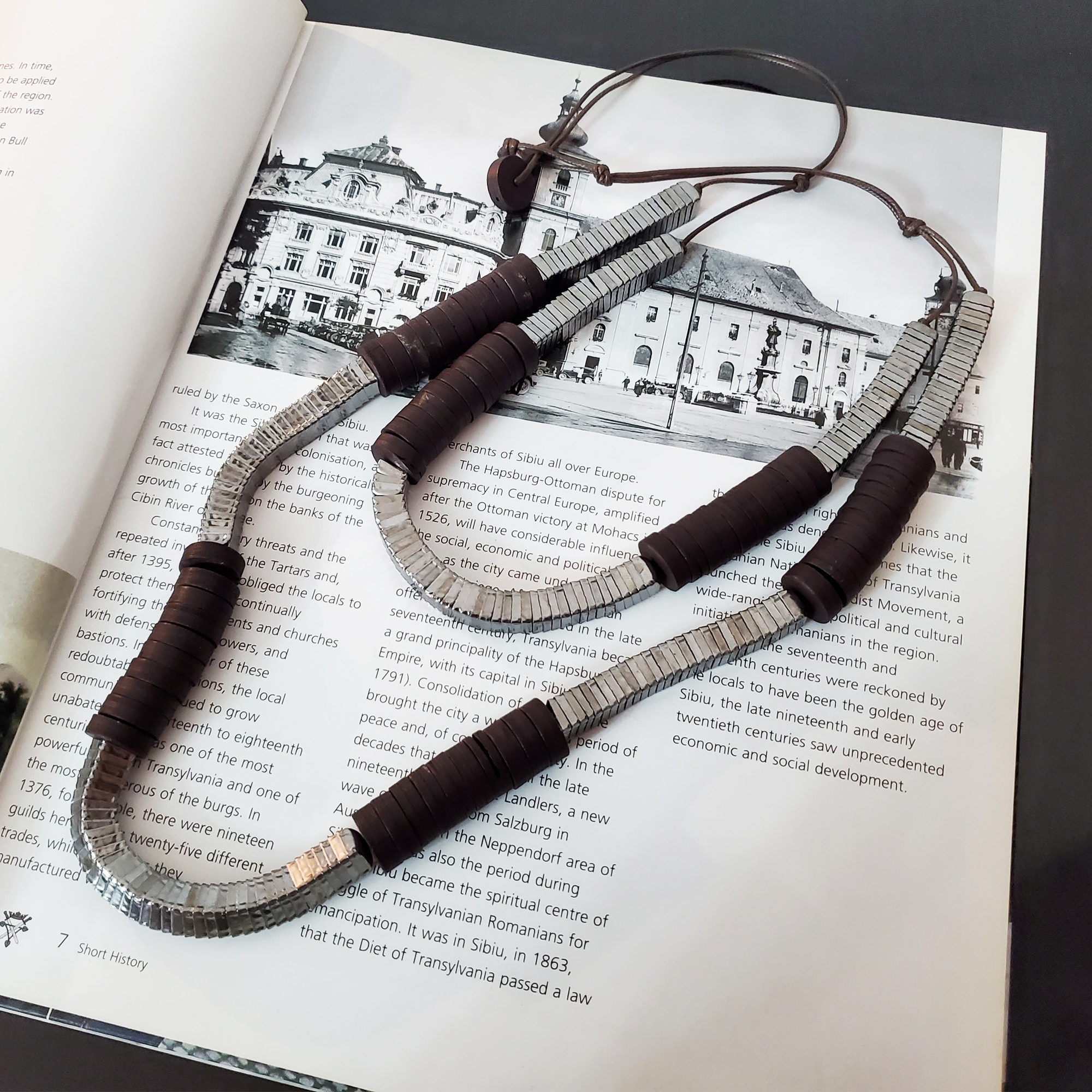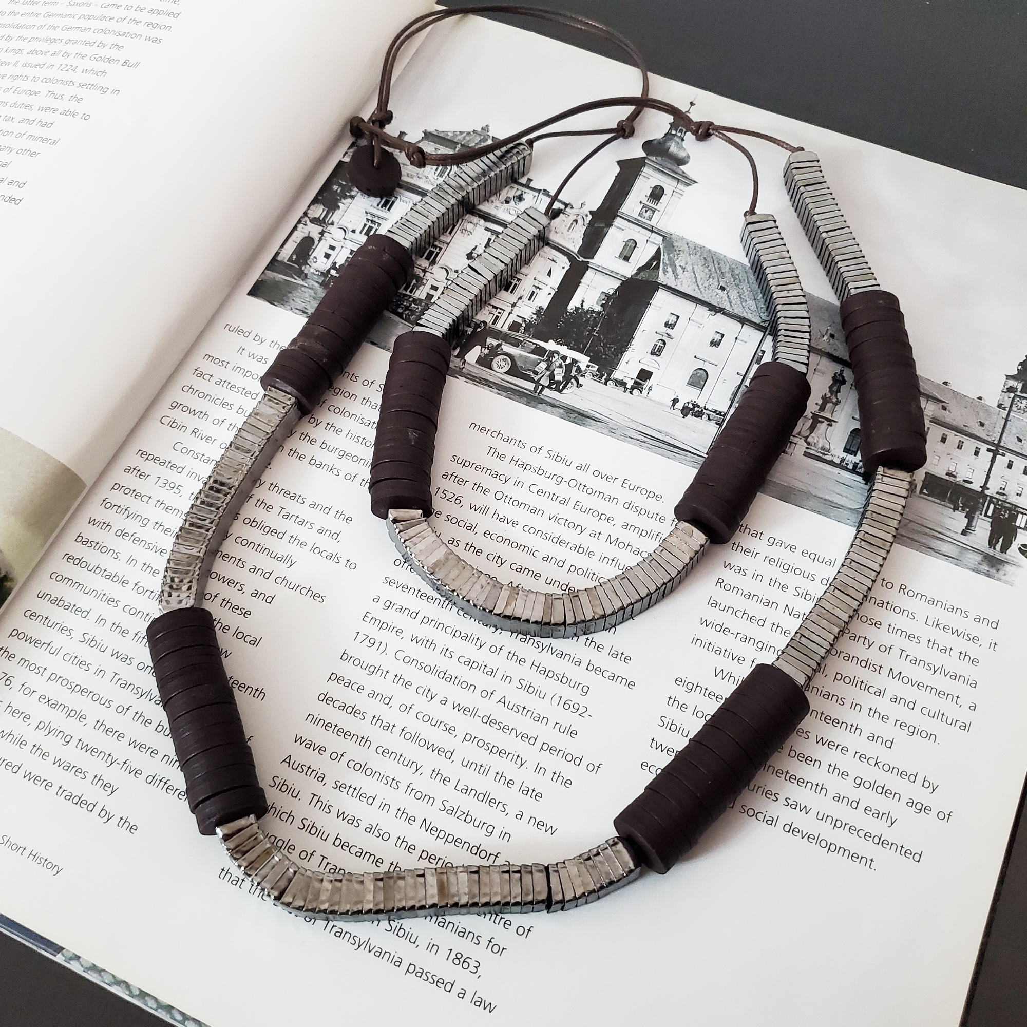Colier lung sub decolteu, realizat din doua siraguri. Ambele siraguri sunt din cuburi metalice din aliaj si cuburi de lemn maro. Colierul are un aspect natural, potrivit pentru tinute de zi, minimaliste si office. Se inchide la spate cu snur din piele. Se livreaza in sac textil pentru bijuterii.