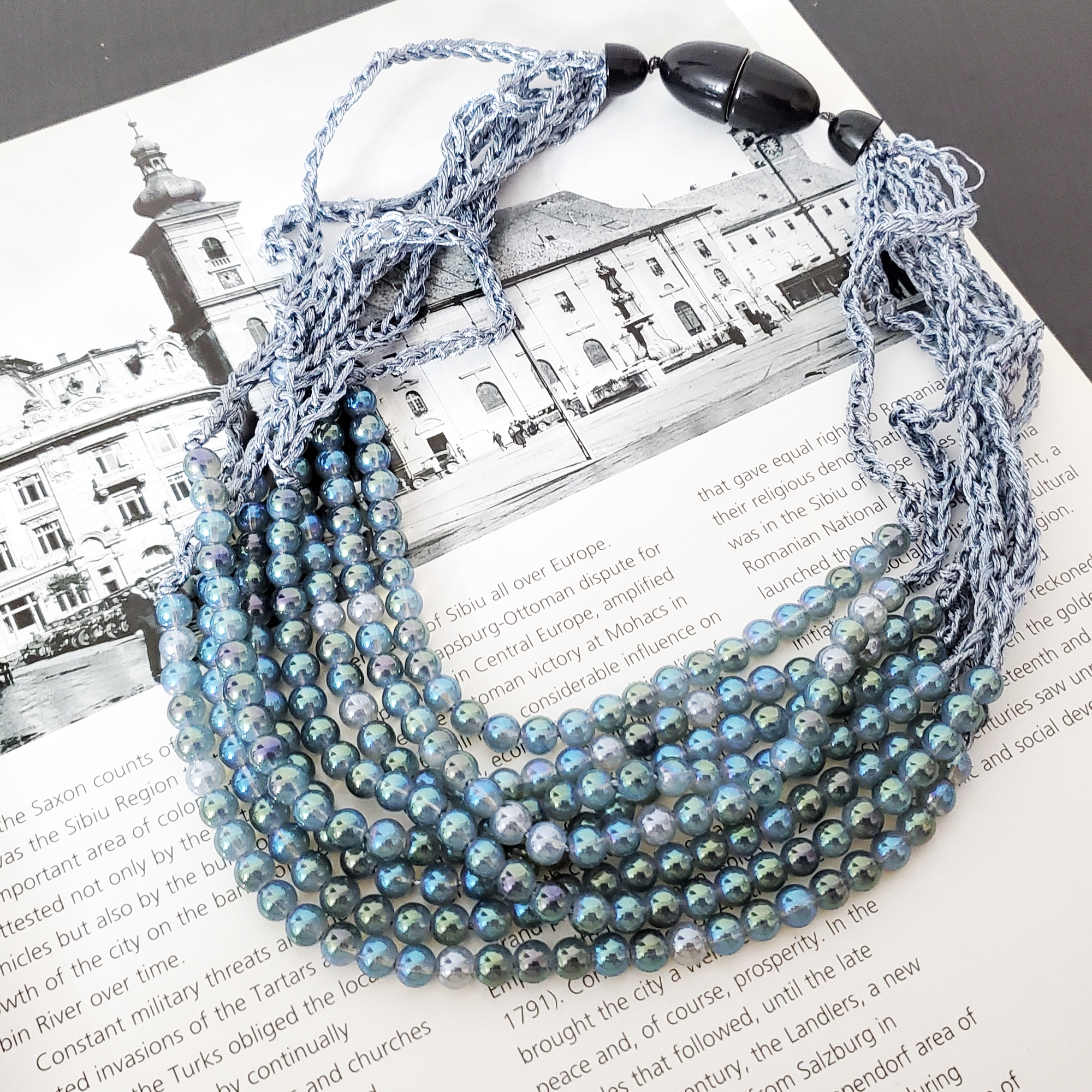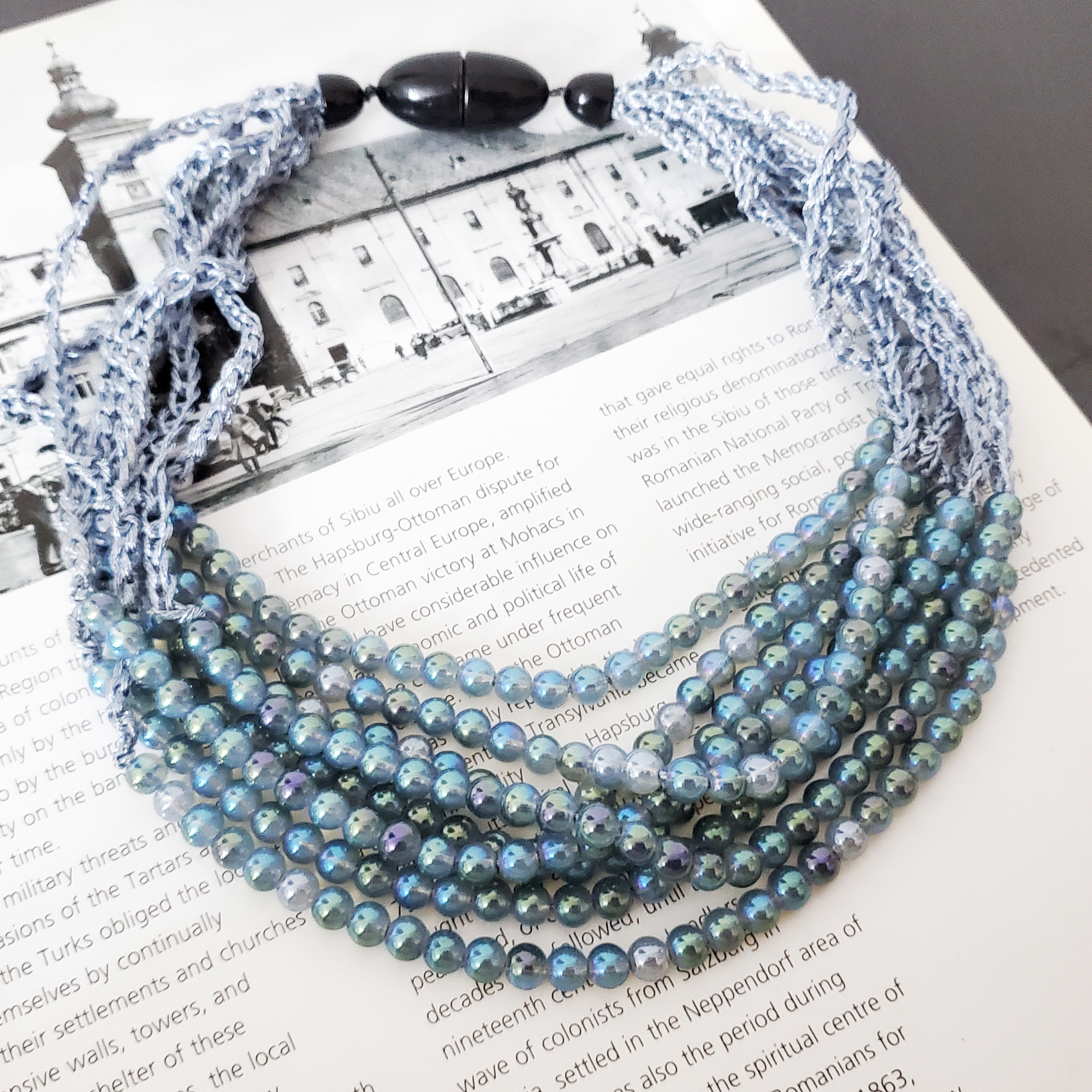 Colier de zi din perle cu reflexii tip piatra lunii, la baza gatului. Poarta povesti, nu doar accesorii