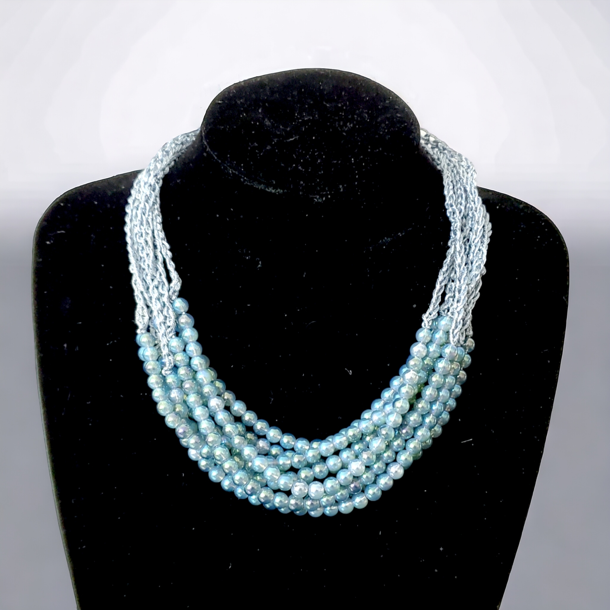 Colier de zi la baza gatului, realizat pe fir de macrame impletit albastru deschis. In total sunt 8 siraguri de perle cu efect de piatra lunii, cu multe reflexii in functie de lumina. Se inchide la spate cu sistem metalic reglabil pe lant. Produs de serie