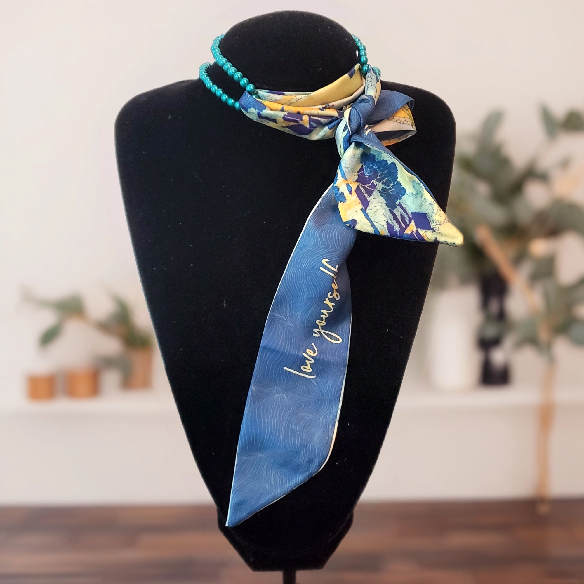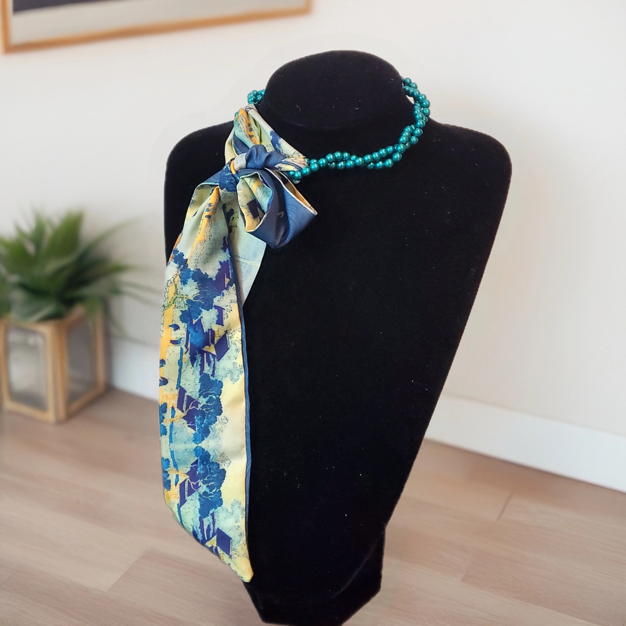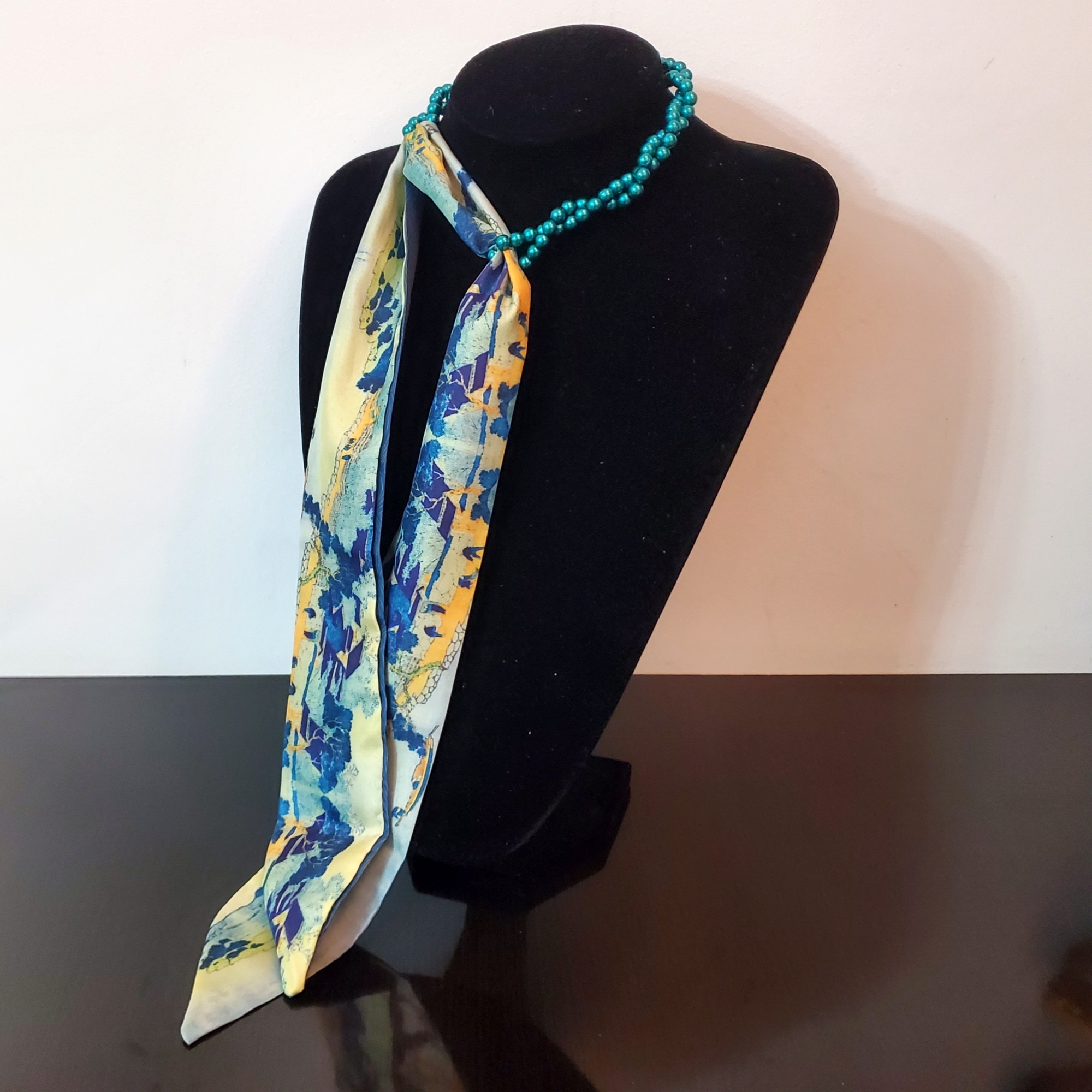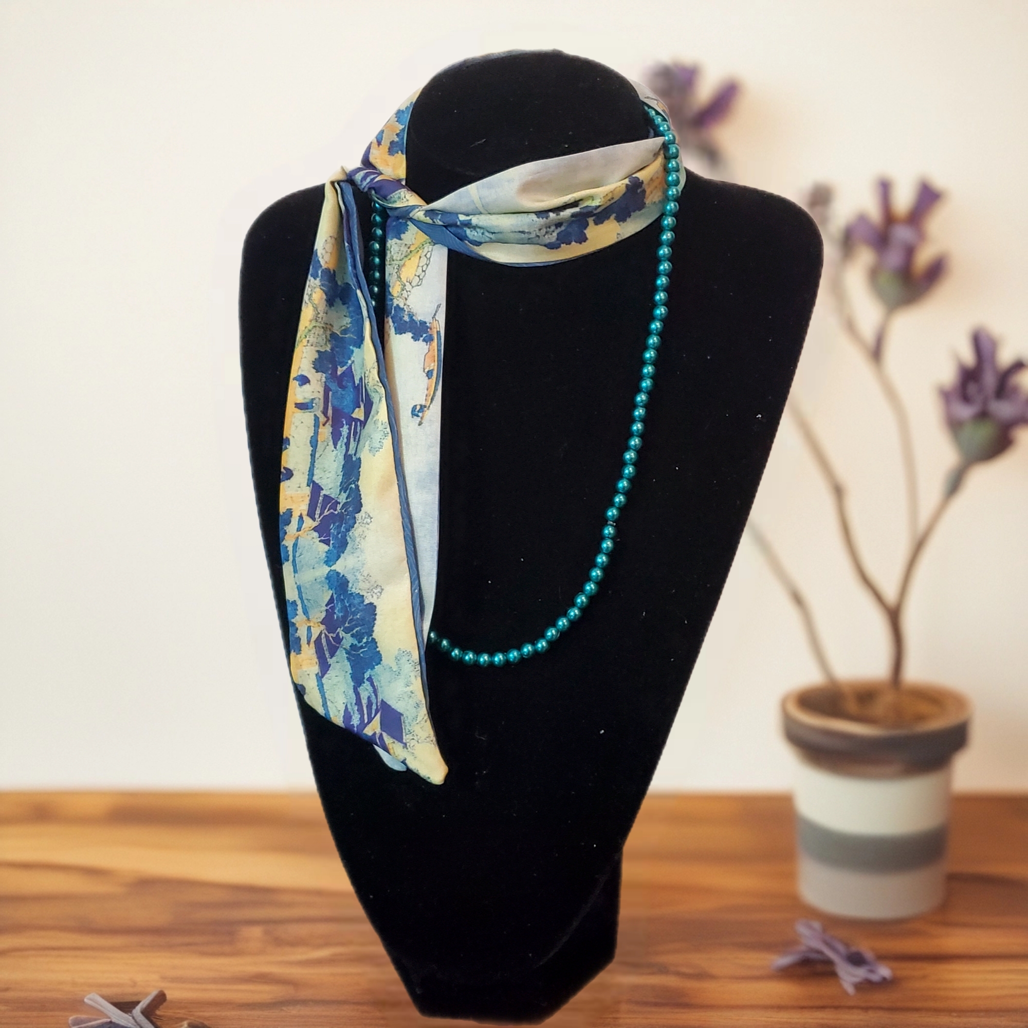 Set sirag de perle cu esarfa de matase in culori asortate, ce aduc un plus de eleganta atunci cand sunt purtate impreuna.
