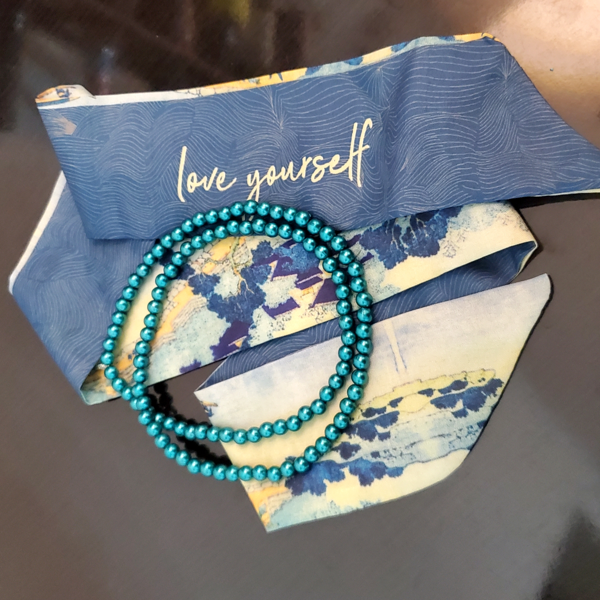 Setul contine un sirag de perle turcoaz si o esarfa din material fin tip matase, ce pot fi purtate impreuna in multe feluri.