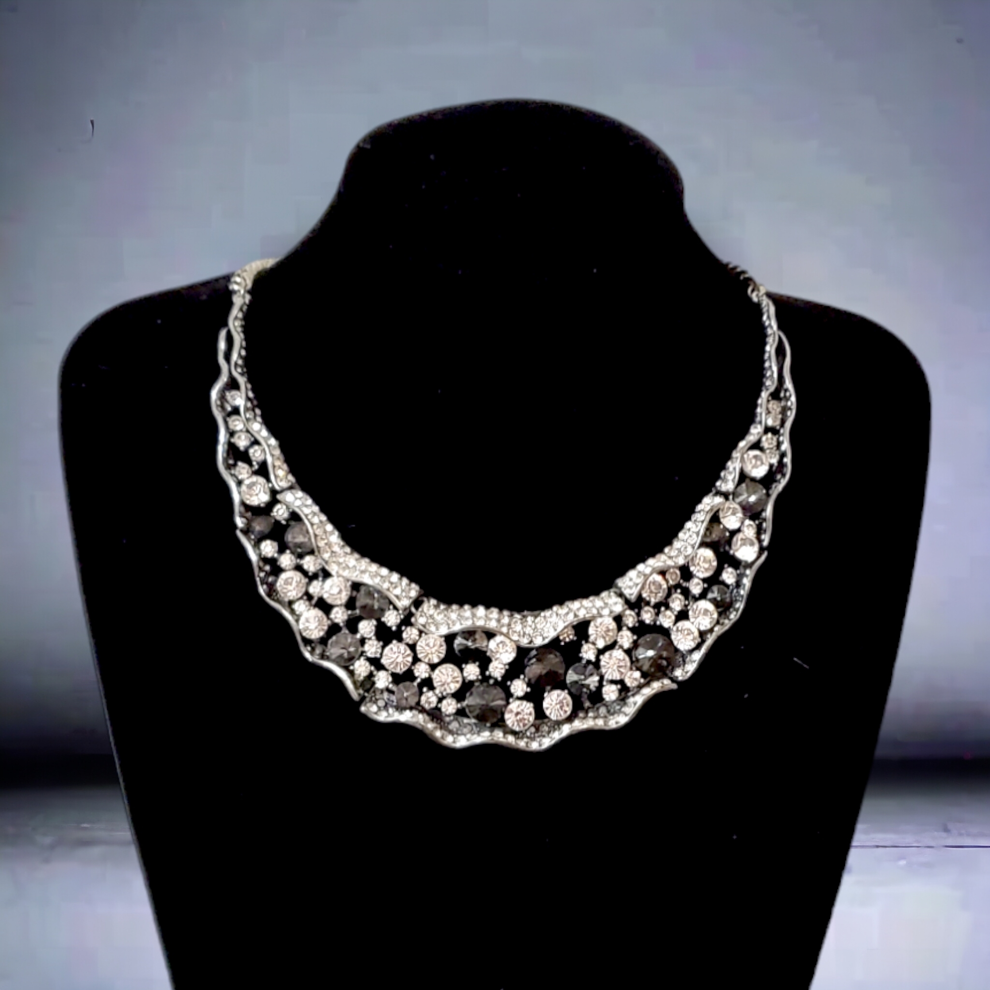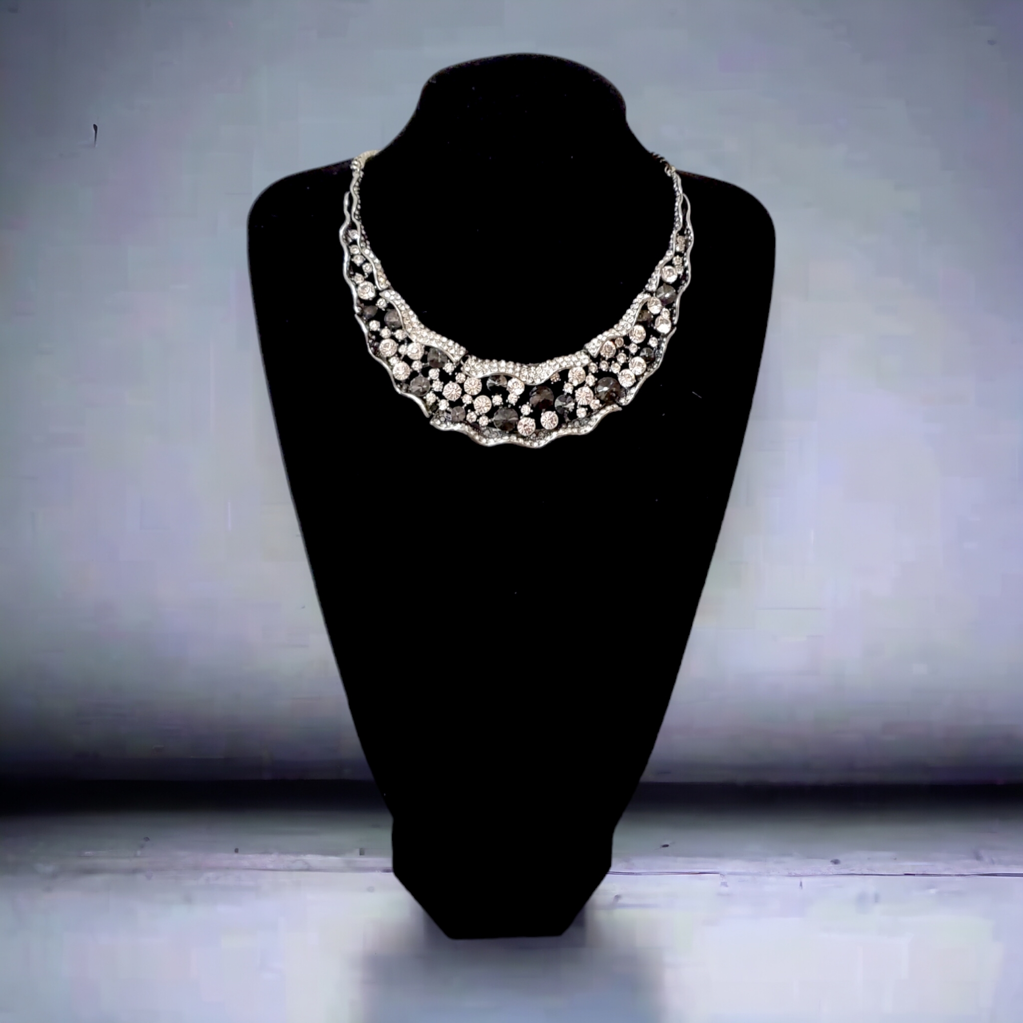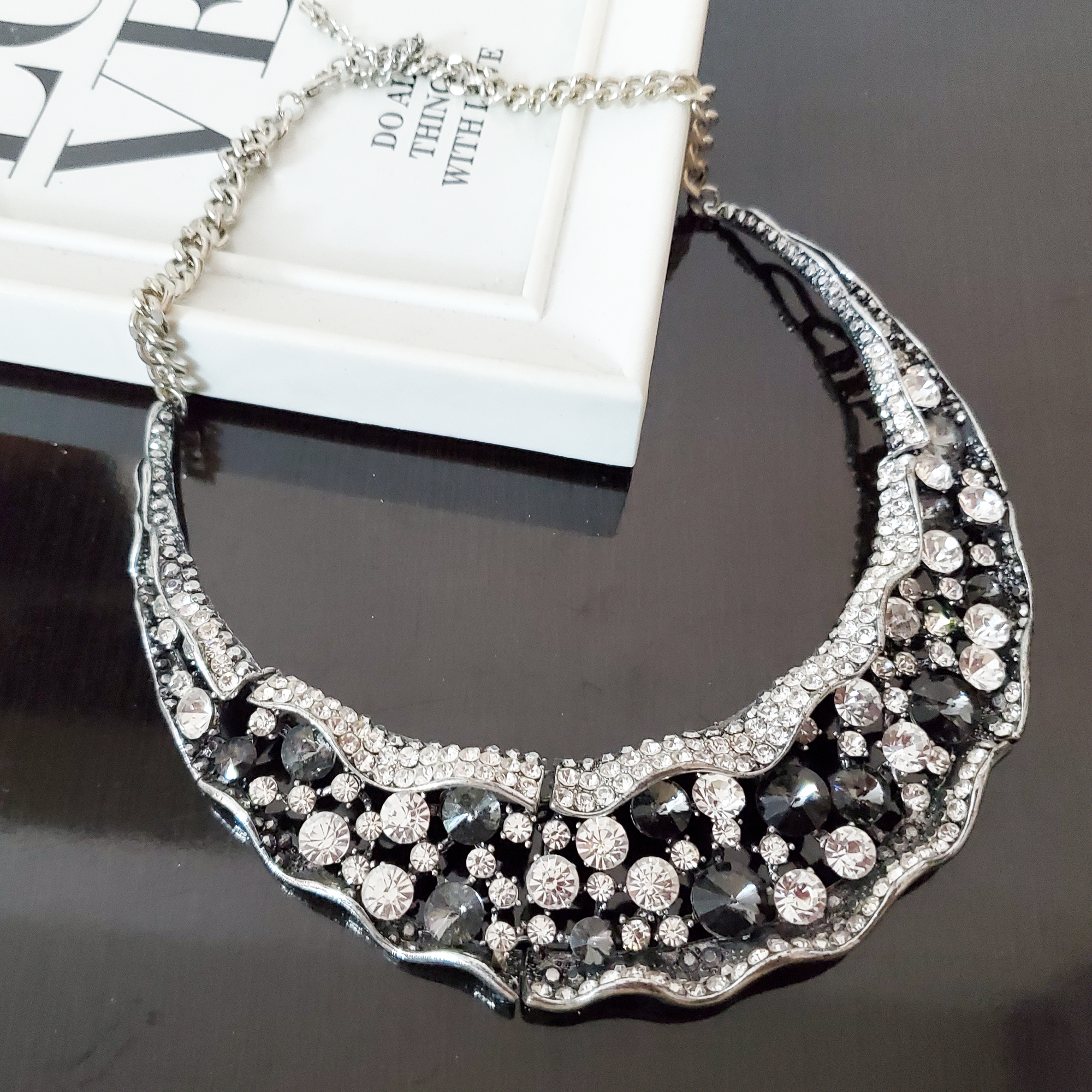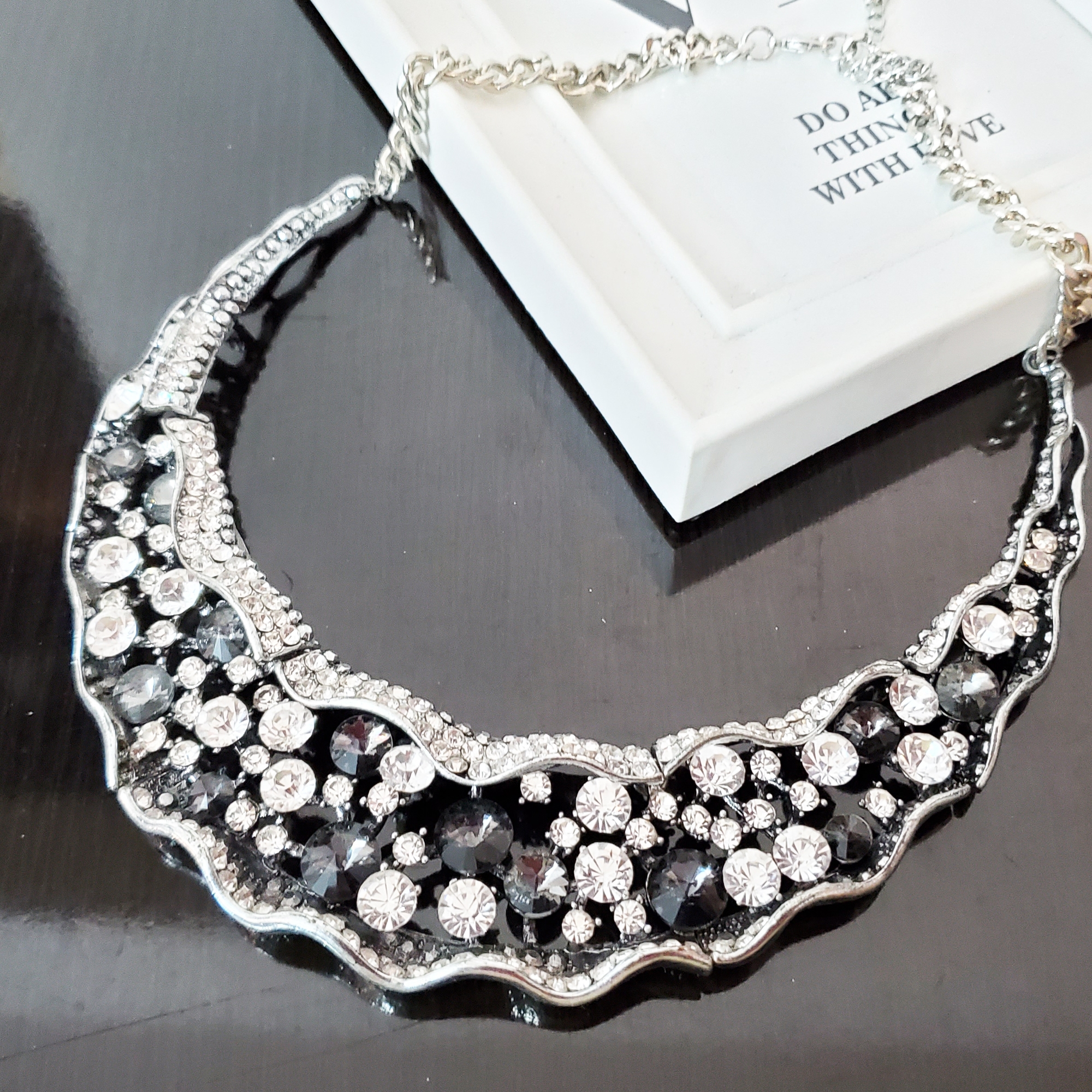 Colier statement metalic la baza gatului pe montura argintie. Pe colier sunt cristale de sticla in nuante de gri fumuriu si alb argintiu cu putere mare de reflexie, si strasuri albe. Se inchide la spate cu sistem metalic pe lant ajustabil. Este potrivit pentru tinute de ocazie, elegante. Datorita monturii argintii se poate asorta cu alte accesorii din argint. Produs de serie, disponibil in mai multe culori. Se livreaza in sac textil pentru bijuterii