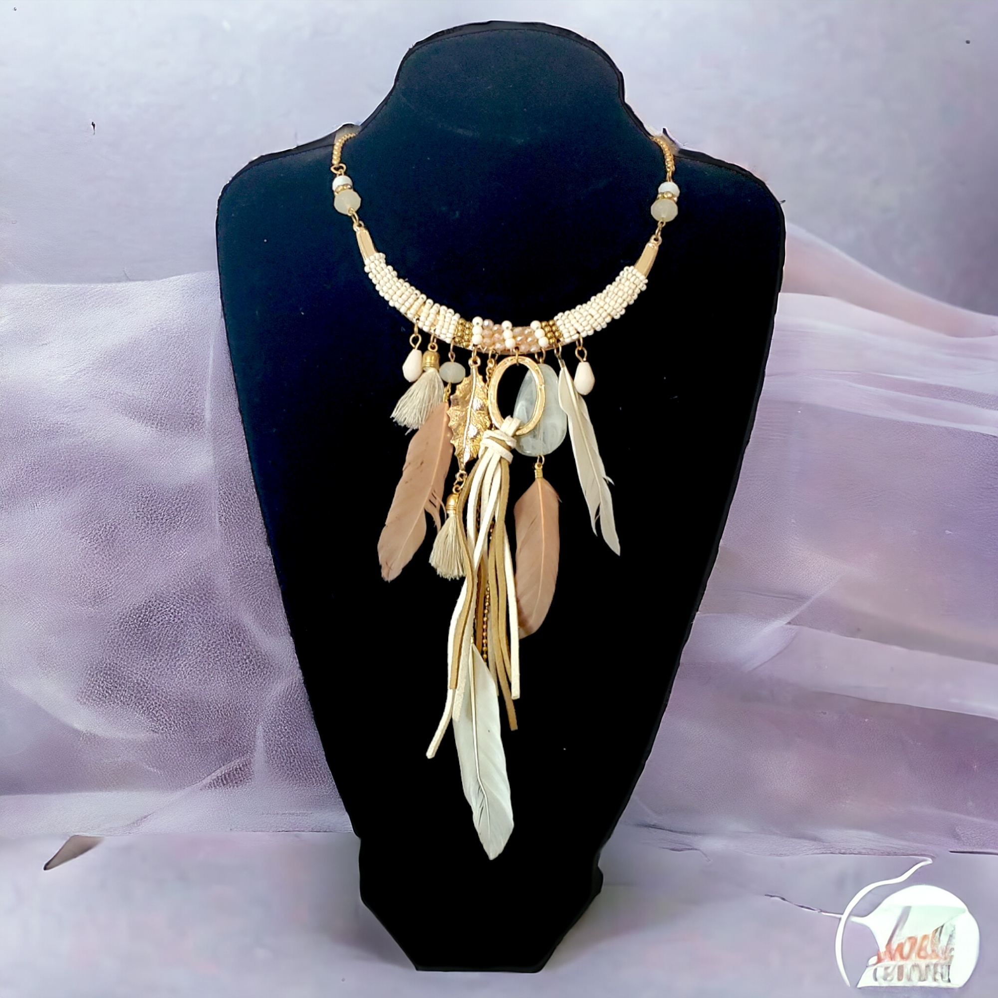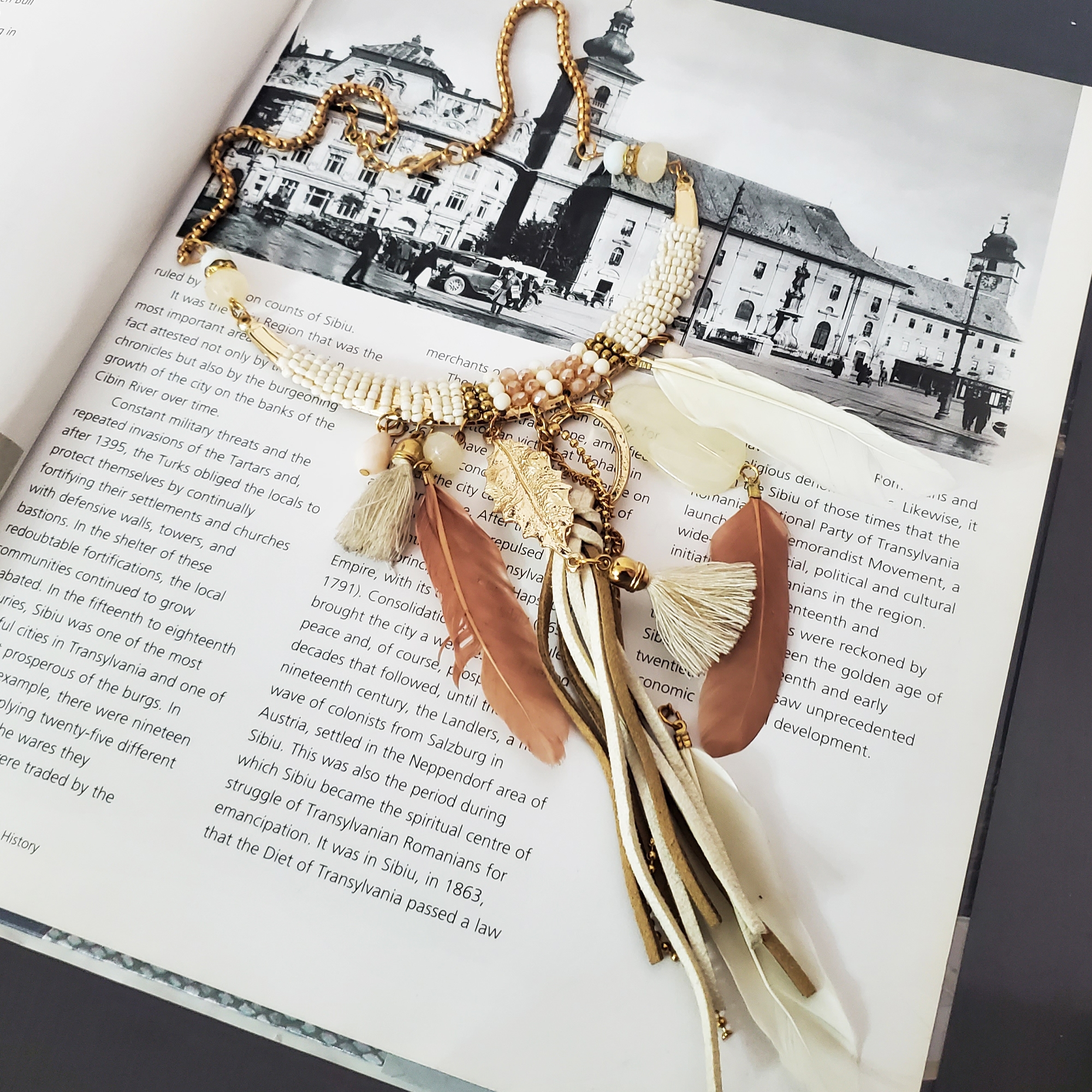 Colierul Feathers este la baza gatului, pe suport metalic imbracat in margelute. Pe suport sunt prinse materiale precum pene naturale, o pana metalica, ciucuri, cristale de sticla. Modelul are o combinatie unica de materiale, ce poate fi purtat la tinute lejere, casual. Nuantele sunt de crem maroniu. Se inchide la spate cu sistem metalic pe lant, reglabil. Produs de serie, disponibil in mai multe culori. Se livreaza in sac textil pentru bijuterii.