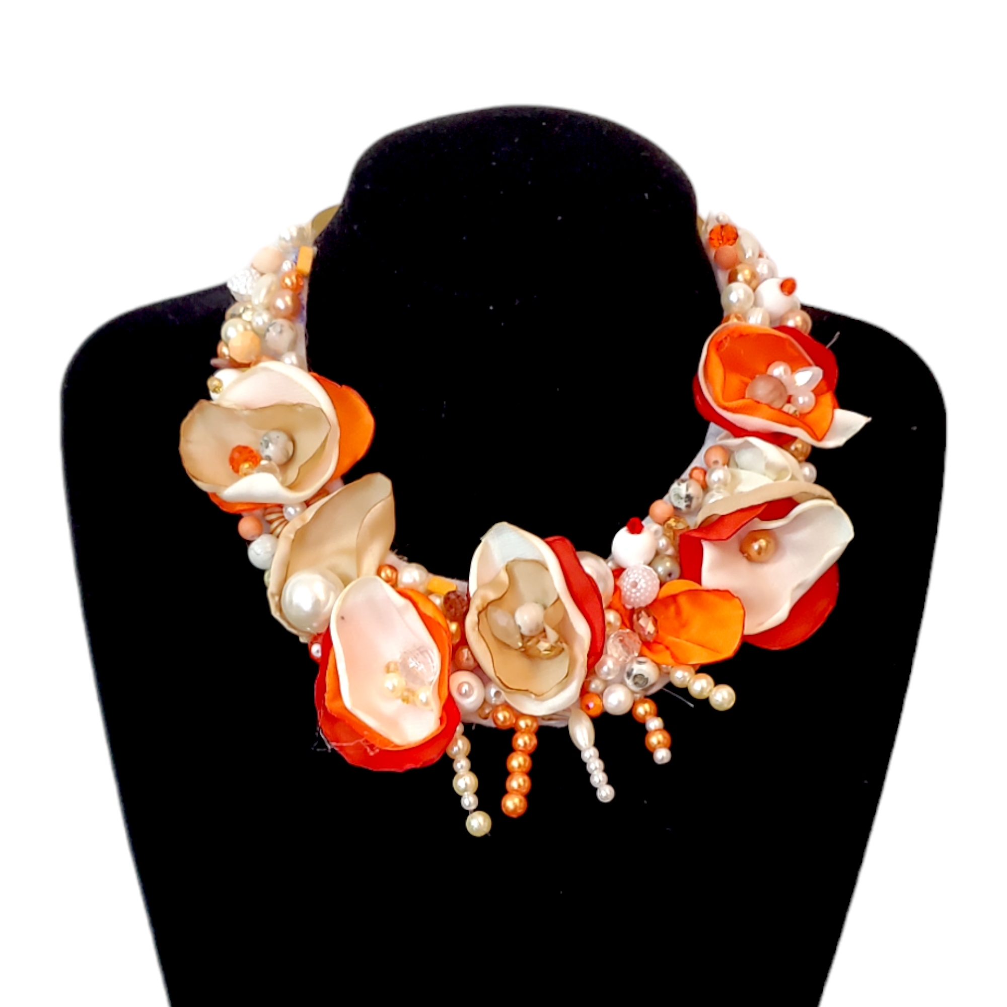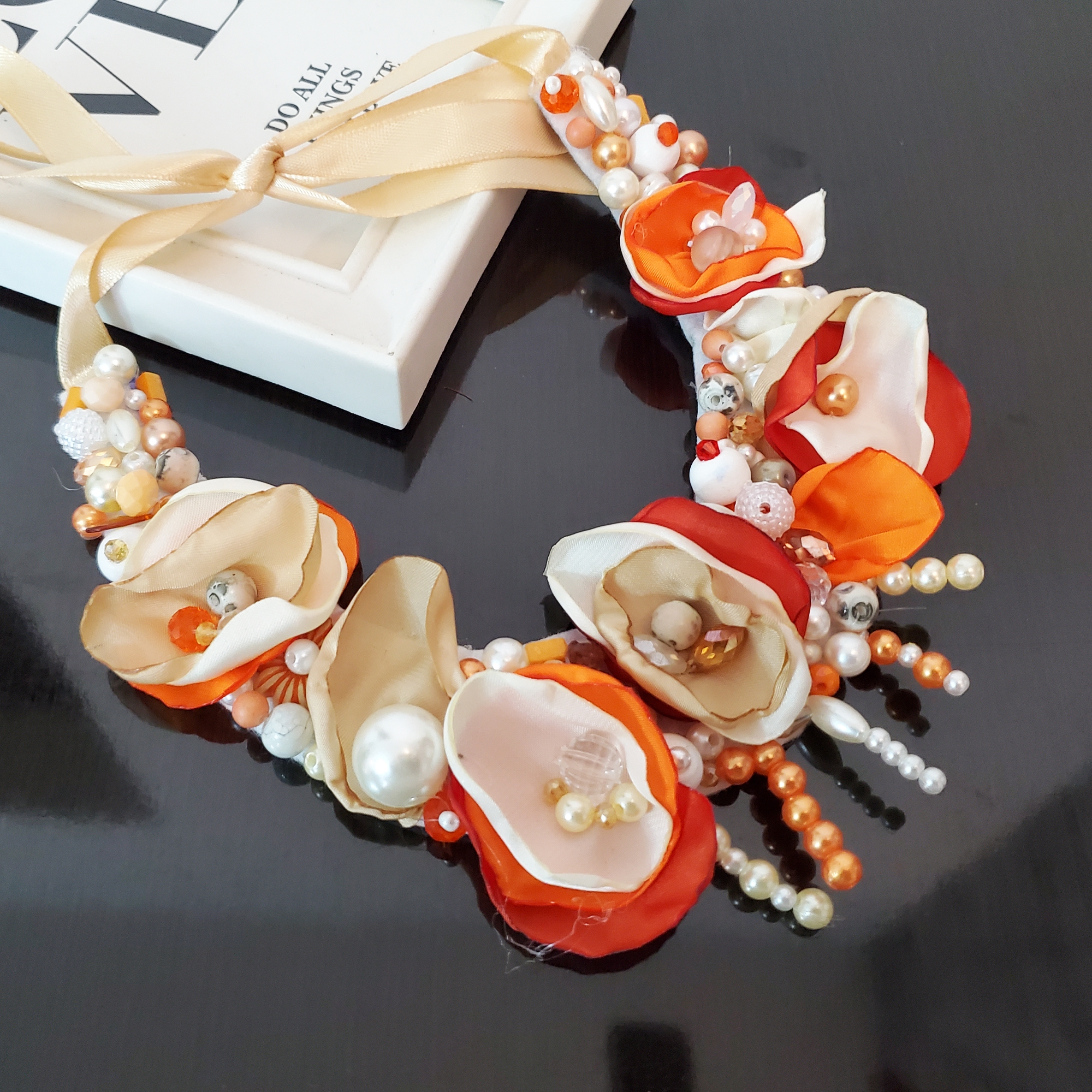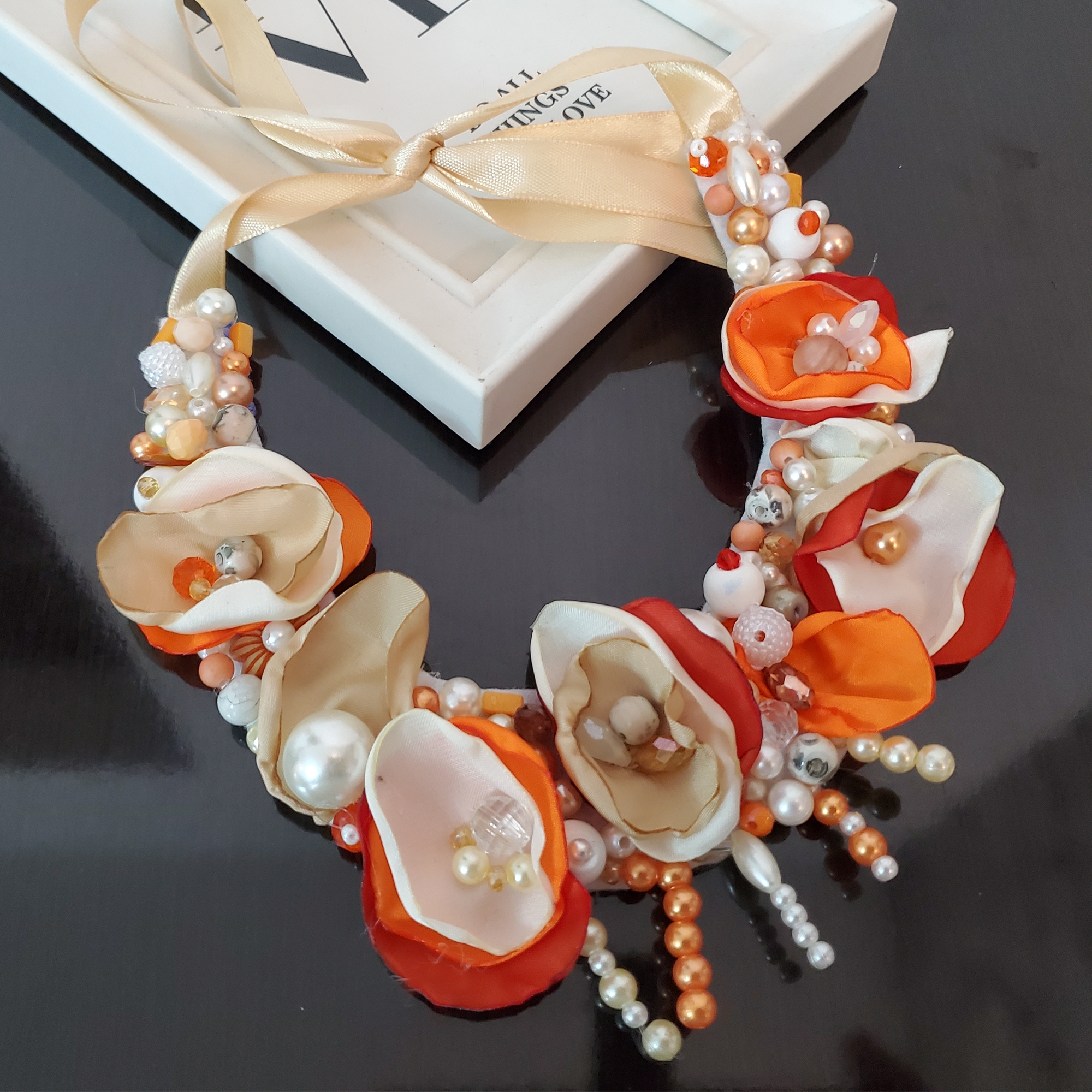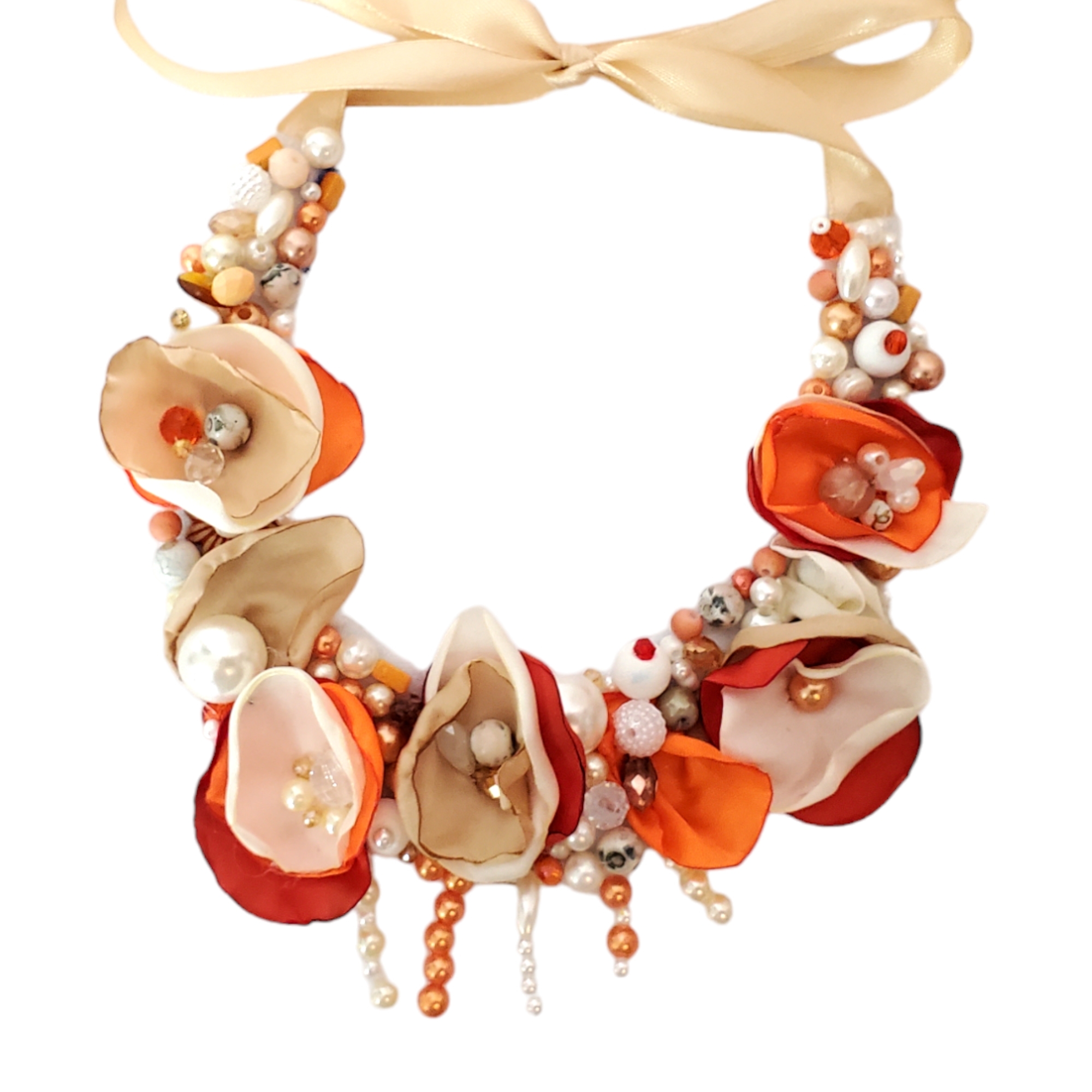 Colierul floral Elize light aduce povestea primăverii la baza gâtului tău—flori abstracte și frunze din mătase, cusute manual, cu perle și cristale strălucitoare. Design exclusiv, nuanțe calde de portocaliu, crem și alb, legat delicat cu panglică de satin crem. Poartă unicitate!