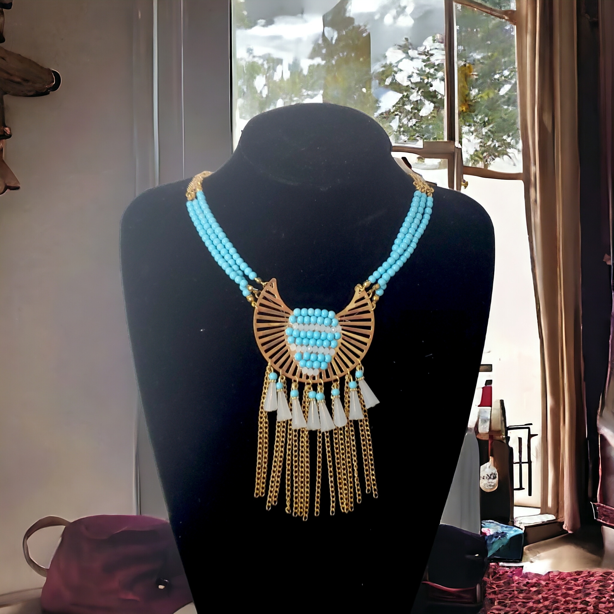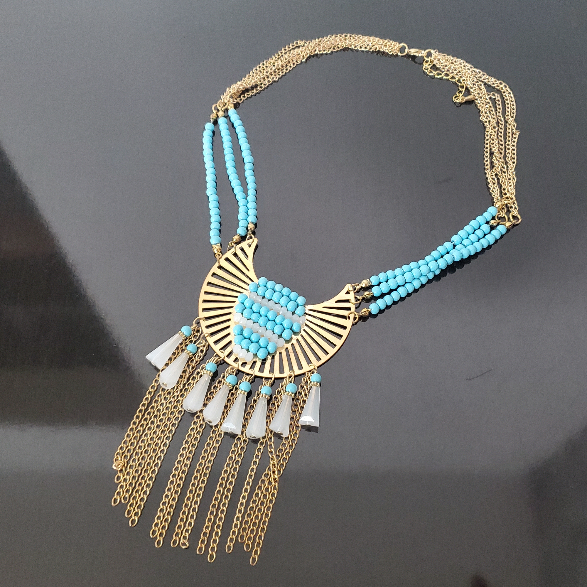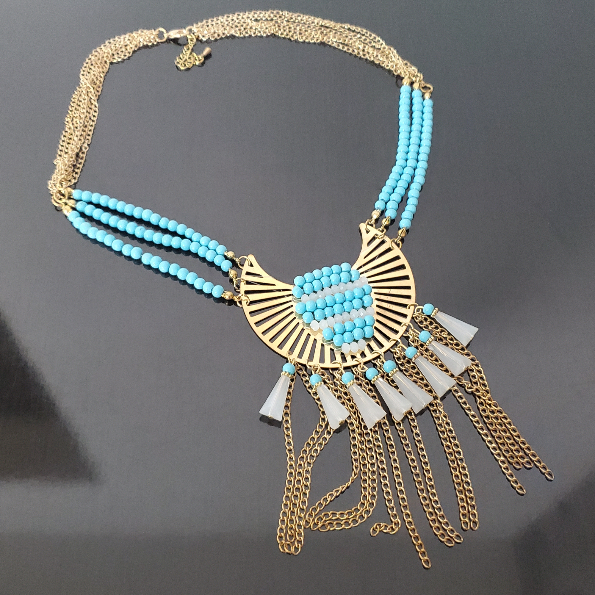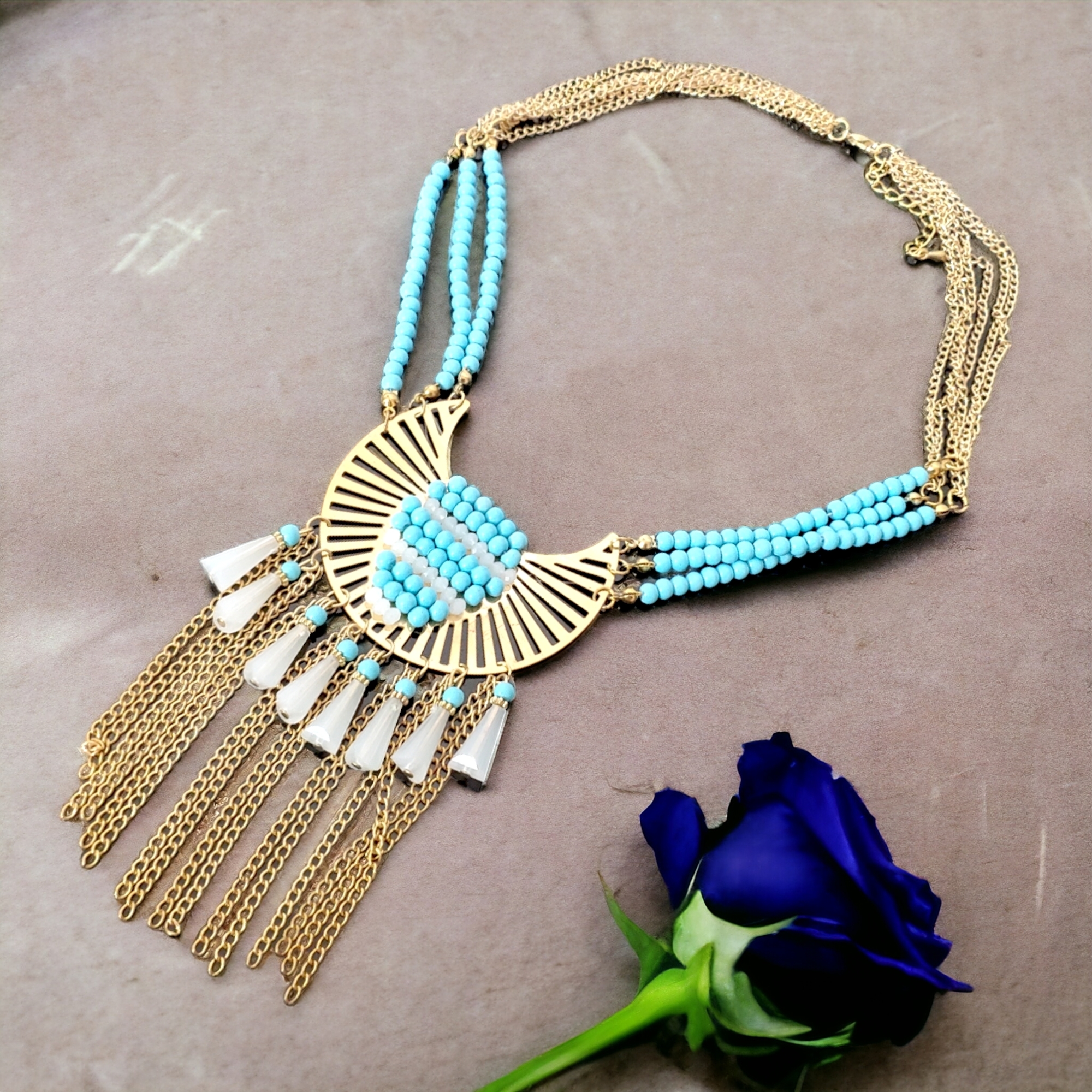 - Franjuri metalici aurii ce creează o mișcare fluidă și aduc un plus de dinamism colierului.
