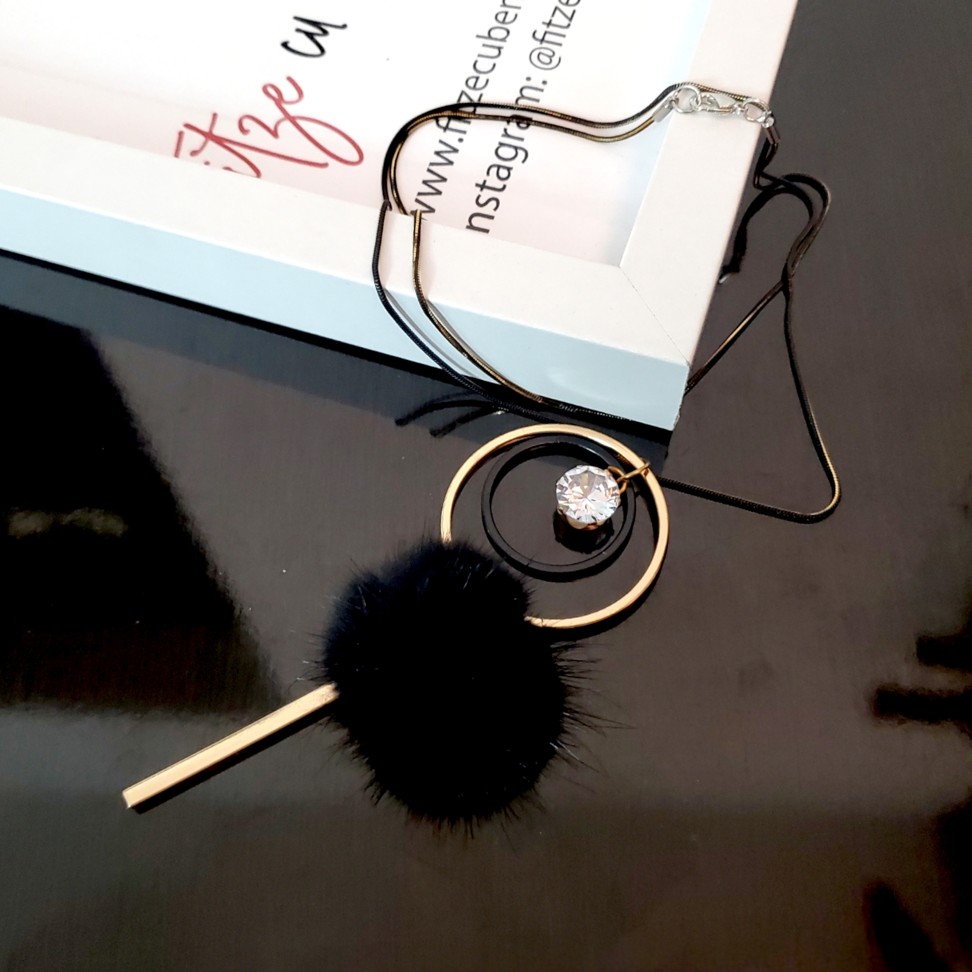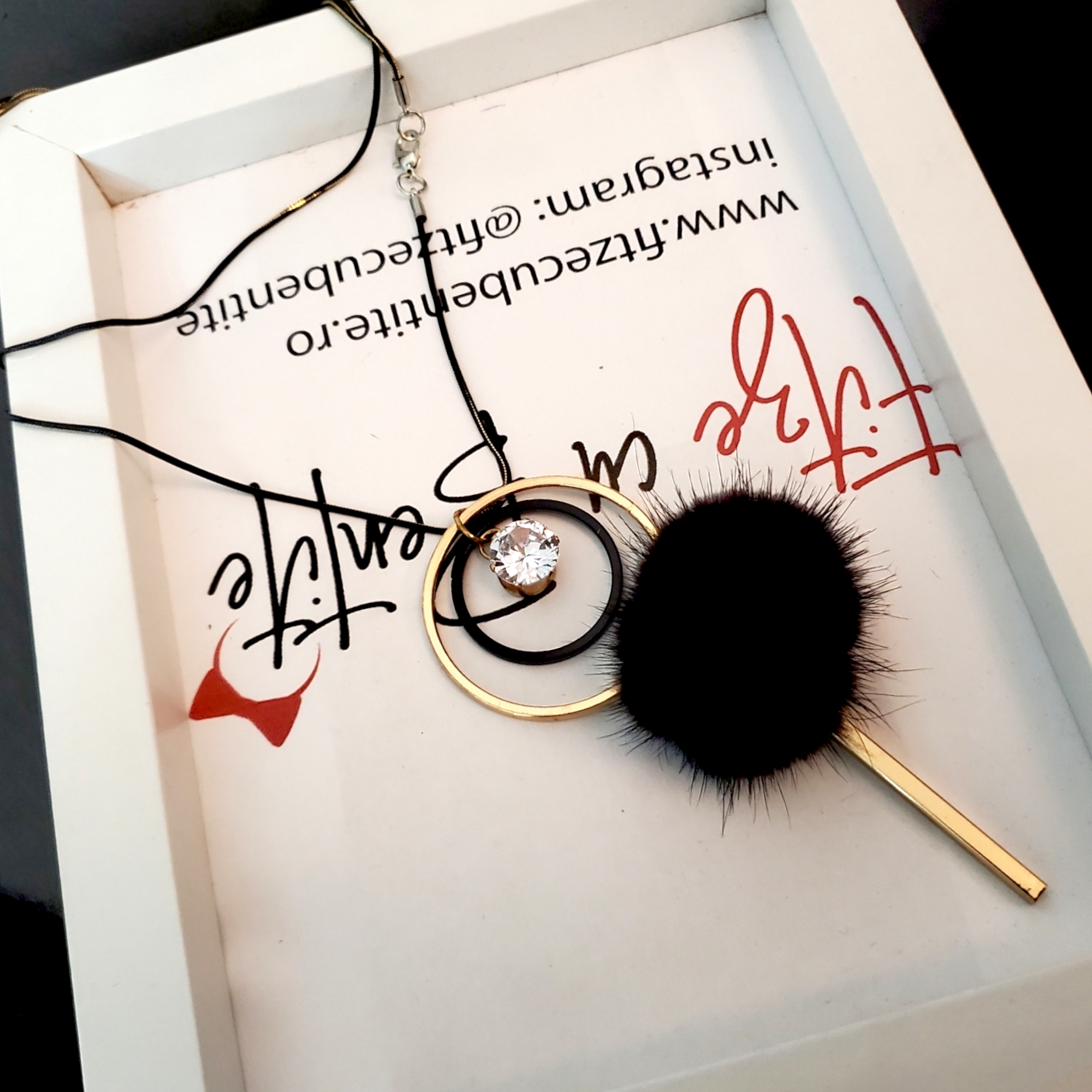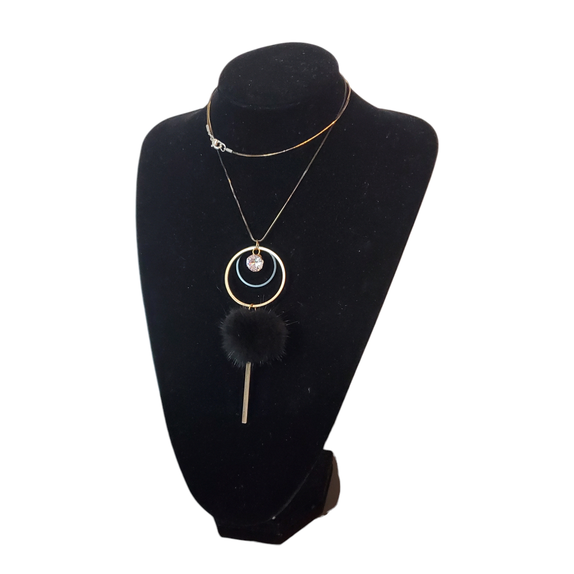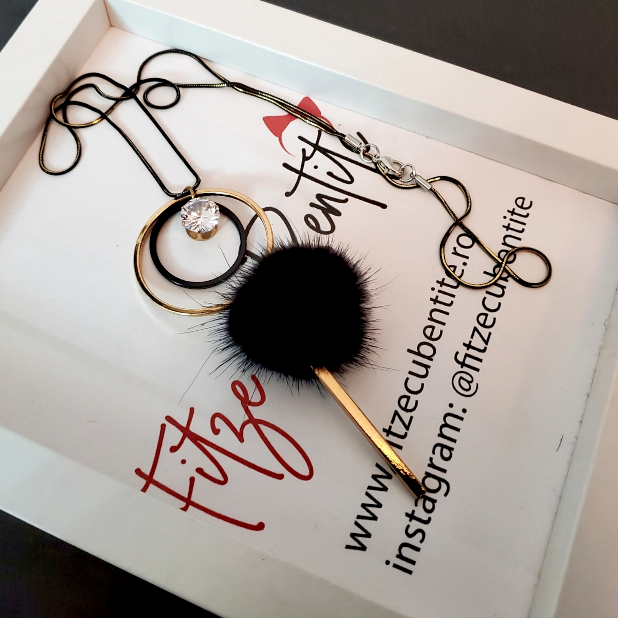 Lantisor cu lungime regabila, pe lant din metal rodiat pentru a obtine nuanta de negru/auriu. Pandantivul este geometric, cu un puf negru in mijloc si un cristal de sticla alb trasparent. Ca si lungime, lantisorul este pana la nivelul decolteului asezandu-se in V, dar poate fi asezat si de 2 ori, ca in prima imagine.