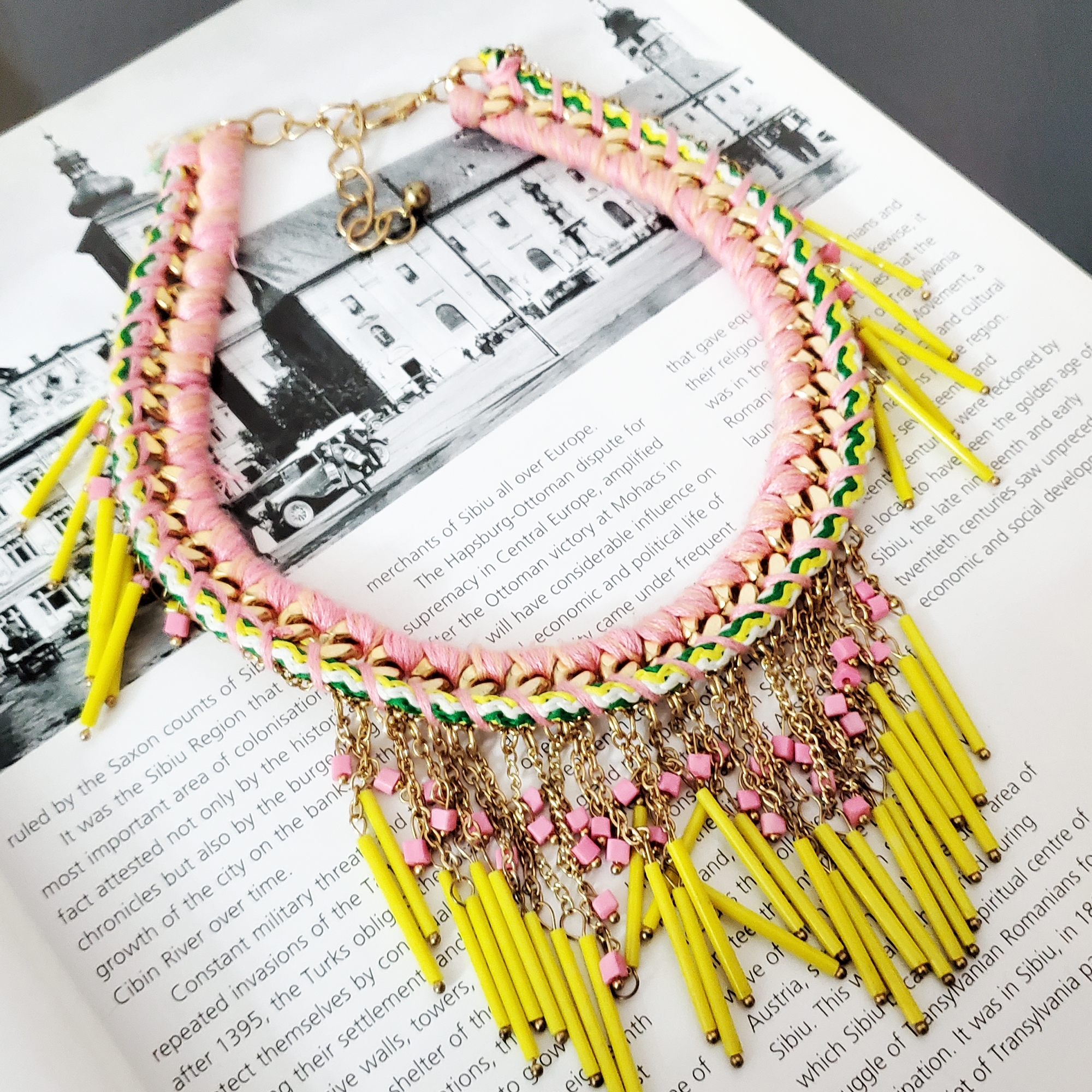 Colier ce are la baza un lant impletit cu material textil roz. Din impletitura pornesc lanturi fine cu cristale de sticla galbene si margelute. Combinatia de culori este dedicata persoanelor iubitoare de galben si roz. Se inchide la spate cu cheita metalica pe lant, reglabila. Produs de serie disponibil in doua culori.