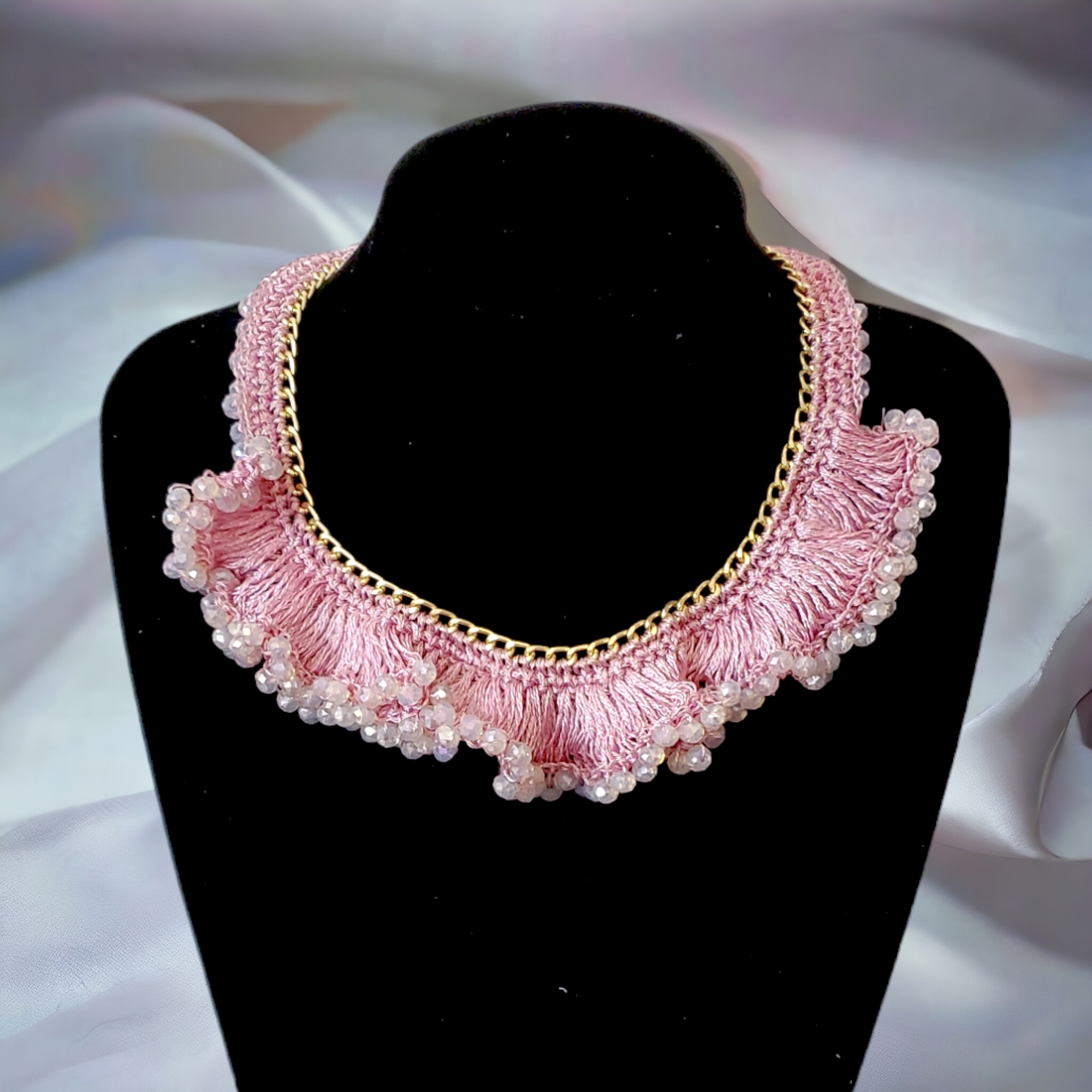 Colier la baza gatului, cu lant metalic la baza. Pe lant sunt cusute si innodate fire de macrame roz deschis cu cristale de sticla in capat. Colierul este volanat, cu pliuri mici, pentru un aspect boem. Se inchide la spate cu cheita metalica pe lant, reglabila. Produs de serie disponibil in doua culori.