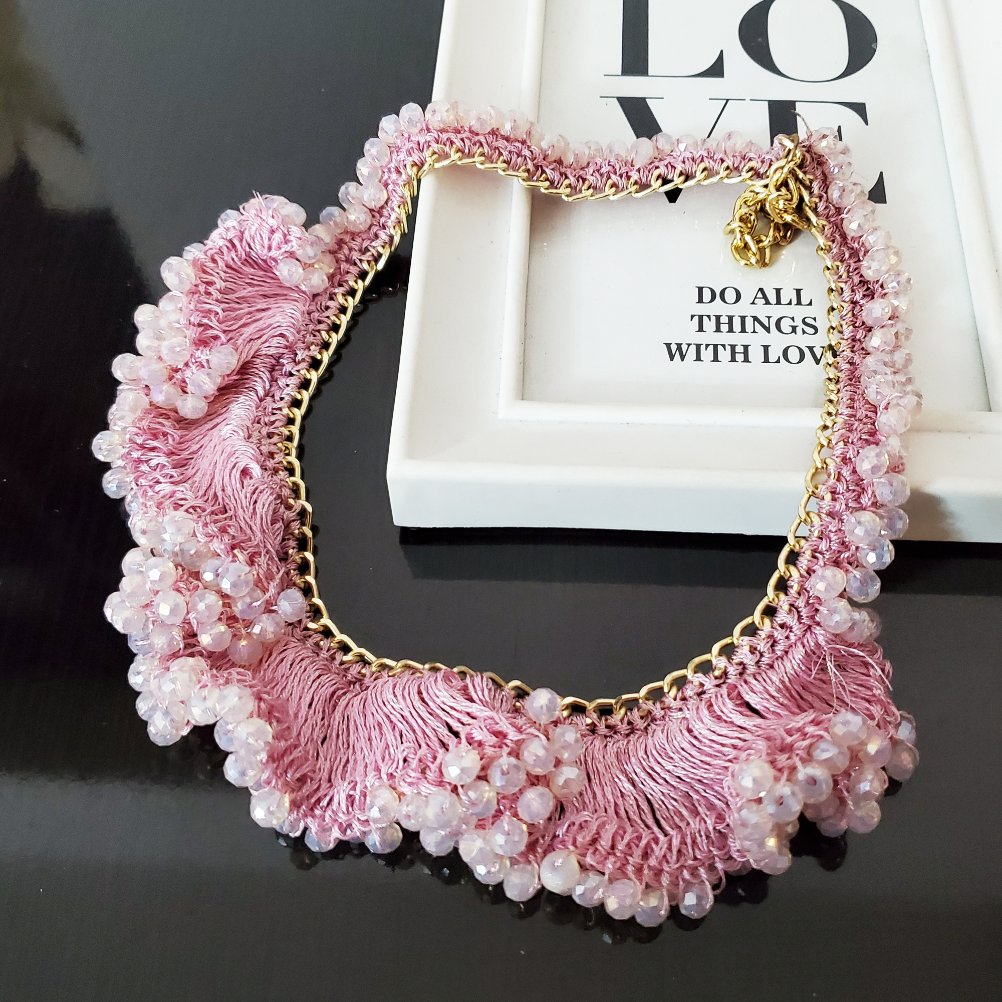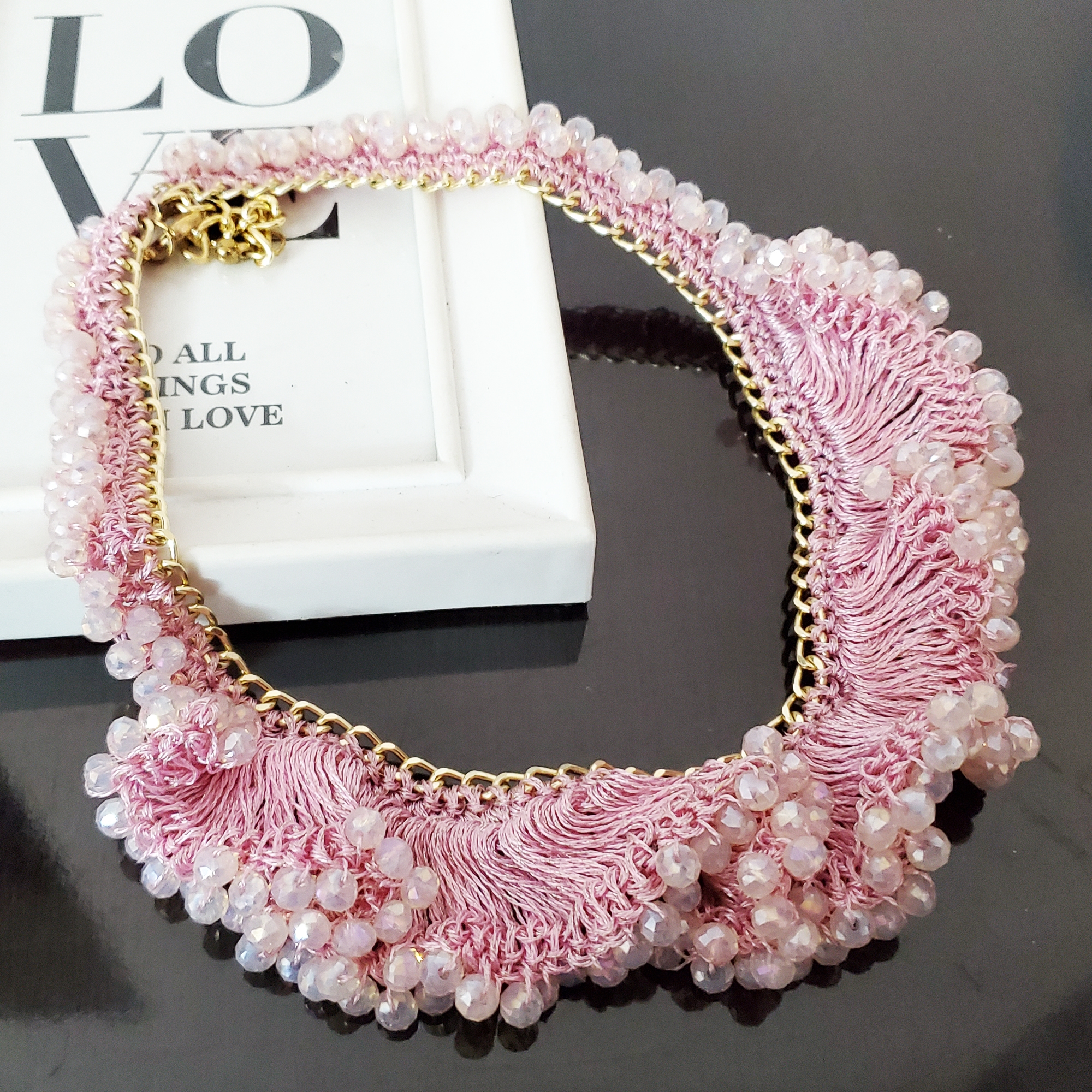 Colier cu aspect boem, volanat, din macrame roz deschis si cristale de sticla. Poarta povesti, nu doar accesorii
