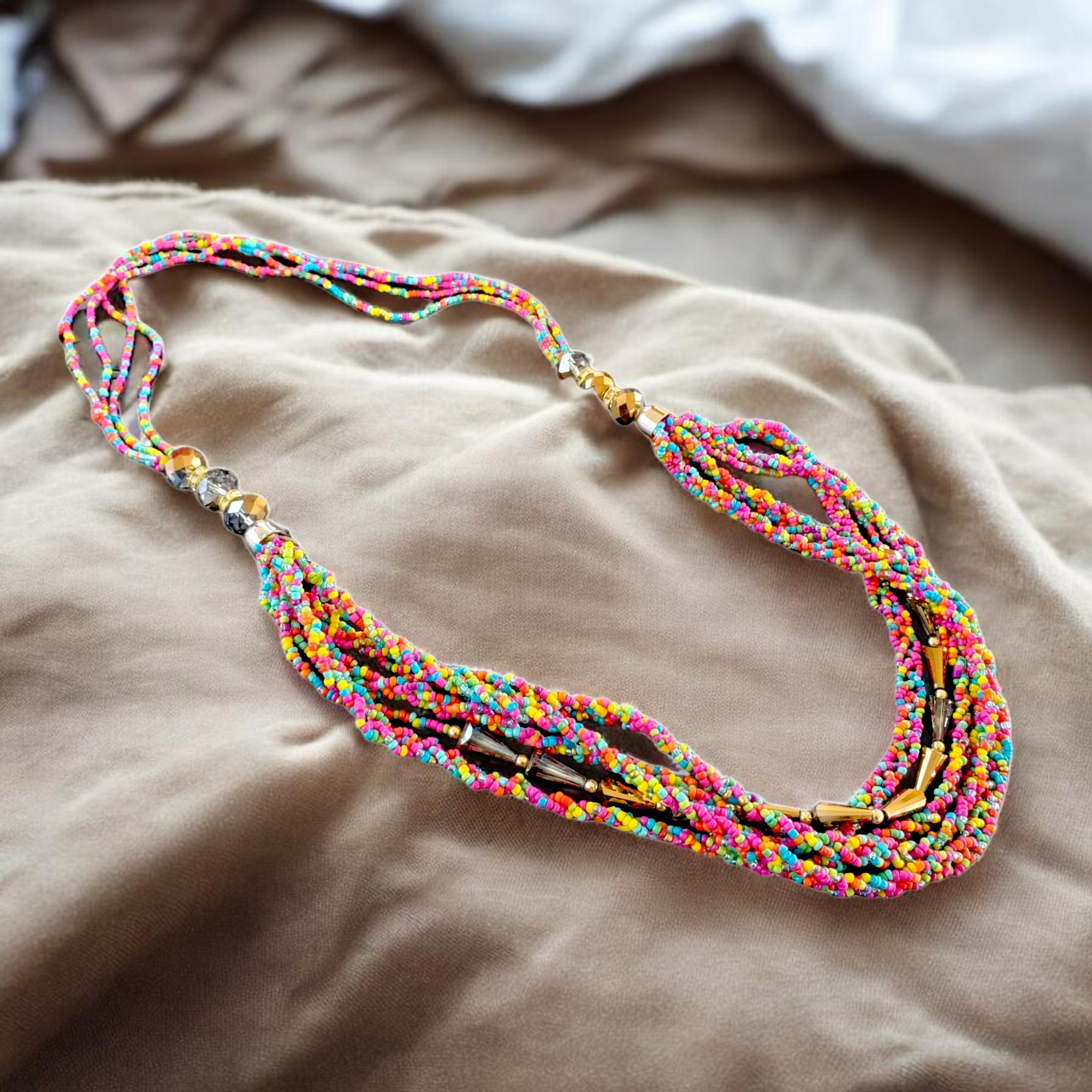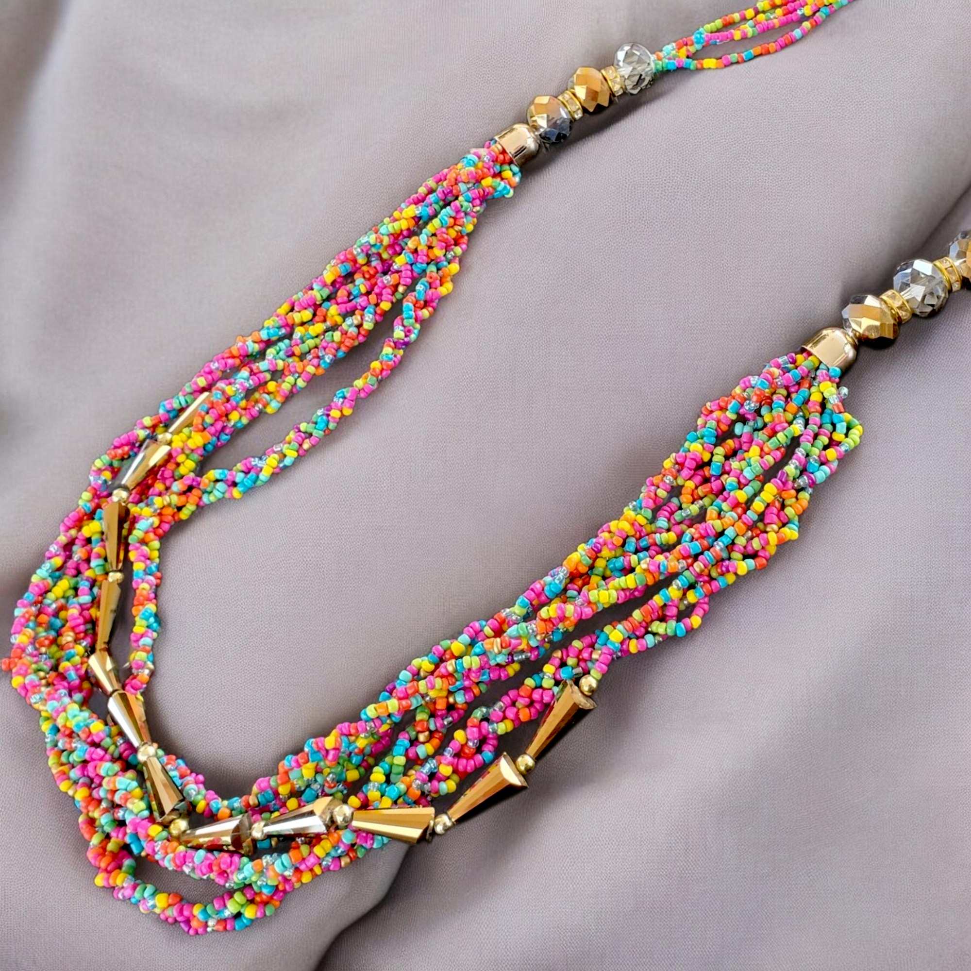 Colier de zi in culori vibrante, lung, sub decolteu.