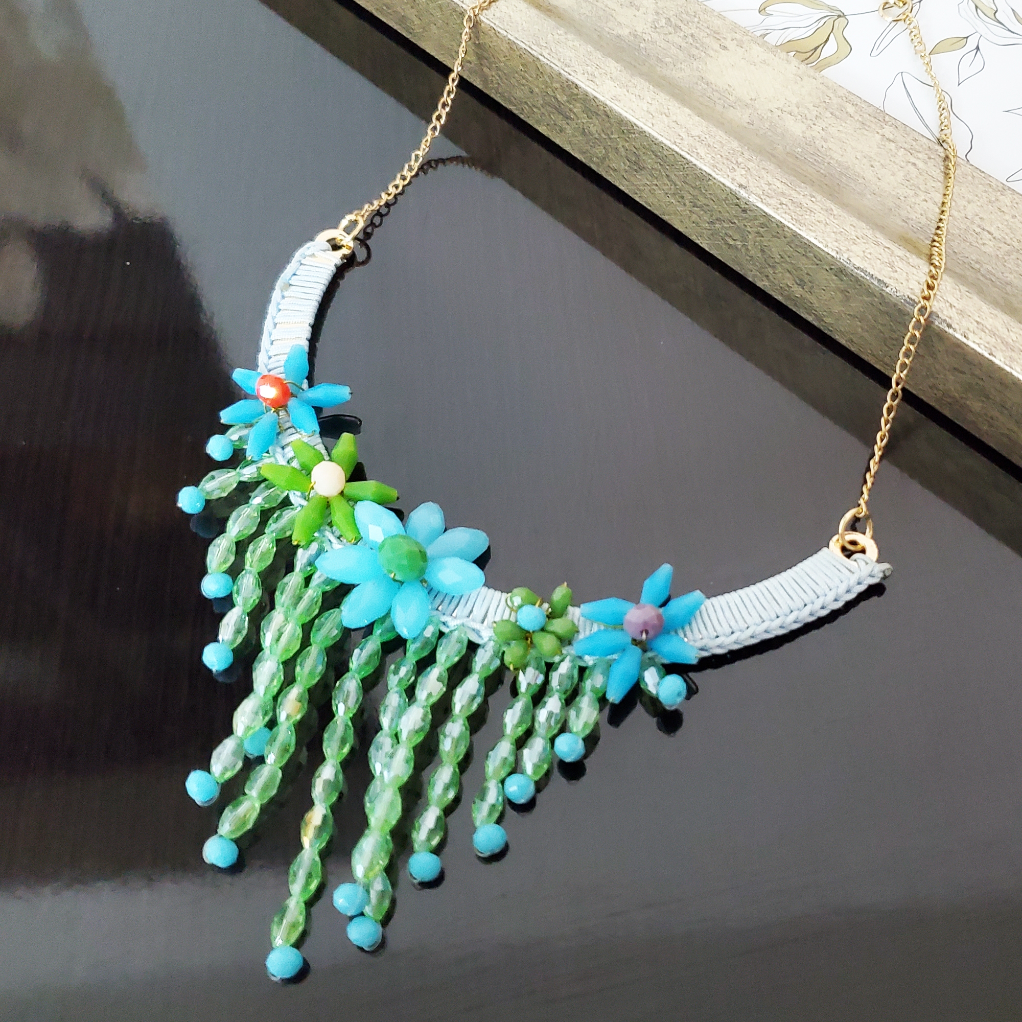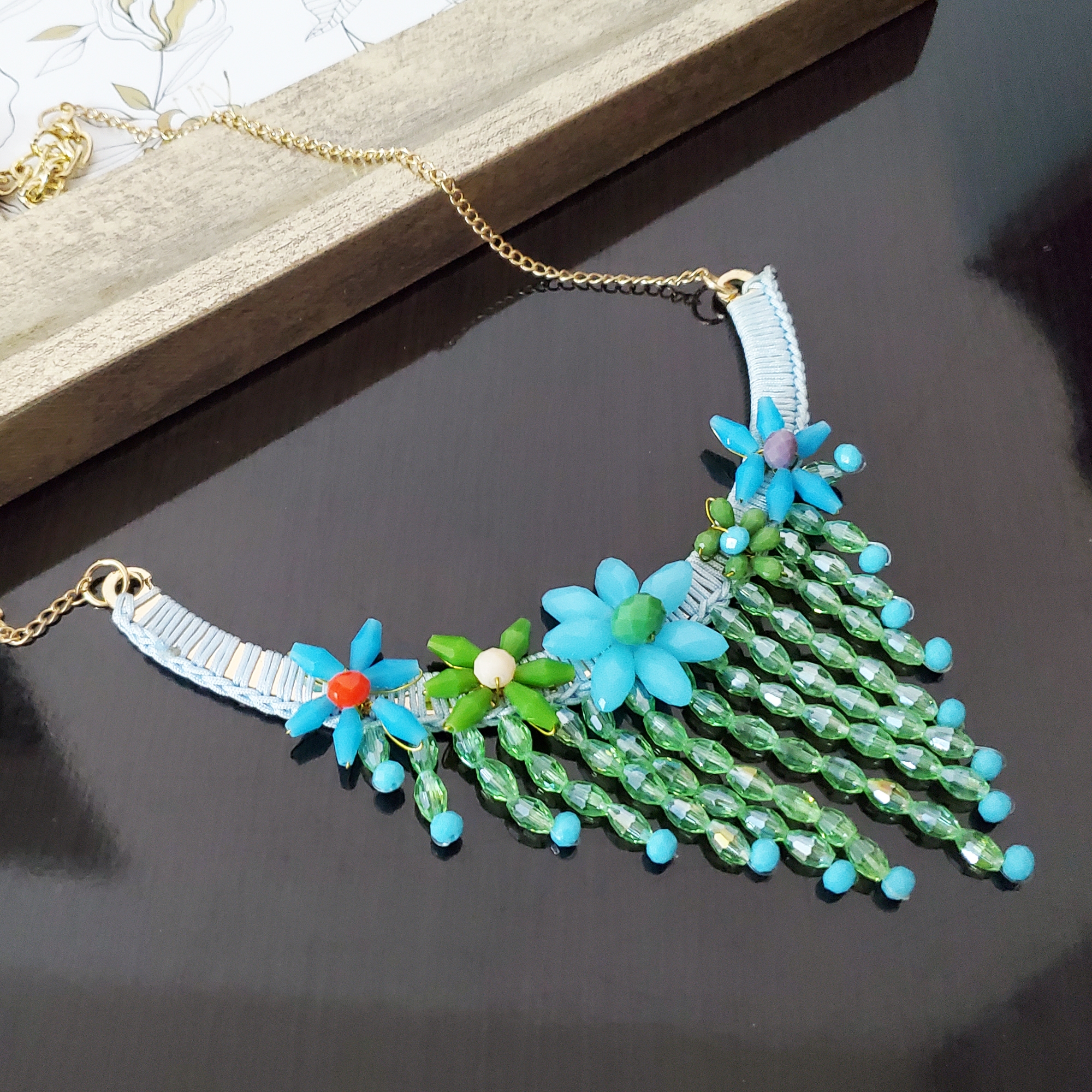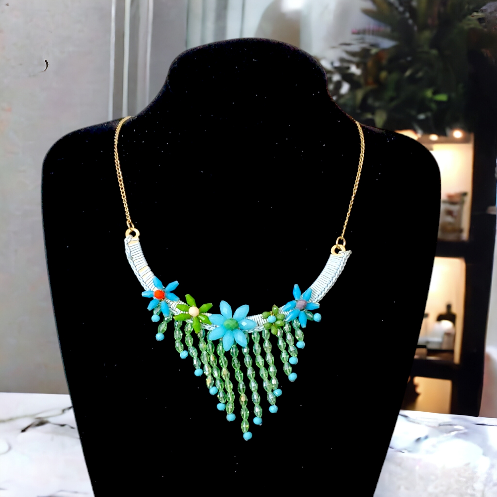 Colierul Nirvana Green aduce magie fiecărei ținute, cu macrame albastru și cristale verzi strălucitoare, cusute manual. Designul versatil și ajustabil transformă orice moment într-o poveste elegantă, fie la birou, fie la un eveniment special. Descoperă rafinamentul în fiecare detaliu!