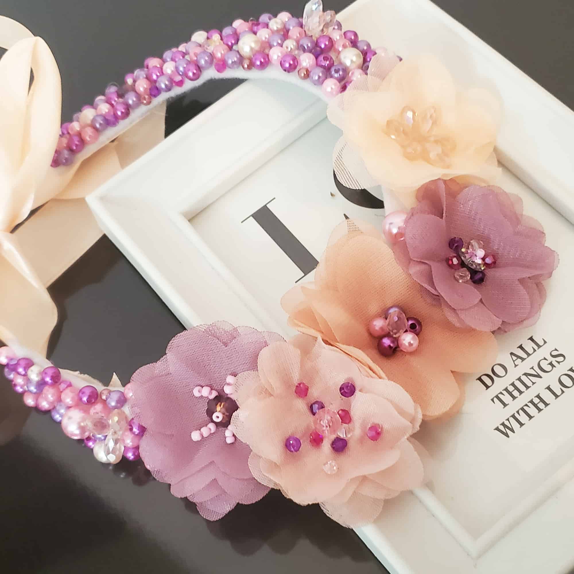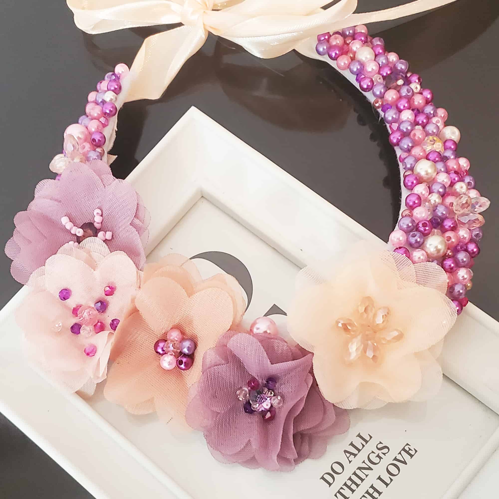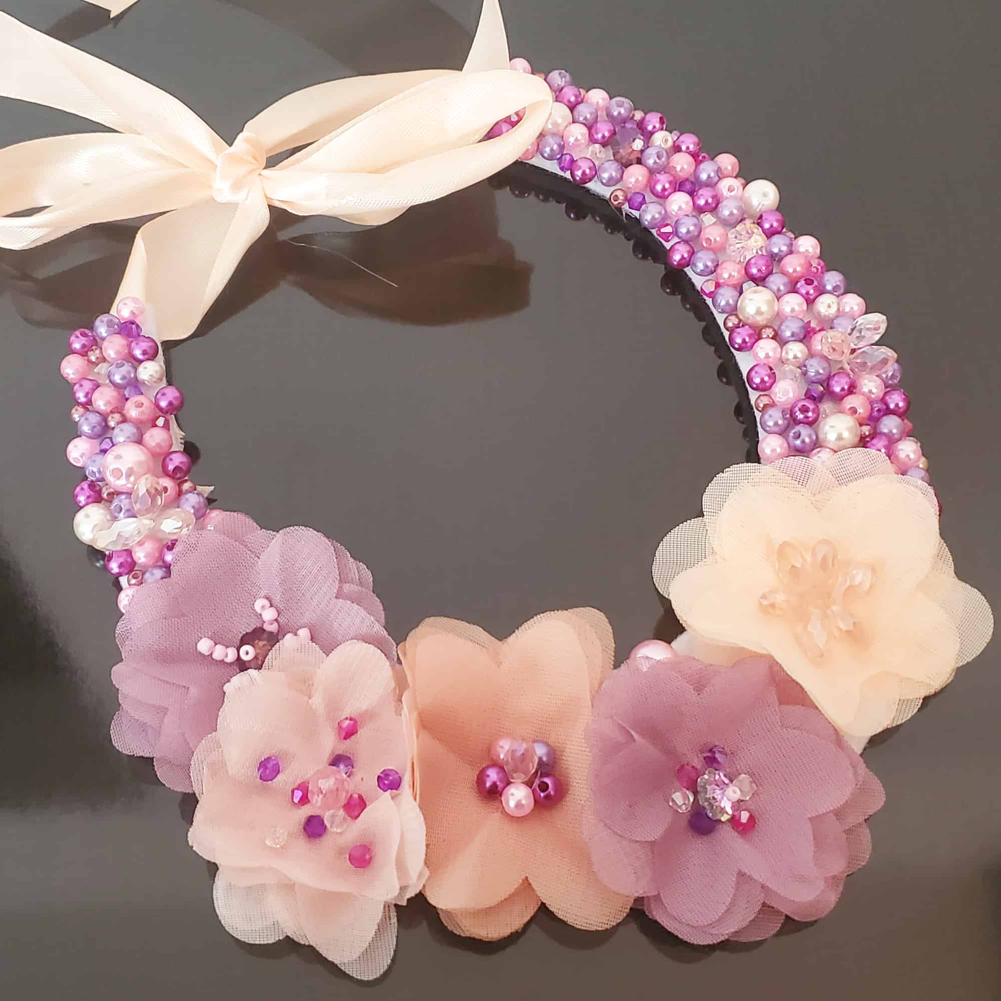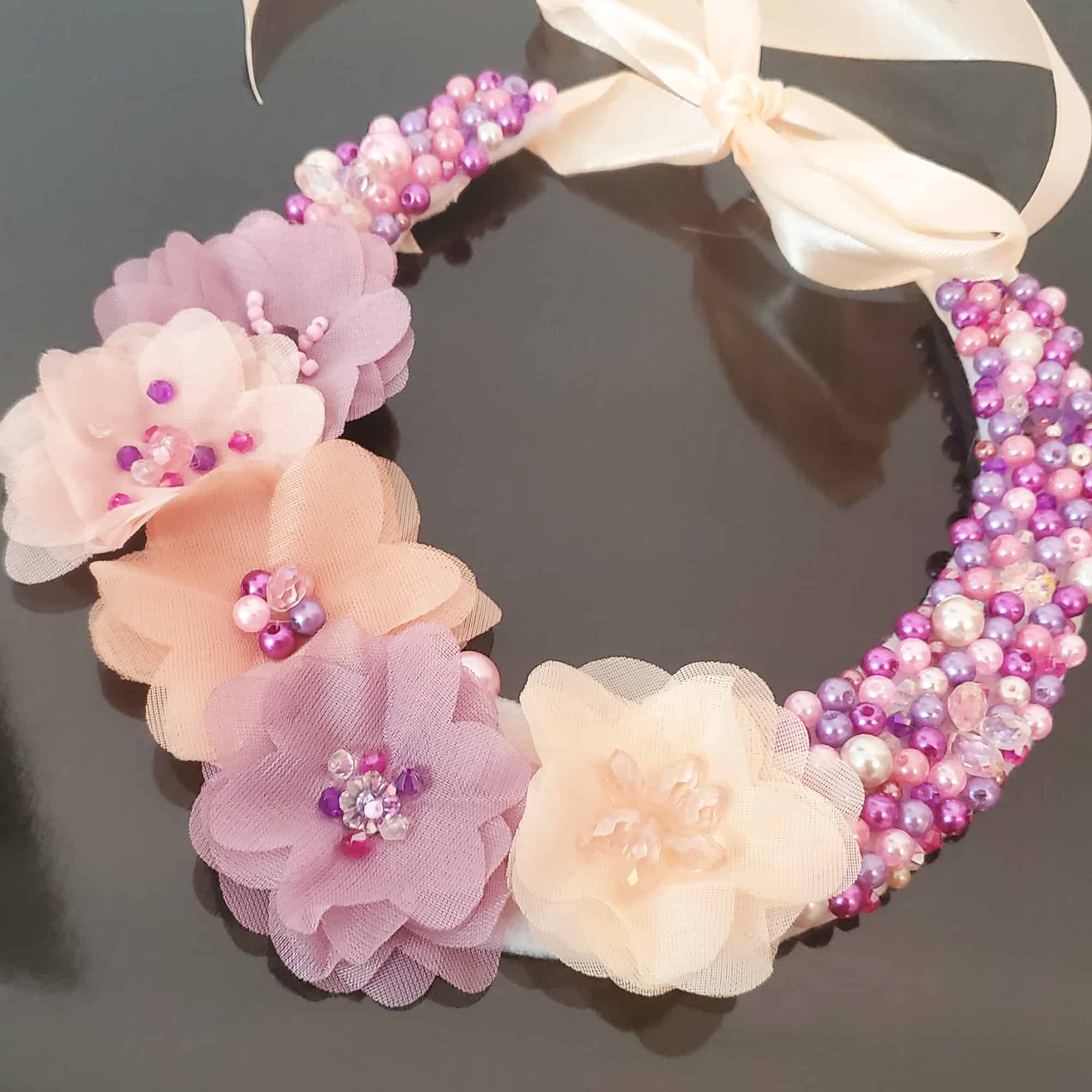 Descoperă farmecul colierului statement Candy: creat manual, unicat, cu cristale Preciosa roz și mov, perle delicate și flori din tule. Se așază perfect la baza gâtului și se leagă cu o fundă somon, pentru un look elegant sau office. Poartă povestea ta cu un accesoriu de neuitat!