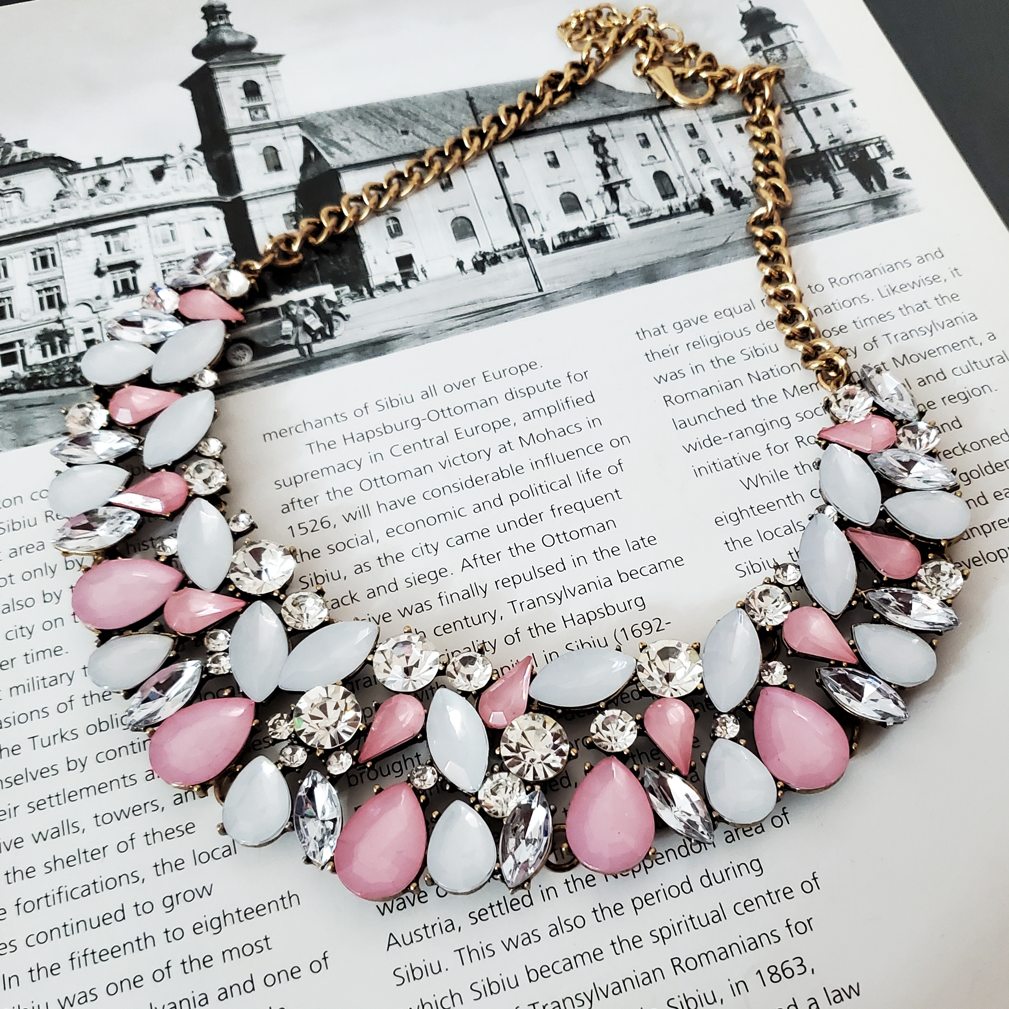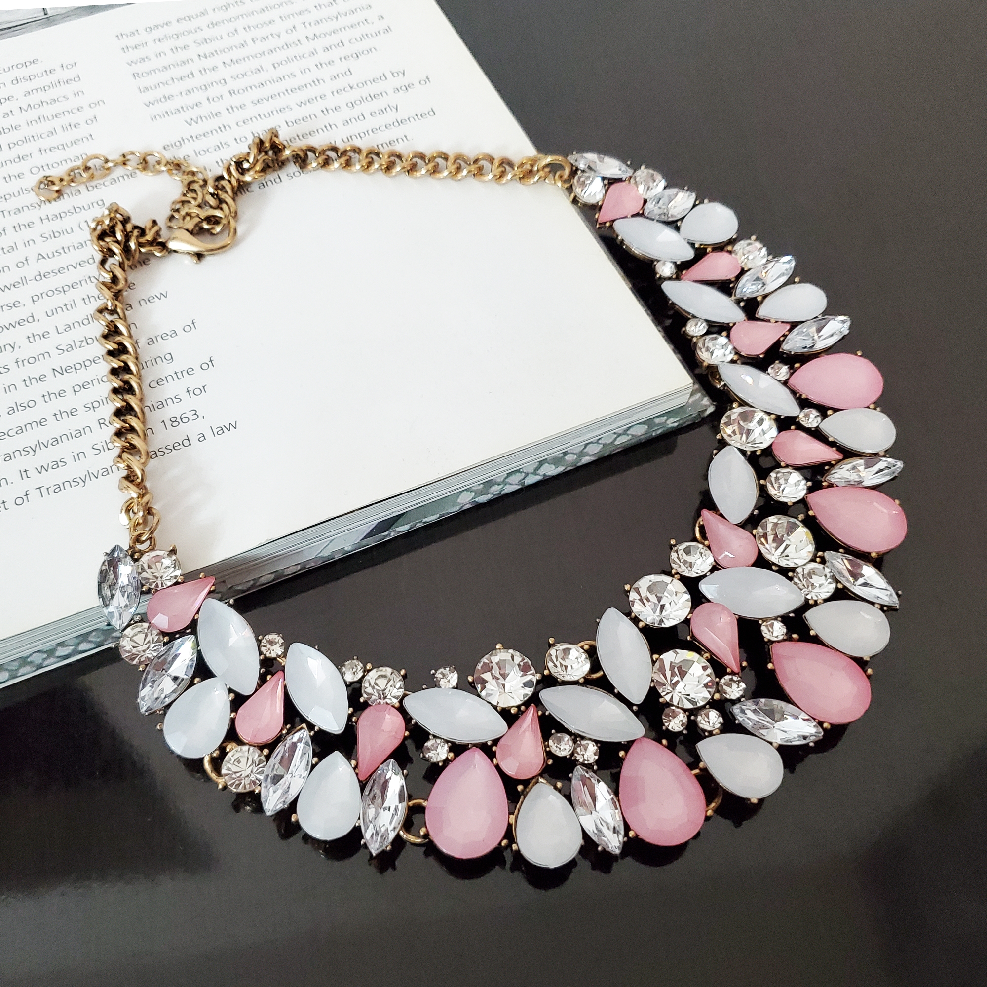 Colier statement metalic la baza gatului pe montura aurie. Pe colier sunt cristale de sticla albe, roz pudra si opal, astfel incat montura este acoperita complet. Se inchide la spate cu sistem metalic pe lant ajustabil. Este potrivit pentru tinute de ocazie, elegante. Se poate asorta cu alte accesorii atat din aur cat si din argint. Produs de serie, disponibil in mai multe culori. Se livreaza in sac textil pentru bijuterii