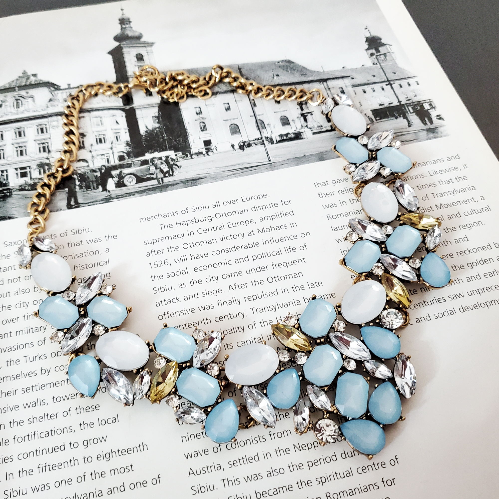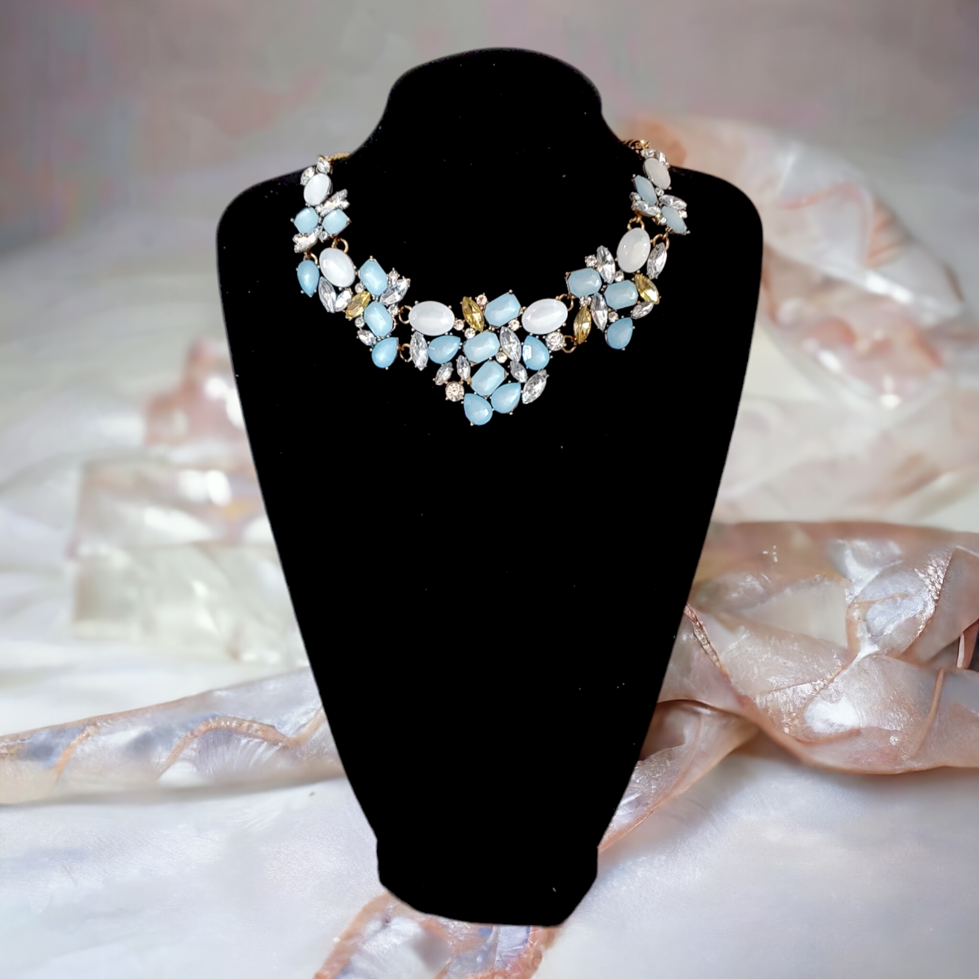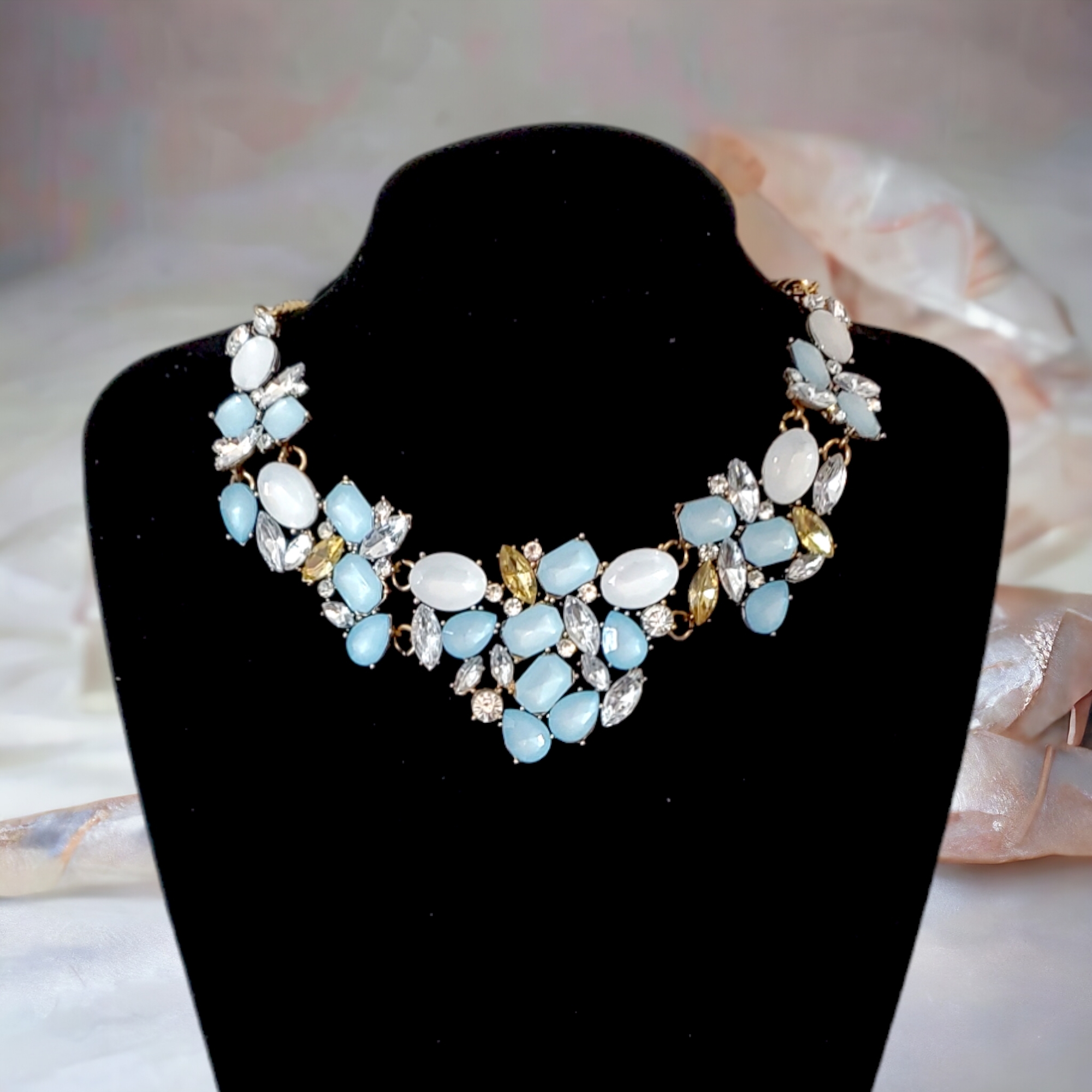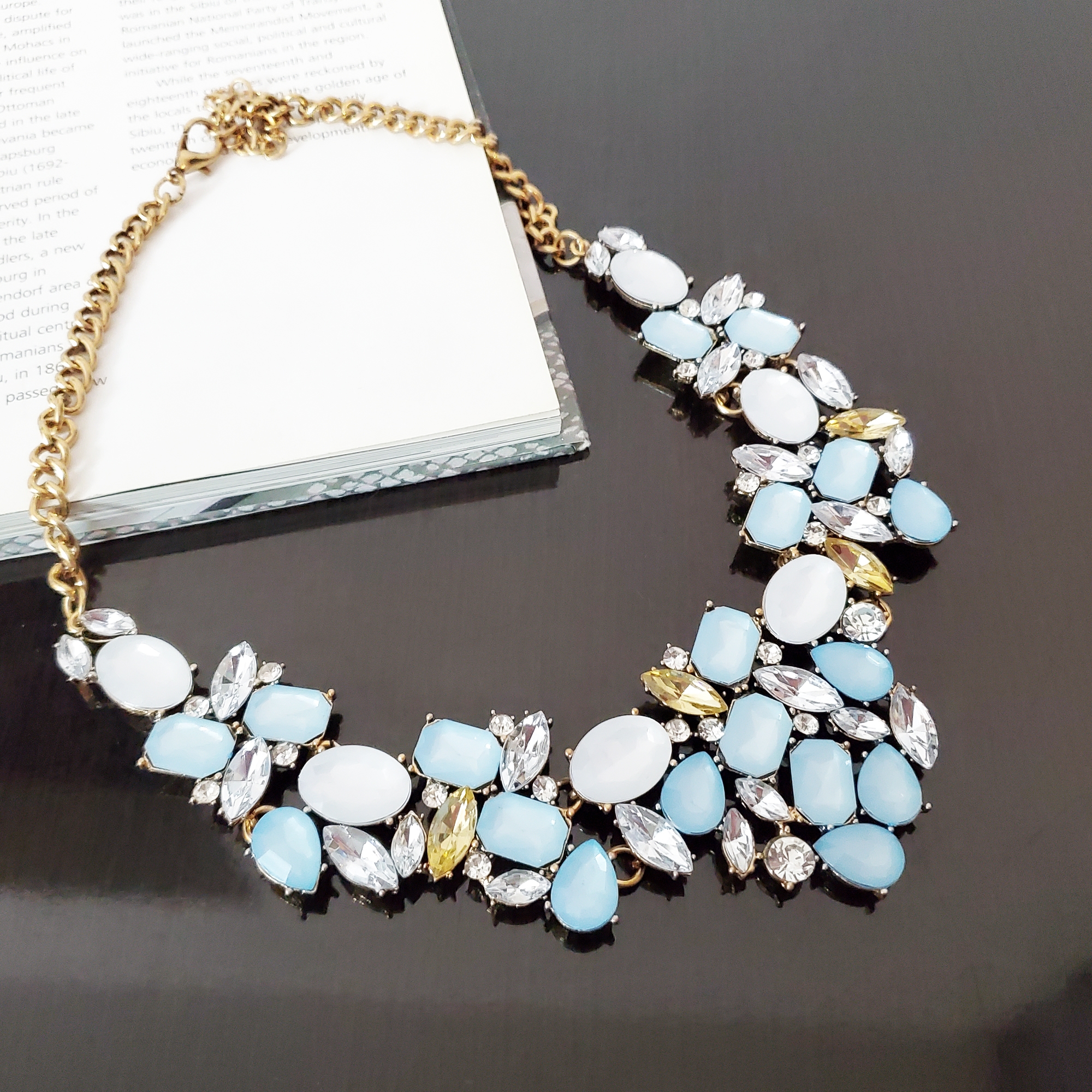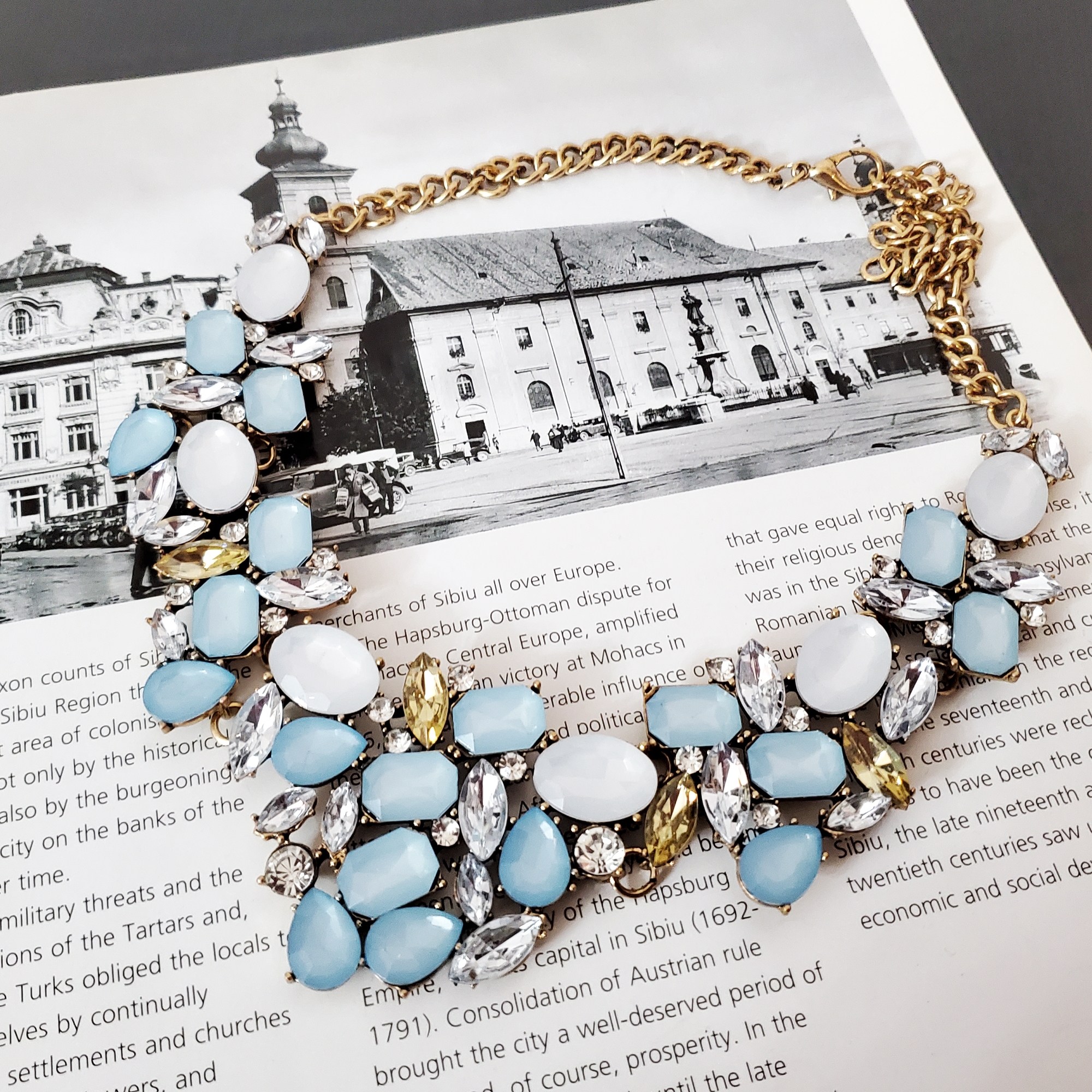Colier statement metalic la baza gatului pe montura aurie. Pe colier sunt cristale de sticla albe opal, albastre opal si alb argintiu de diferite forme si marimi, astfel incat montura este acoperita complet. Se inchide la spate cu sistem metalic pe lant ajustabil. Este potrivit pentru tinute de ocazie, elegante. Se poate asorta cu alte accesorii atat din aur cat si din argint. Produs de serie, disponibil in mai multe culori. Se livreaza in sac textil pentru bijuterii